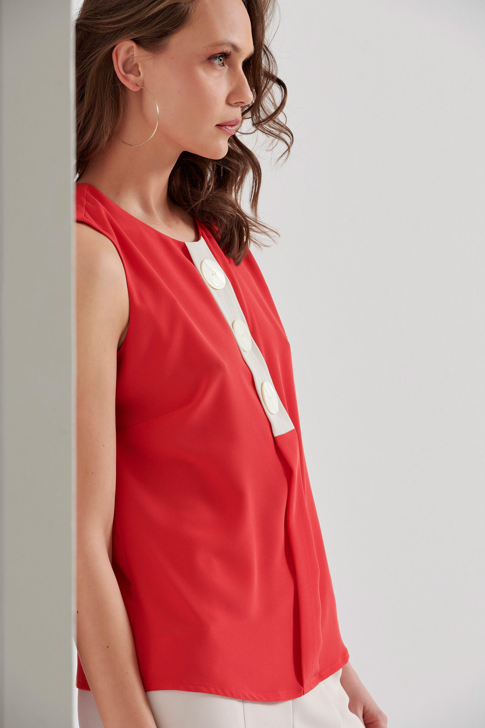 Αμάνικη μπλούζα Κωδικός 10-030828-0 Περιγραφή Μπλούζα αμάνικη με φάσα σε αντίθεση χρώματος και διακοσμητικά κουμπιά.Κλείσιμο με κουμπί στο πίσω μέρος. Σύνθεση 100% polyester