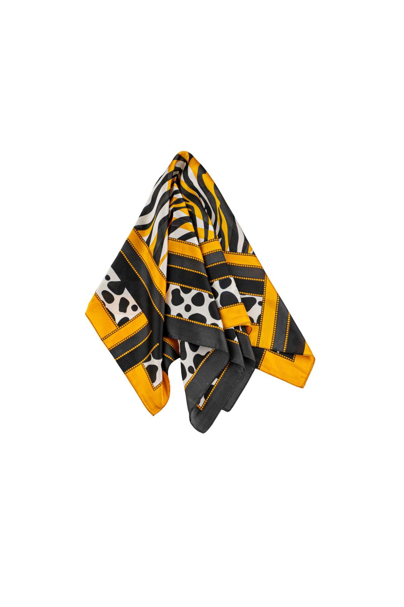 Εντυπωσιακό φουλάρι που συνδυάζει animal print μοτίβα με γεωμετρικά σχέδια. Η απαλή υφή του και ο ξεχωριστός συνδυασμός σχεδίων το καθιστούν ιδανικό για να δώσει δυναμικό και κομψό χαρακτήρα σε κάθε εμφάνιση.