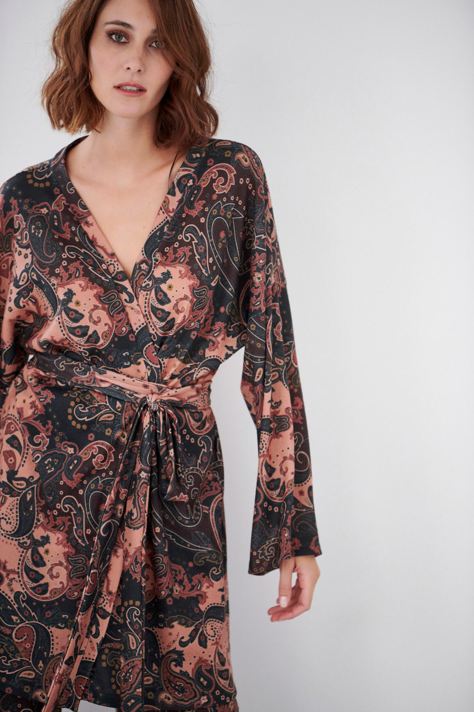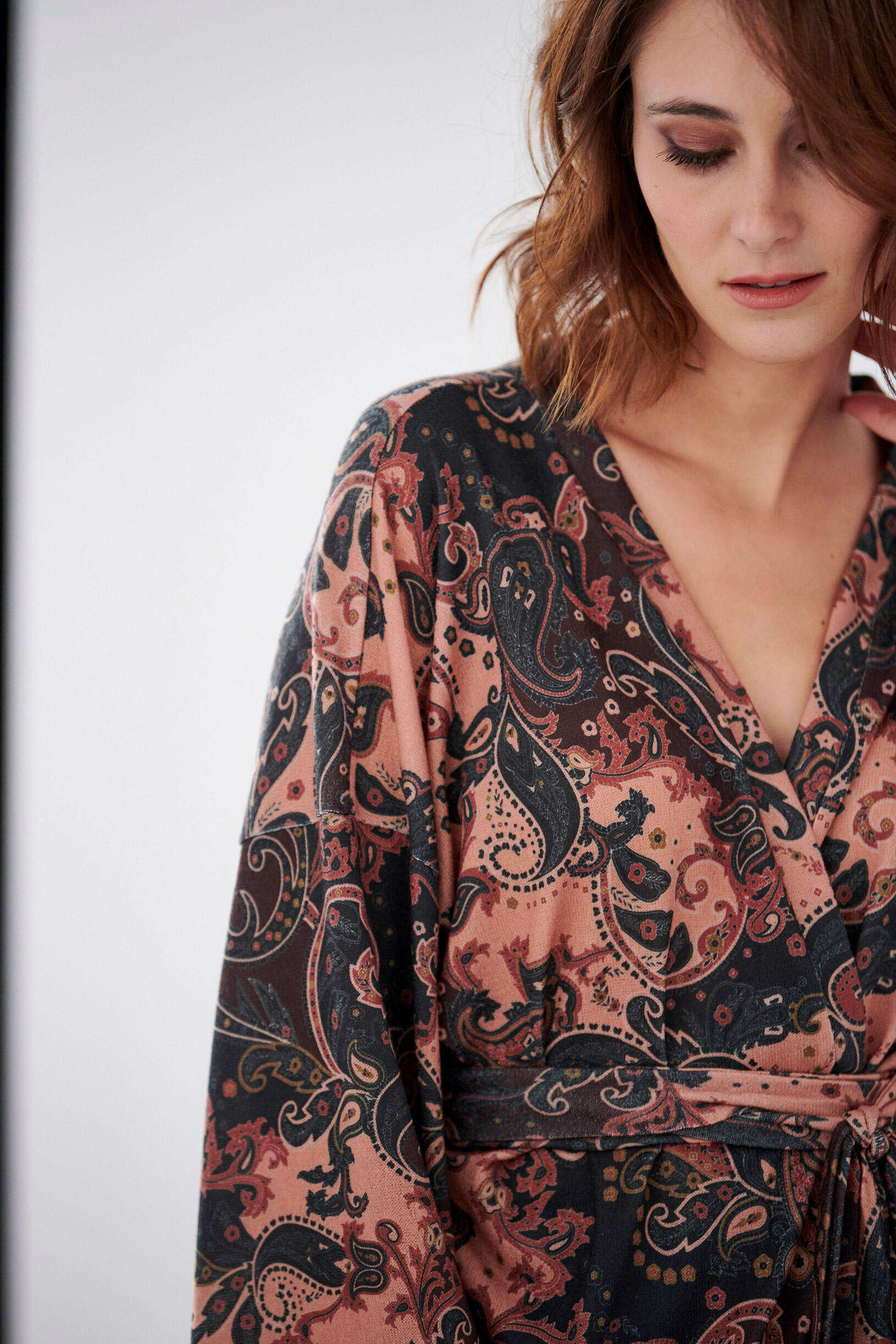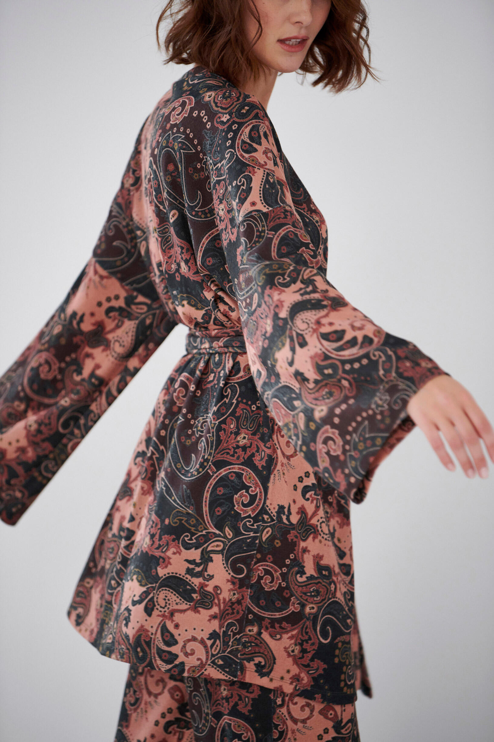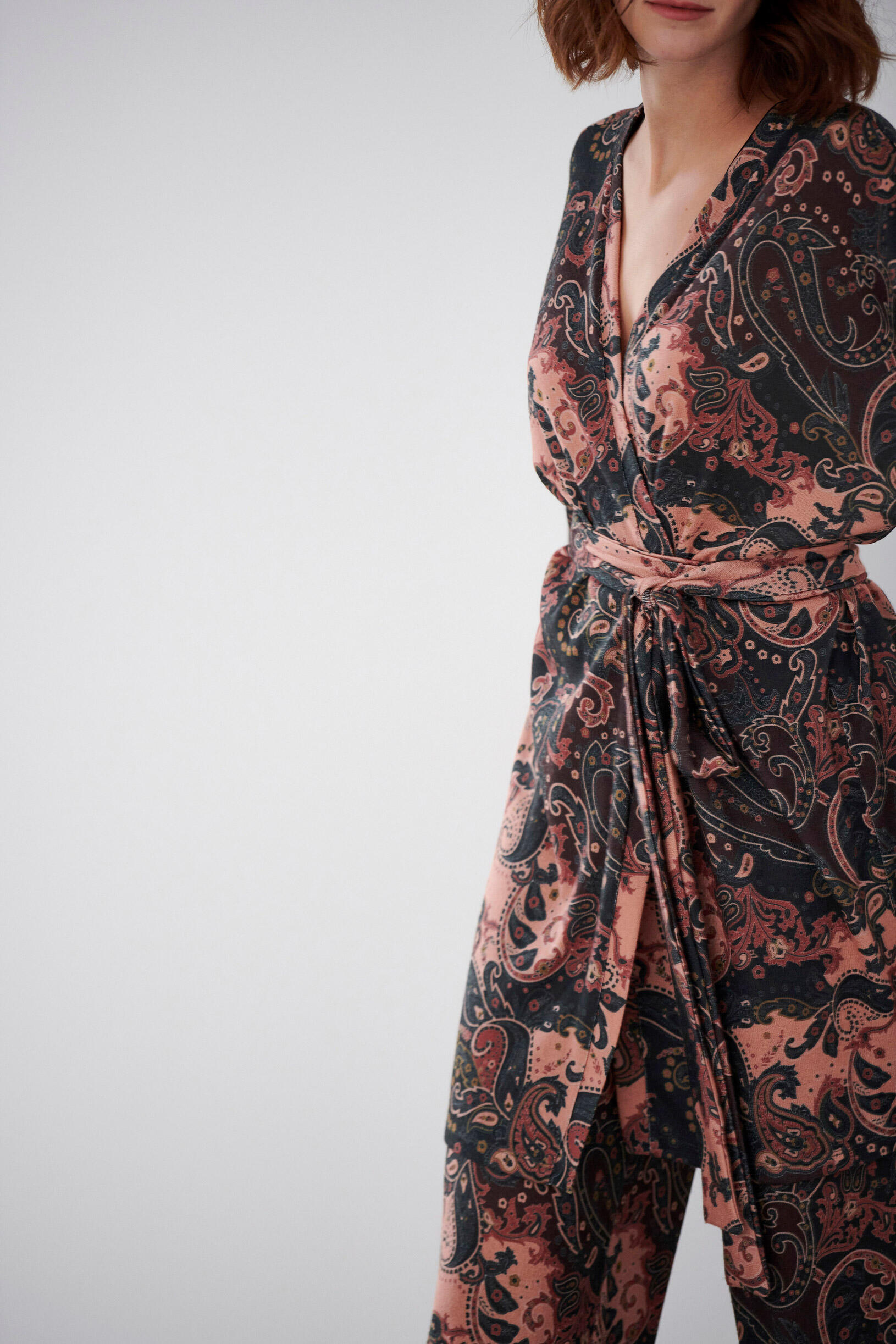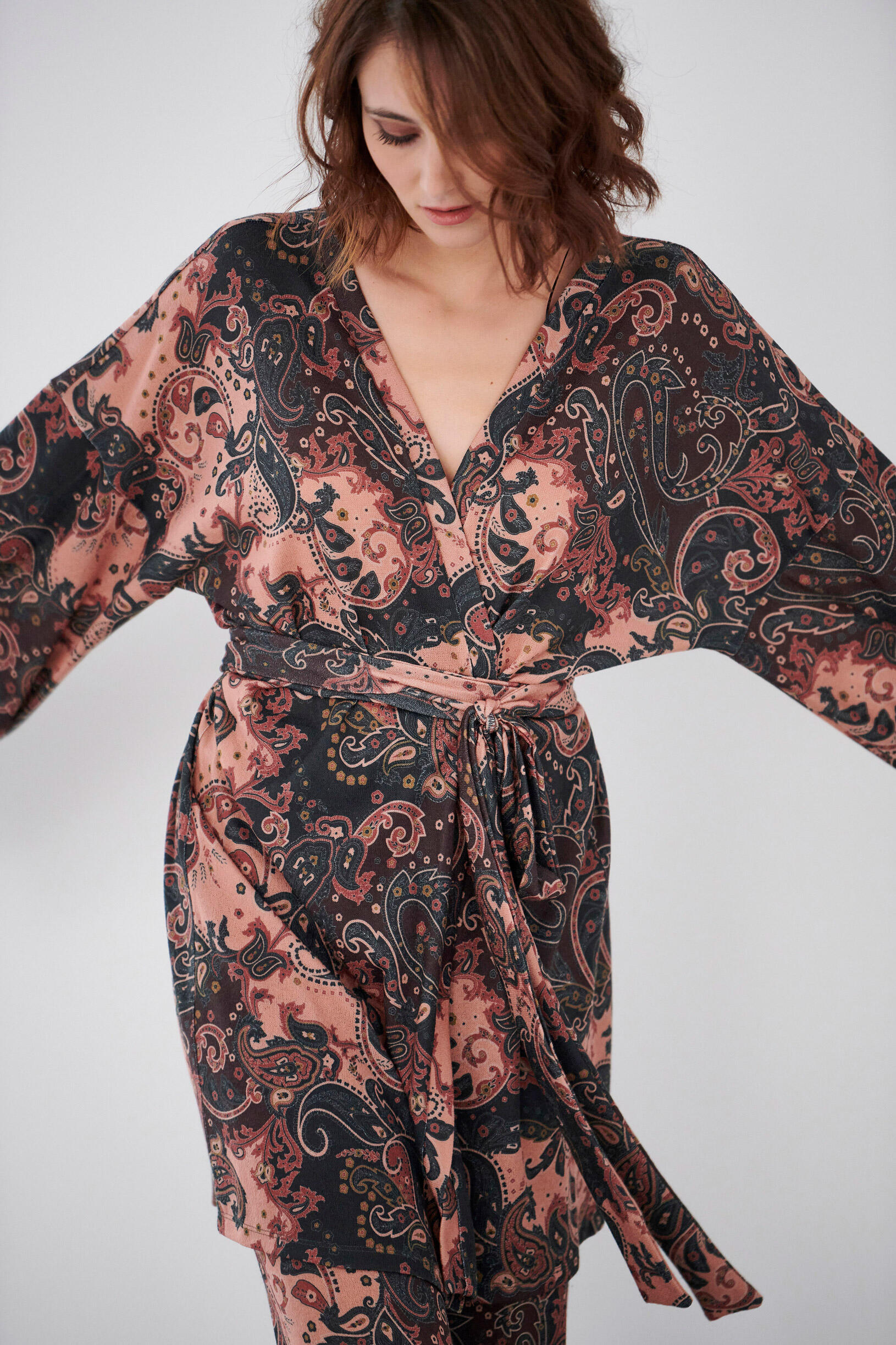 Εμπριμέ κιμονό Κωδικός 20-340858-0 Περιγραφή Κιμονό σε λεπτή πλέξη με αποσπώμενη ζώνη ίδιου υφάσματος.Μπορεί να συνδυαστεί με την παντελόνα 20-340857-0. Σύνθεση 96% polyester 4% elastane