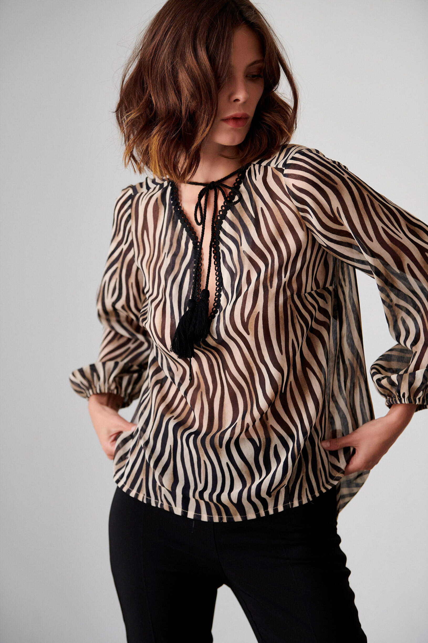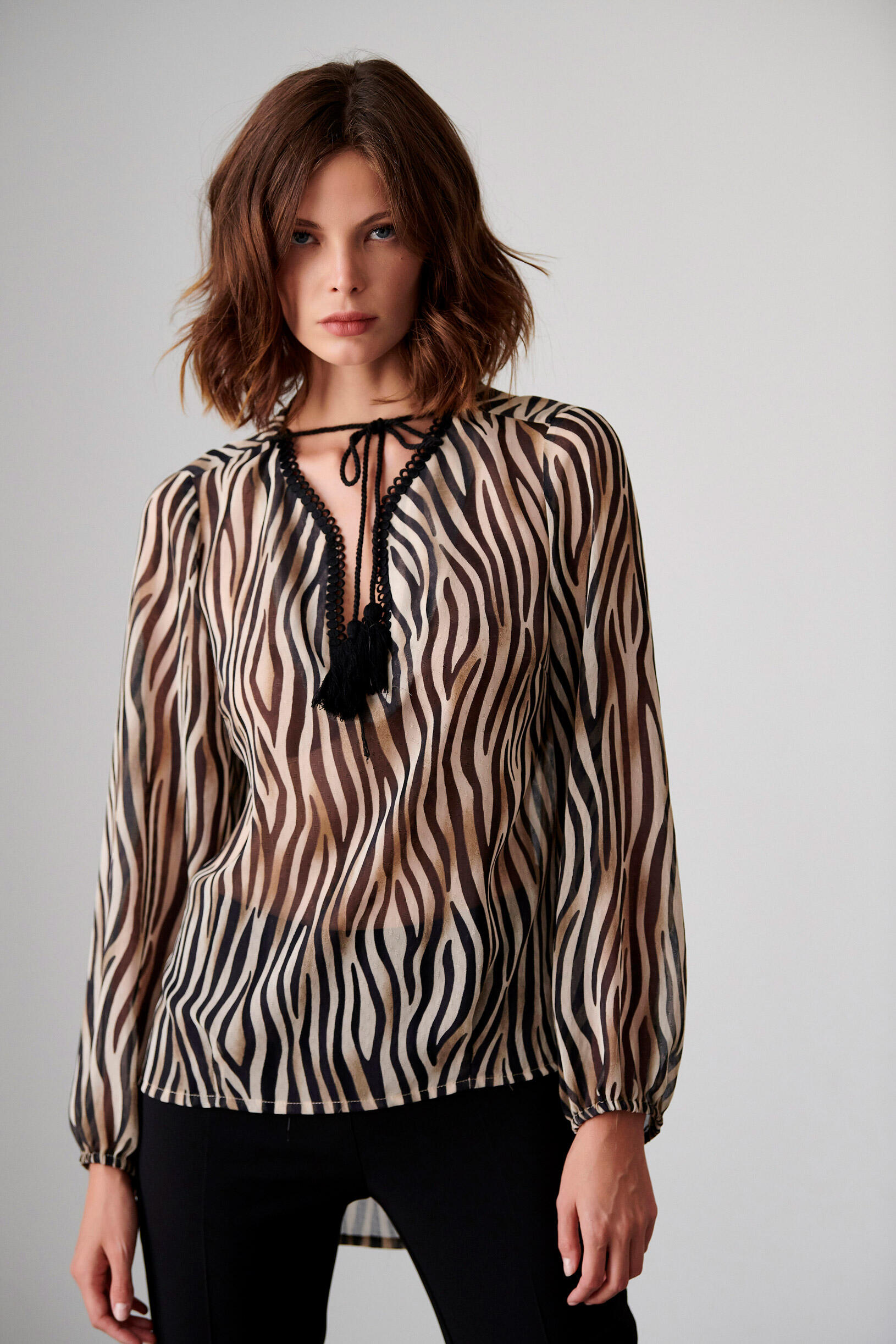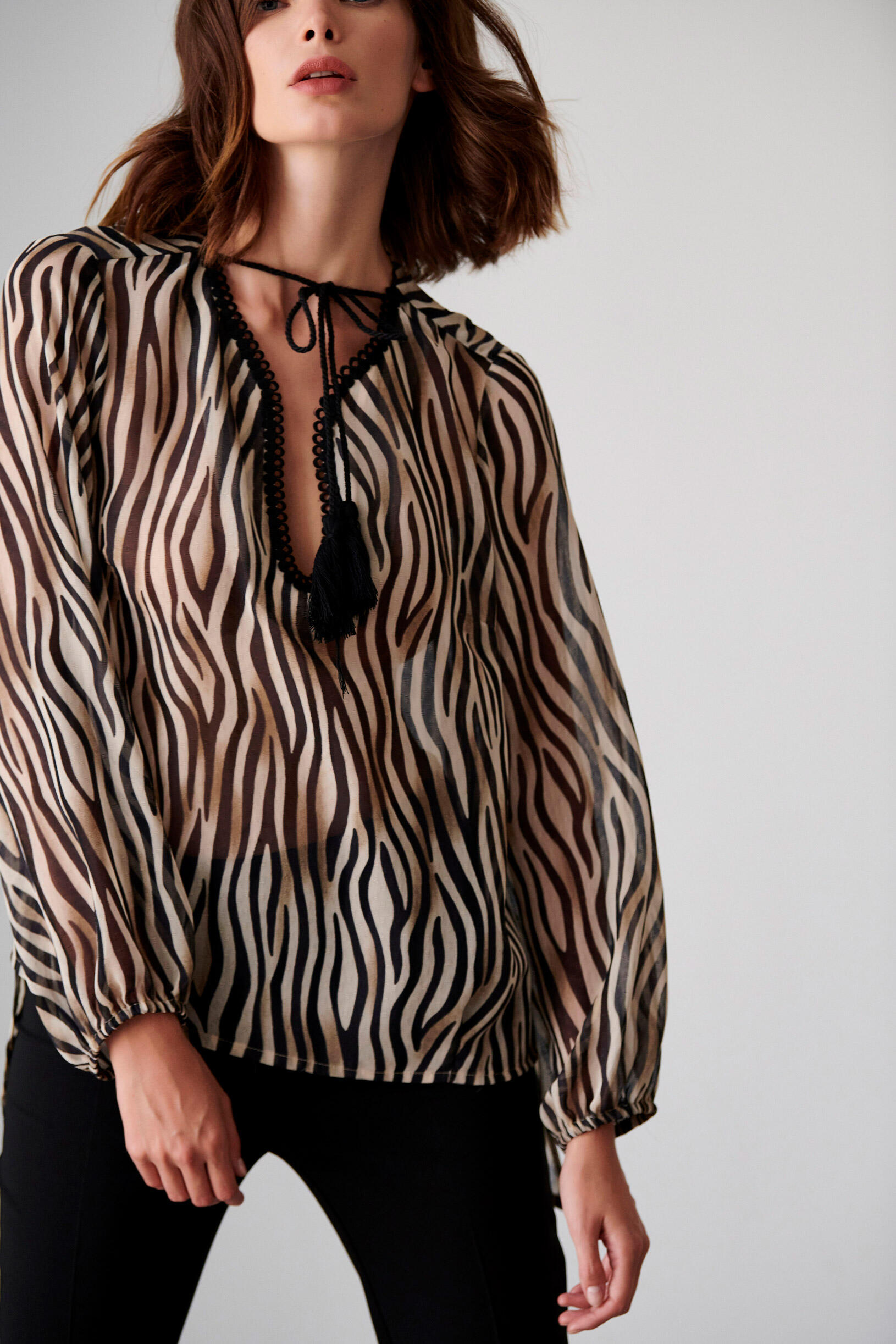 Εμπριμέ μπλούζα Κωδικός 10-341691-0 Περιγραφή Μπλούζα με λαιμόκοψη σε σχήμα V και φάσα,δέσιμο με κορδόνι και φούντες και ασύμμετρο τελείωμα. Σύνθεση 100% polyester
