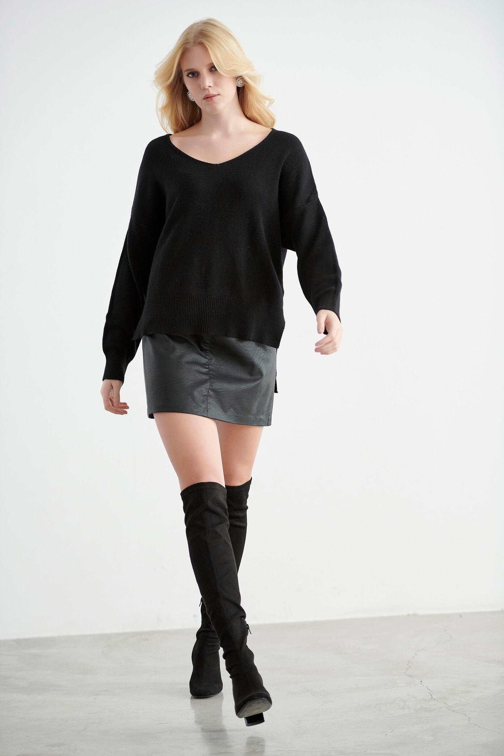 Knitted blouse with V neckline. It has a clear asymmetry with a longer back, rip details on the cuffs and the finish and a small tear on the side. Choose it for stylish everyday looks.