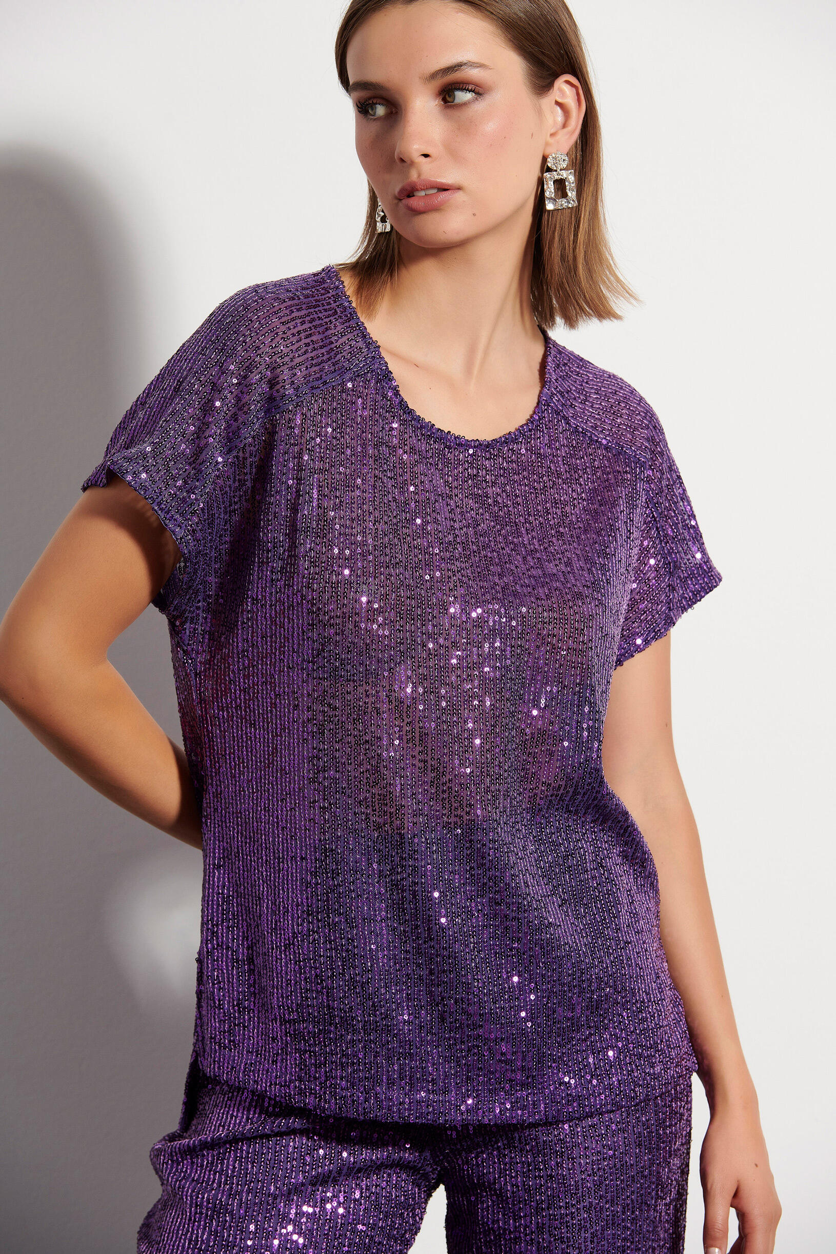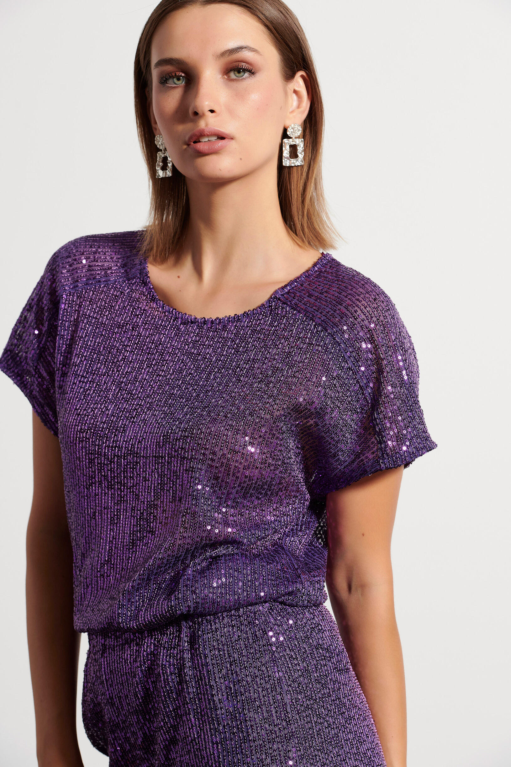 Blouse with sequins SKU 10-370053-0 Description Short sleeve blouse with sequins and round neck. Combine it with the 10-370052-0 trousers for an impressive look. Synthesis 95% polyester 5% spandex