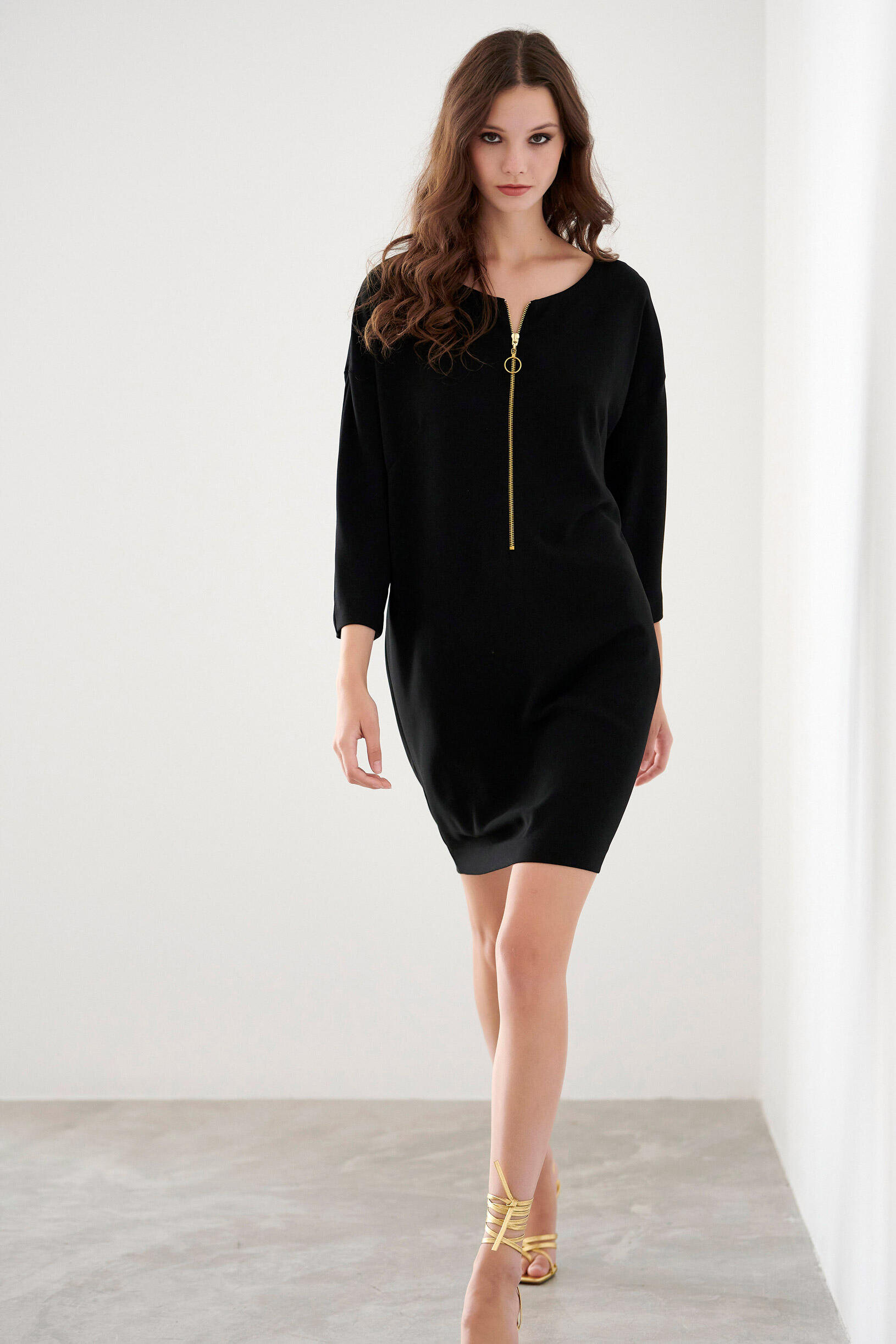 Dress with zipper on the front SKU 10-030783-0 Description Dress with 3/4 sleeves, opening zipper at the front and round neckline. Synthesis 100% polyester