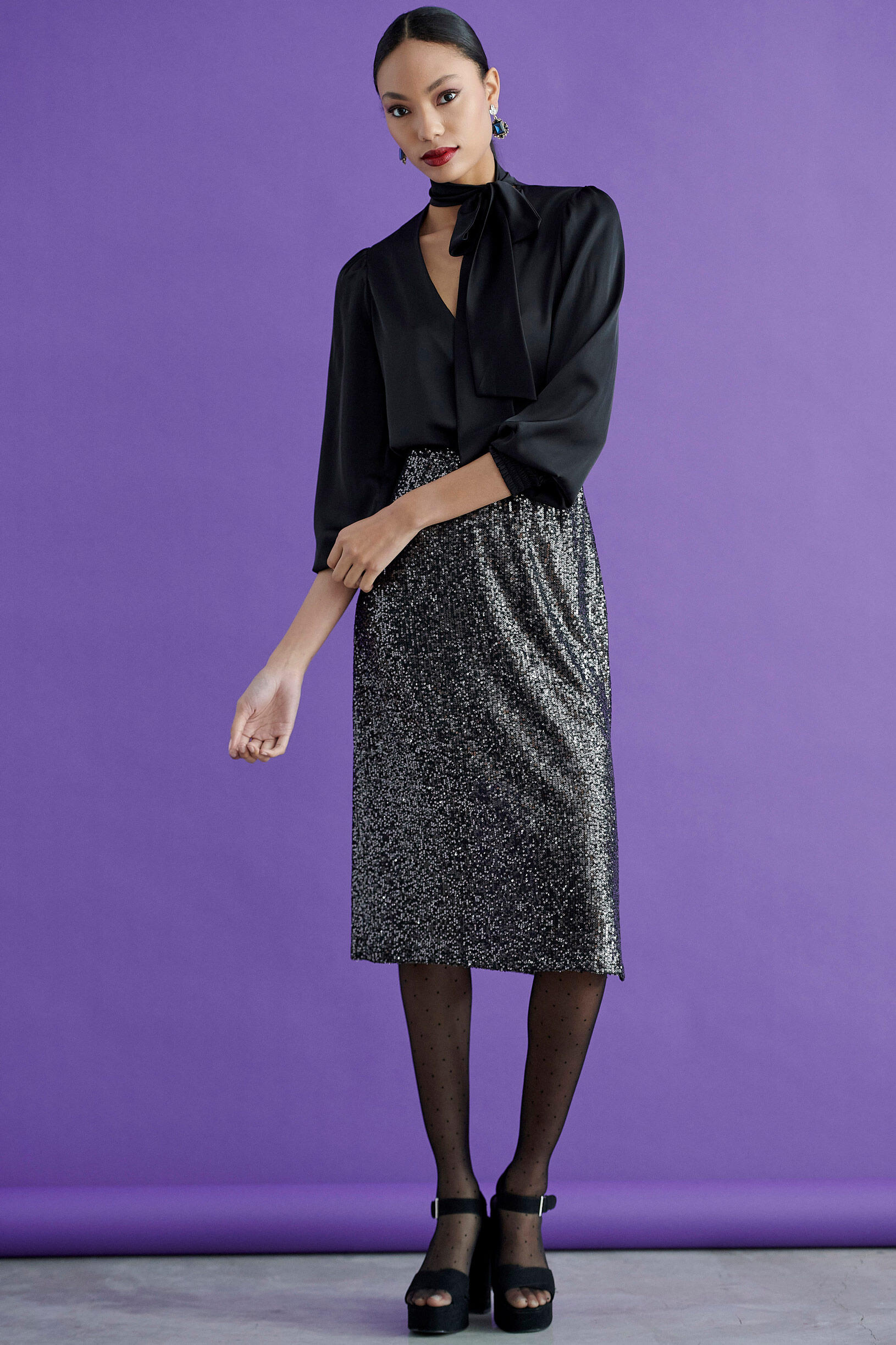 Midi skirt with sequins and tearing at the side. It has elastic in the middle and lining inside for a better fit. Perfect choice for an impressive night out.