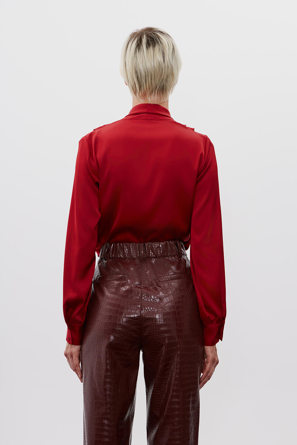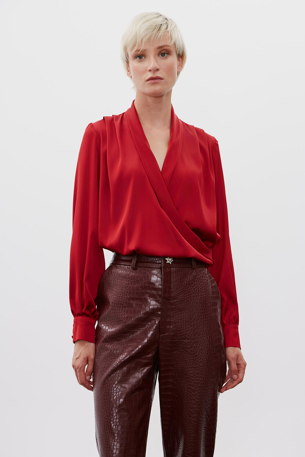 Satin blouse SKU 10-050425-0 Description Blouse with crotch neckline, satin texture with buttons at the end of the sleeve. Synthesis 95% polyester 5% spandex