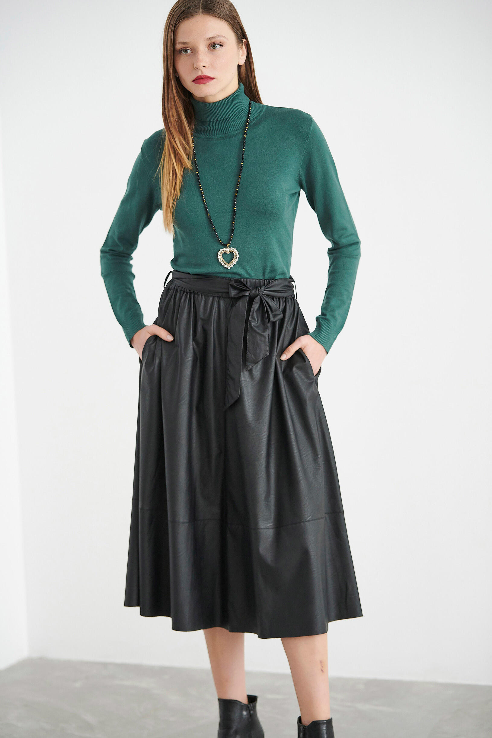 Clos skirt SKU 10-010132-0 Description Skirt with elastic in the middle in leather texture stylized with detachable belt in the same type. It has external side pockets. Synthesis 100% polyurethane