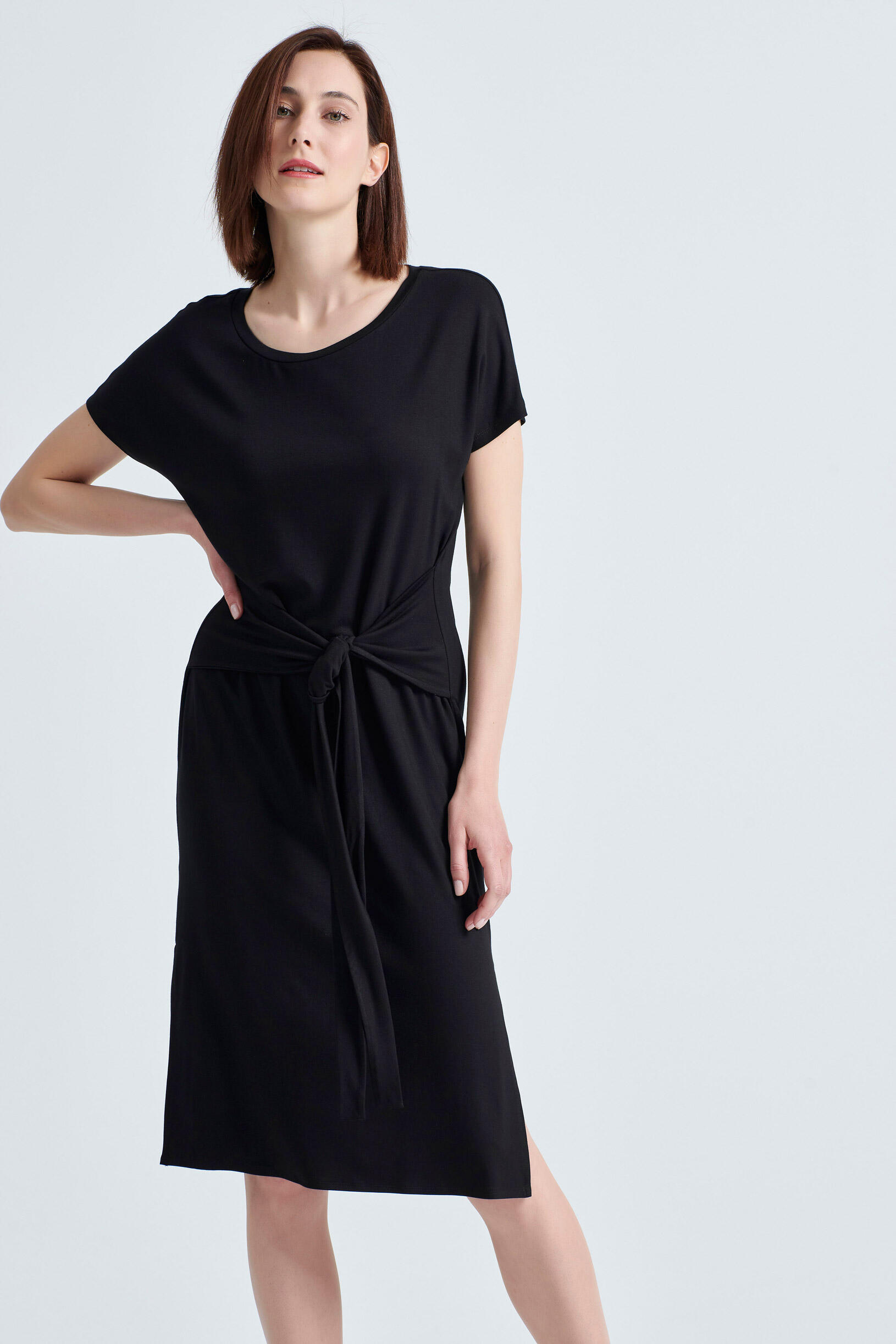 Dress with belt SKU 10-120530-0 Description Short-sleeved dress, belt of the same fabric with two ways of tying and side openings. Synthesis 93% bamboo 7% spandex