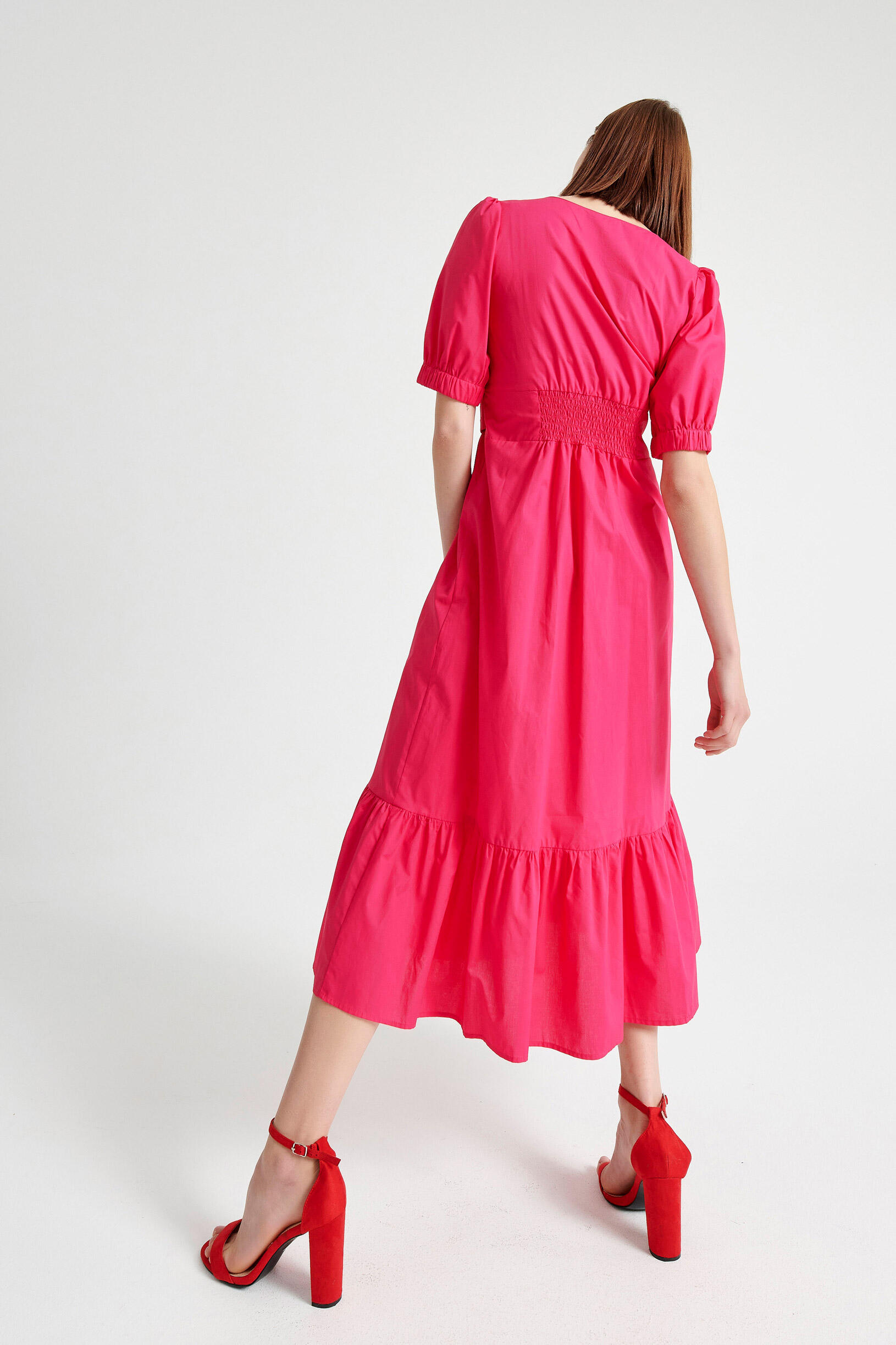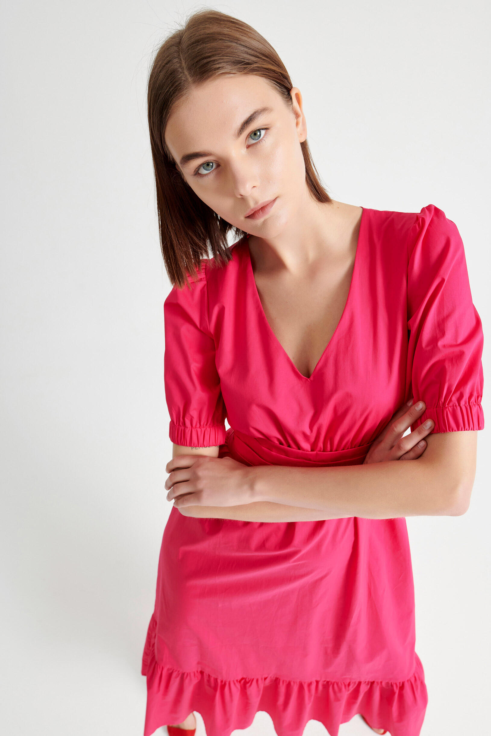 Dress with ruffles at the end SKU 10-180199-0 Description Long cotton dress with short sleeves and elastic at the end, V-shaped neckline, zipper closure on the side. Synthesis 100% cotton