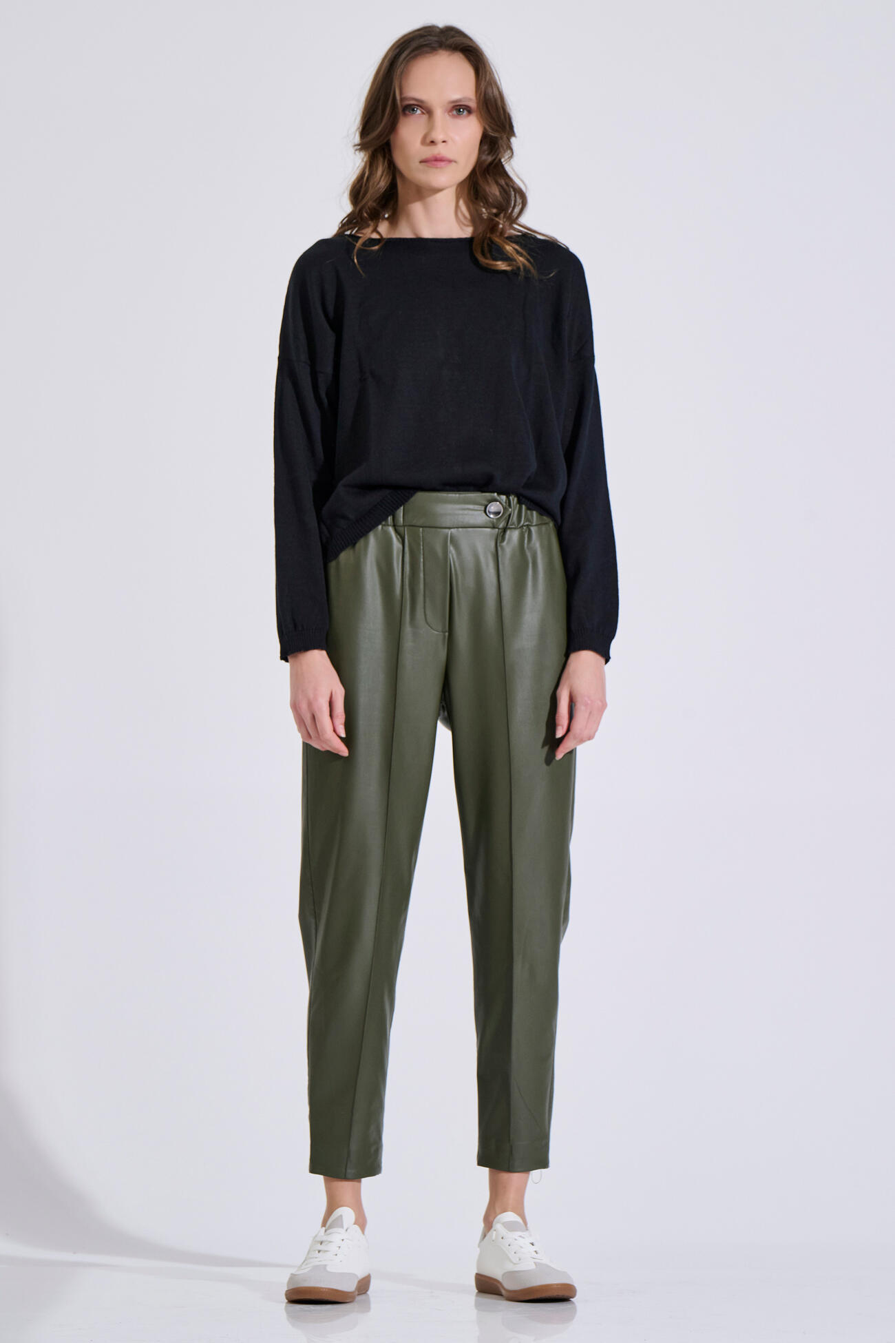 Faux leather trousers in a modern silhouette with an elasticated waistband for a comfortable fit. Featuring side pockets and subtle front seam details.