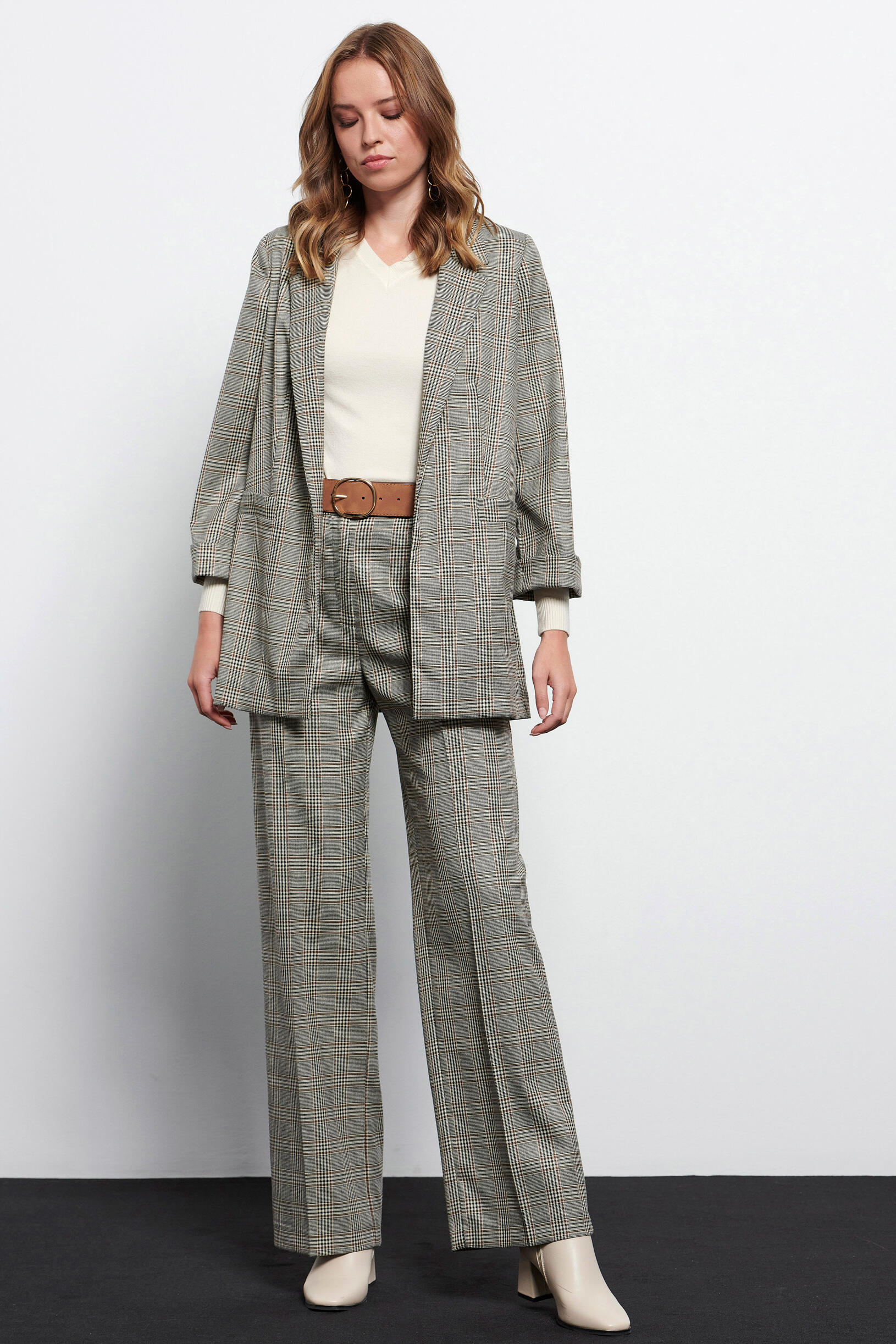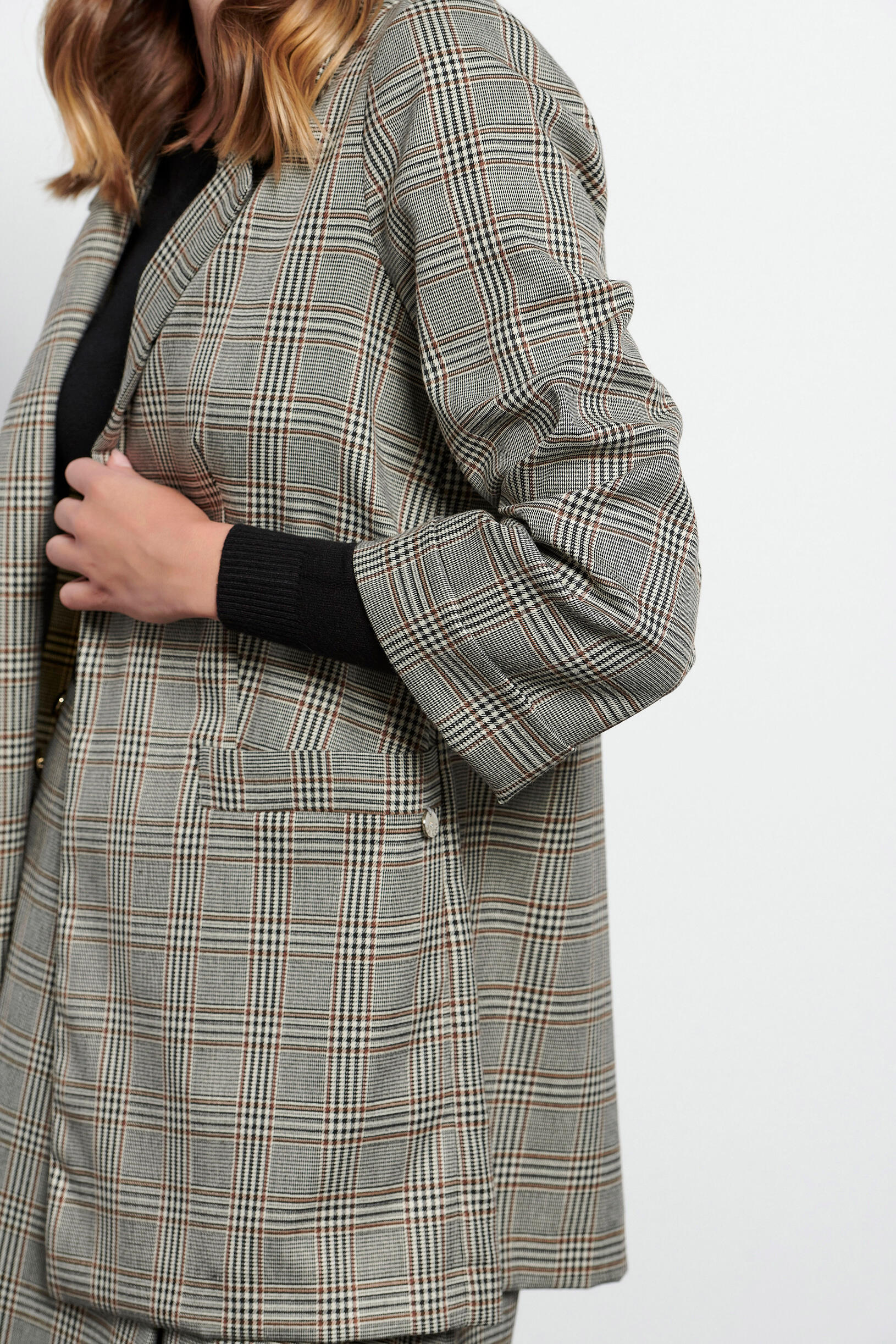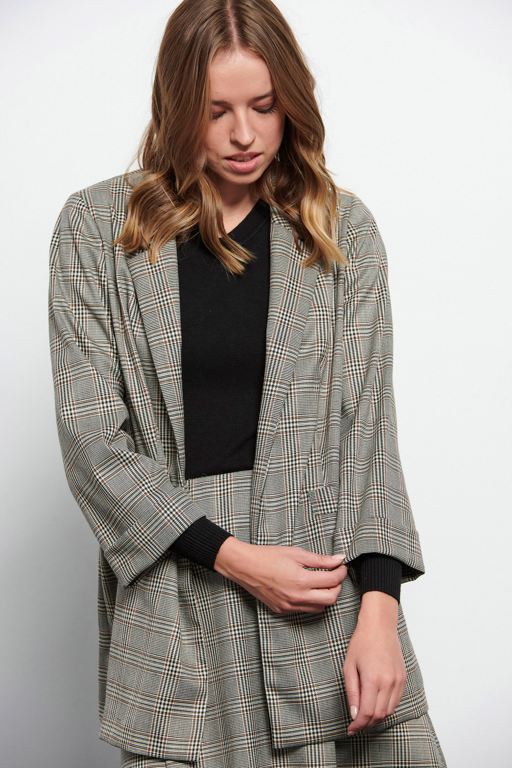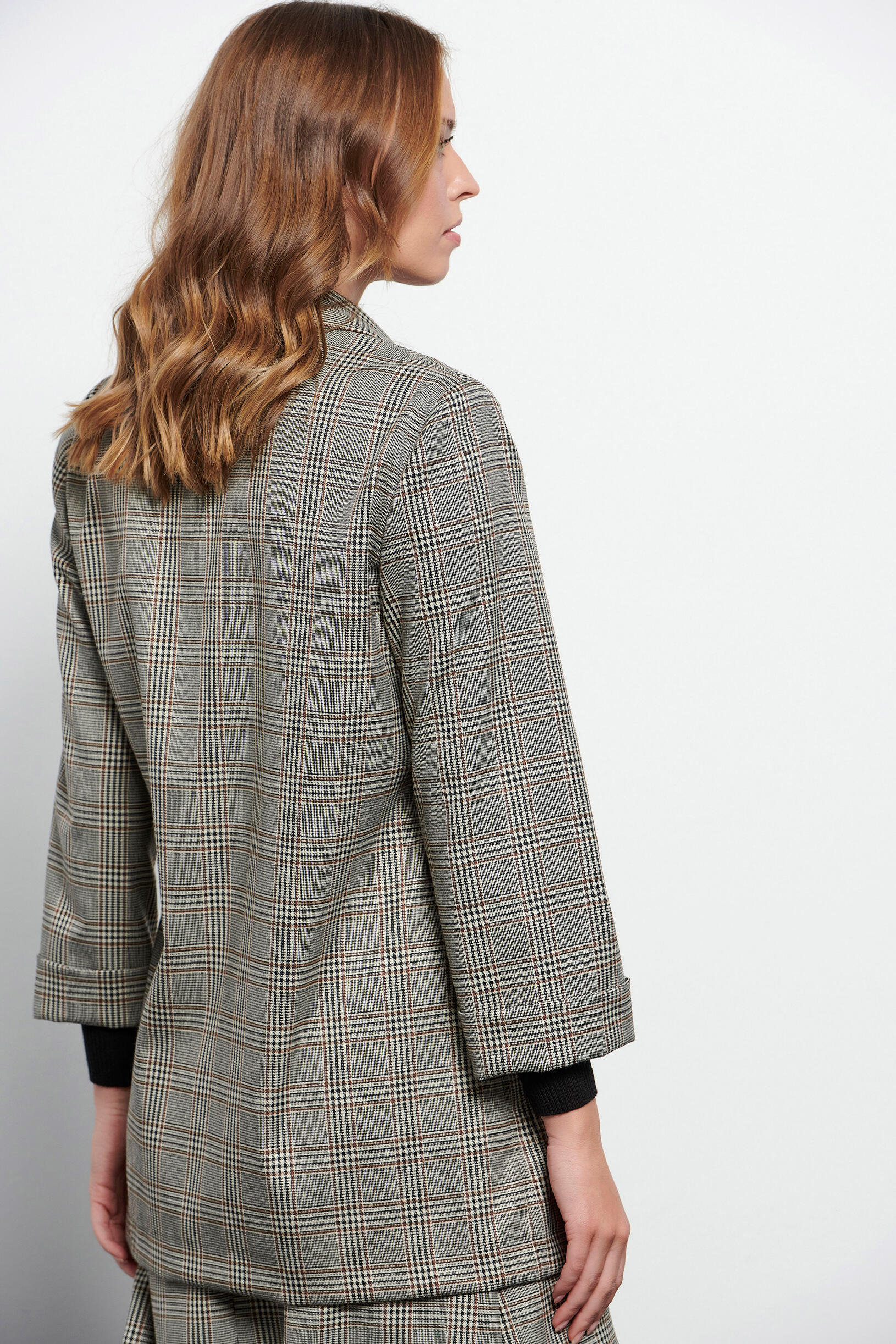 Plaid jacket SKU 10-330328-0 Description Plaid jacket with collar and lapel. With open front pockets and long sleeves. Synthesis 78% polyester 19% rayon 3% elastane