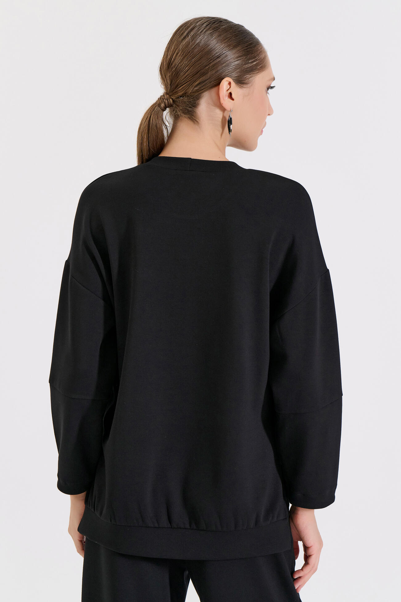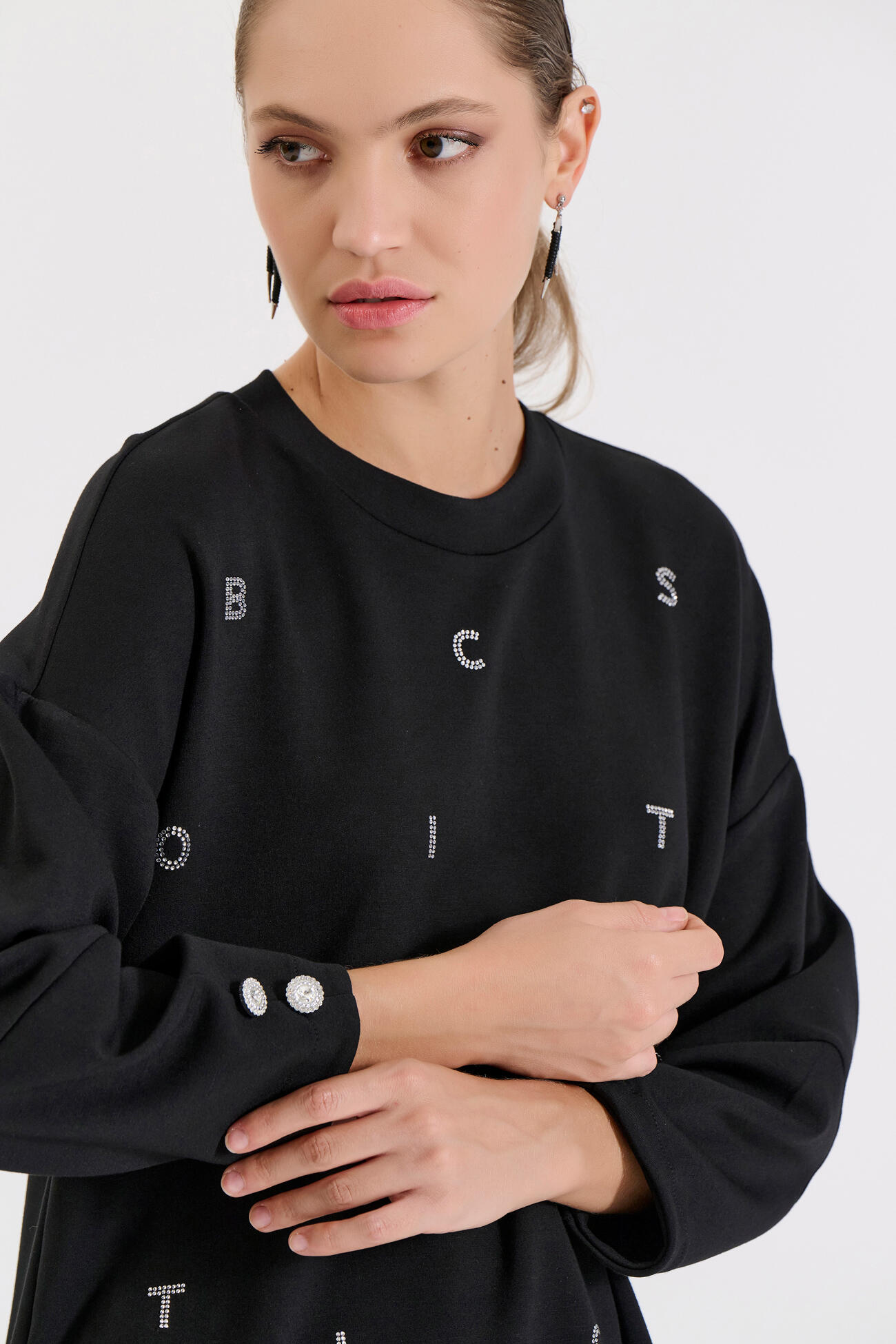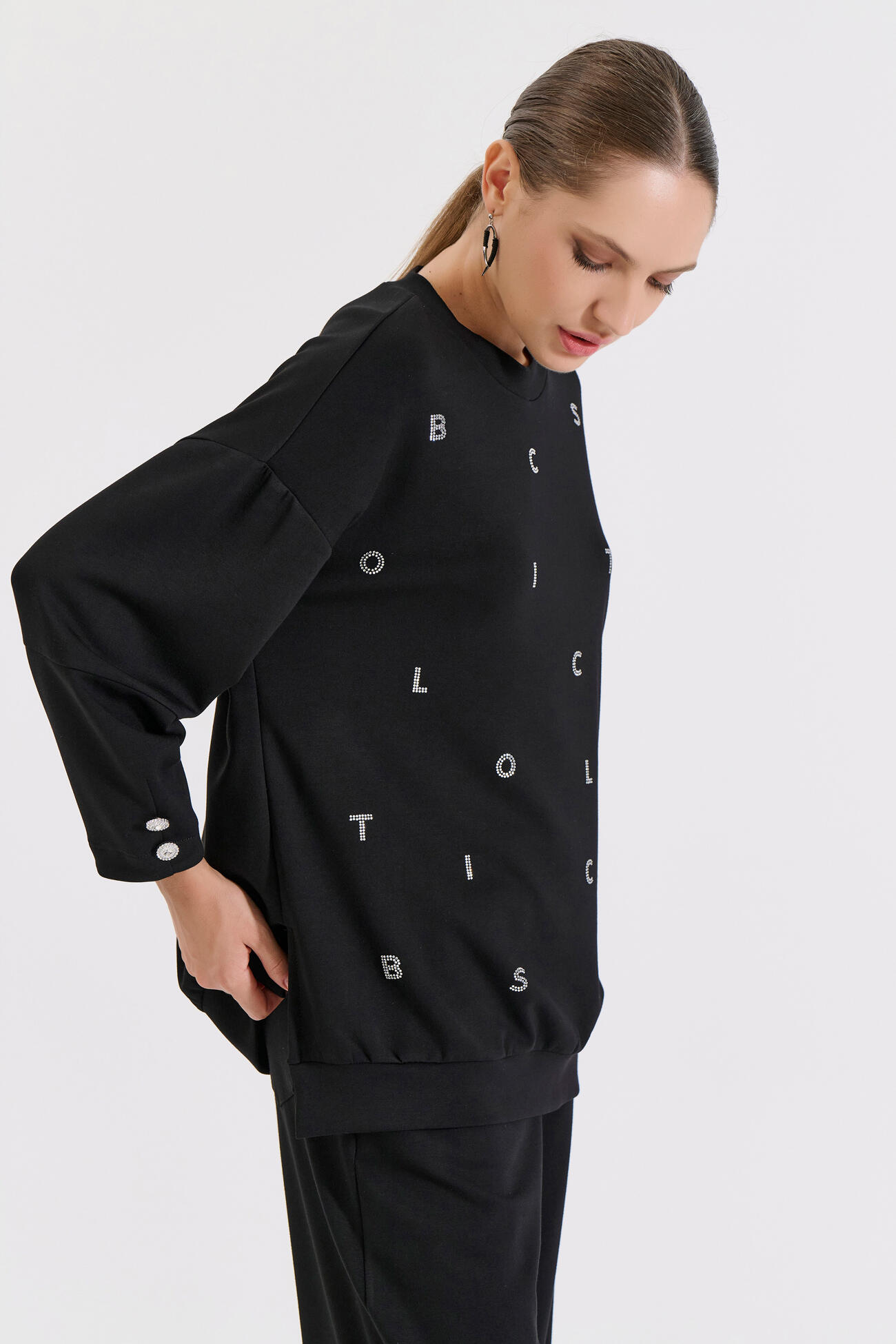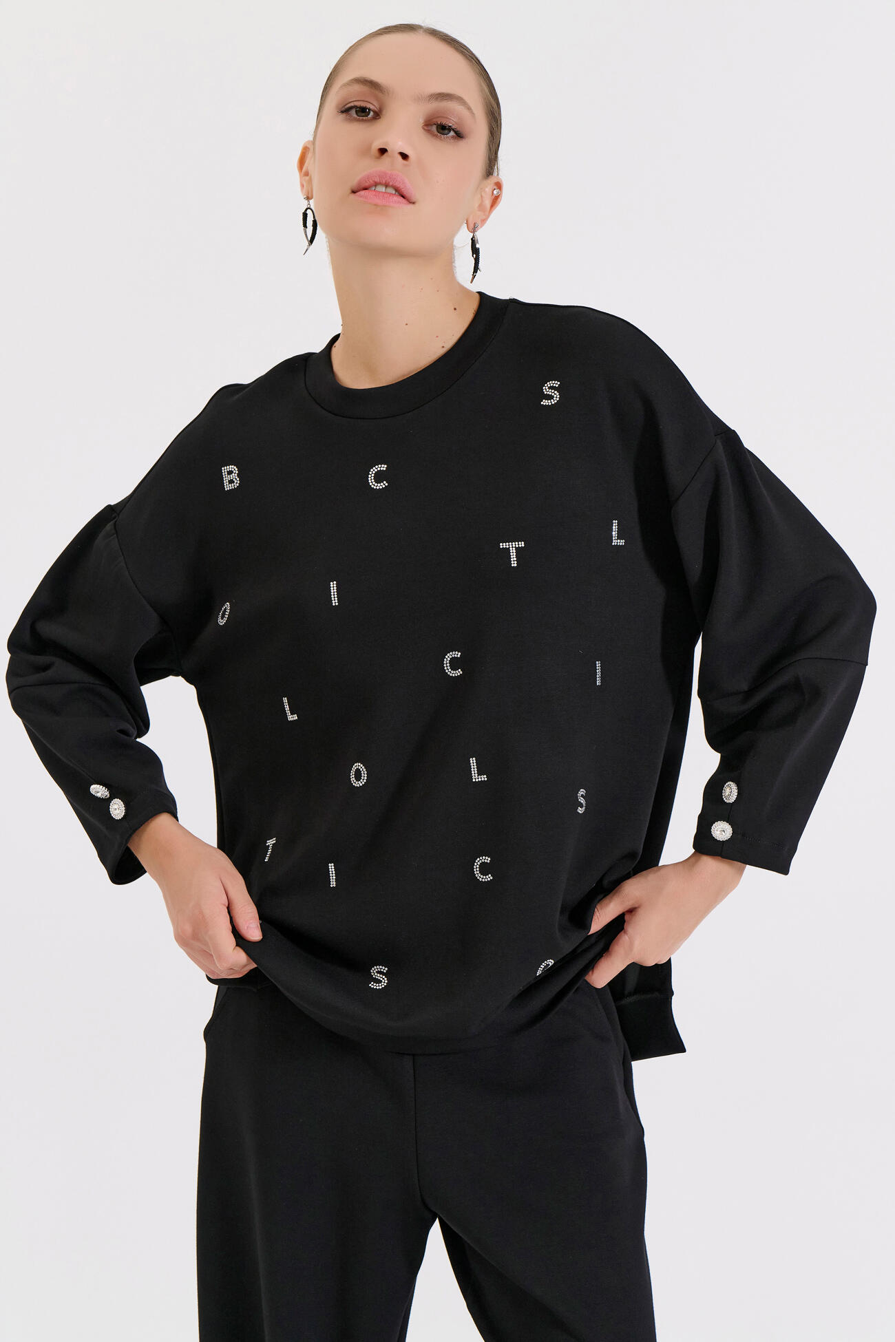 Άνετο και μοντέρνο φούτερ με διακριτική διακόσμηση από στρας στο μπροστινό μέρος. Διαθέτει χαλαρή εφαρμογή και κομψή λεπτομέρεια με κουμπιά στο μανίκι, προσθέτοντας μια λαμπερή πινελιά σε κάθε casual εμφάνιση.