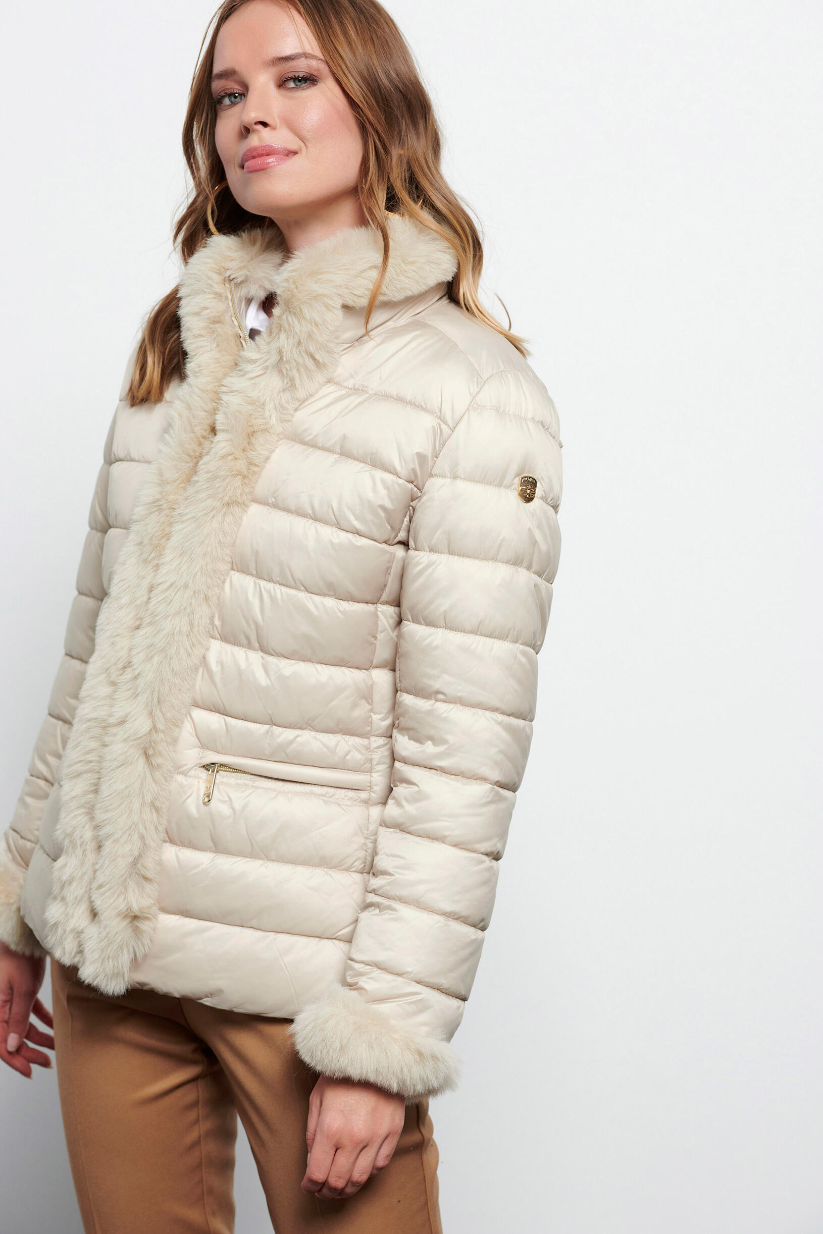 Quilted jacket with fur effect SKU 20-380831-0 Description Quilted jacket with eco fur details on the front, sleeves and collar. Front zipper closure. Zippered pockets. Synthesis 100% acrylic
