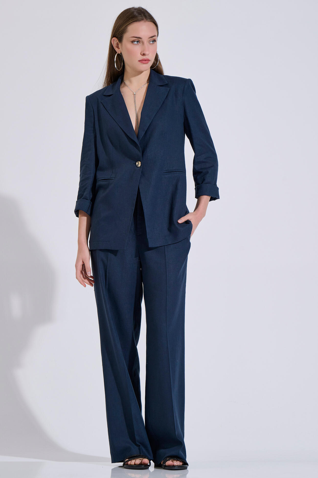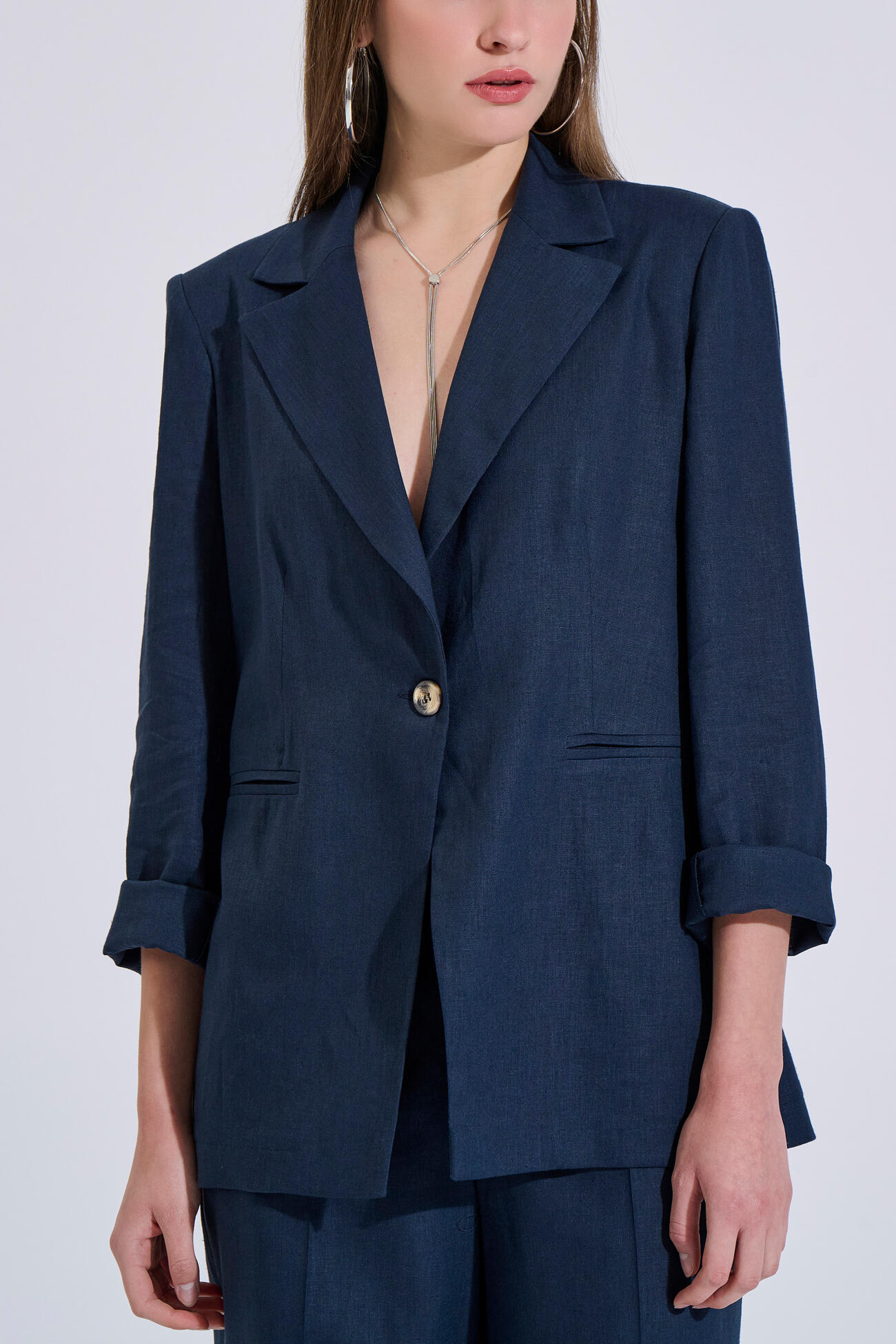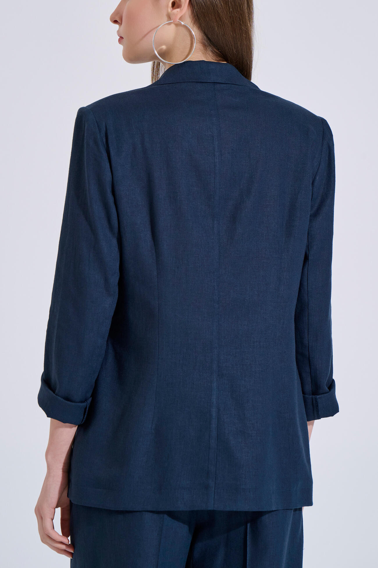 Single-breasted blazer in an elegant, timeless silhouette. Features a notched lapel collar and front button closure. Decorative pockets complete the design, while its linen texture makes it ideal for comfortable and refined all-day looks.