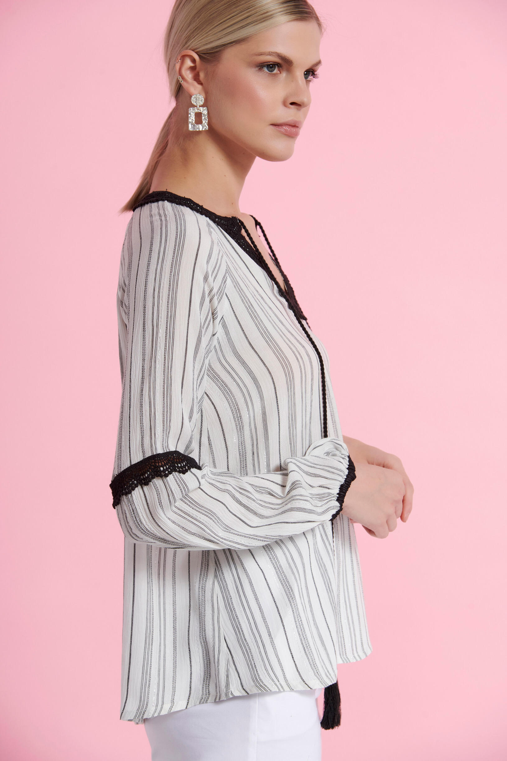 Blouse with balloon sleeves with elastic hem. Fabric combination embroidery detail with fine silver stripe.