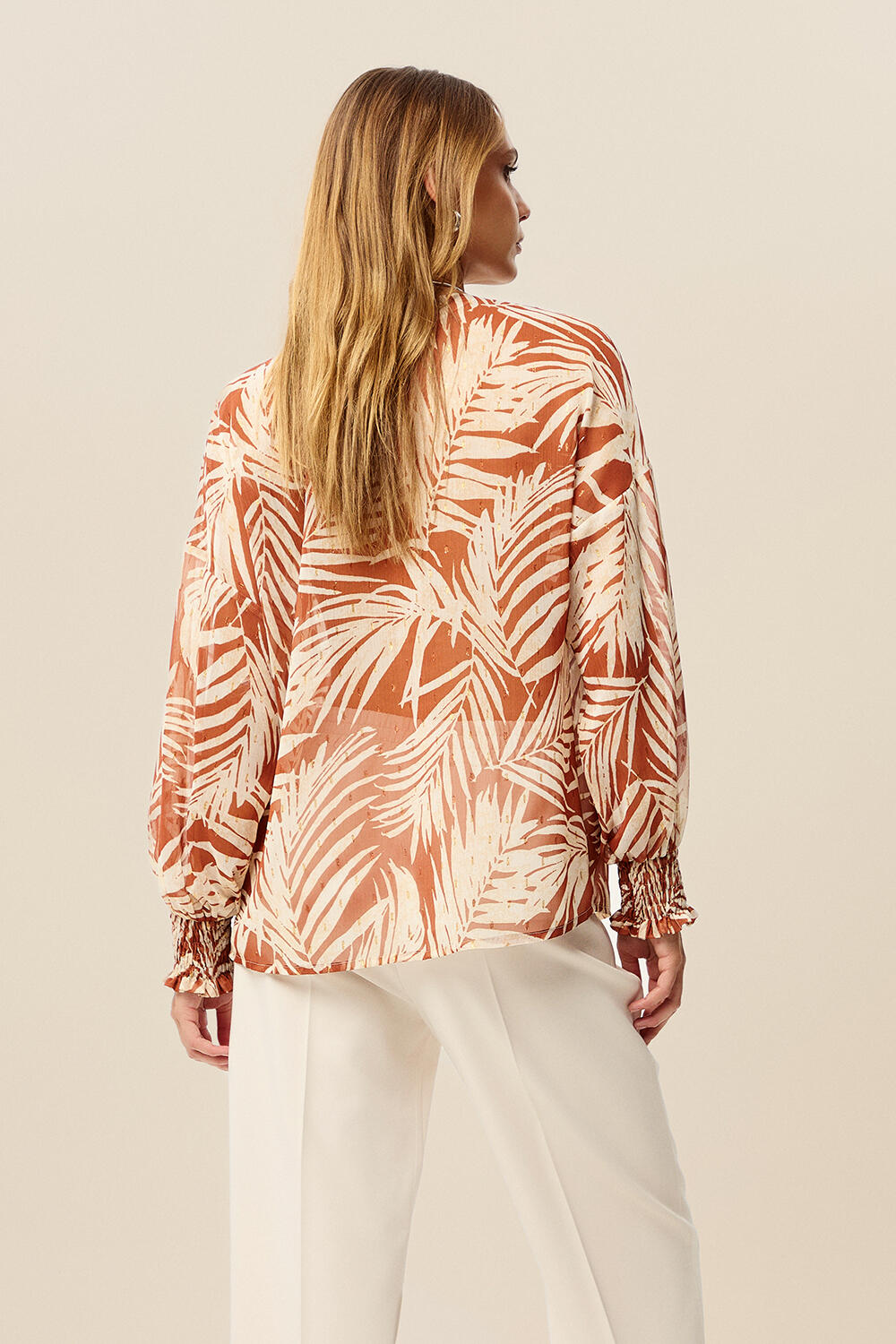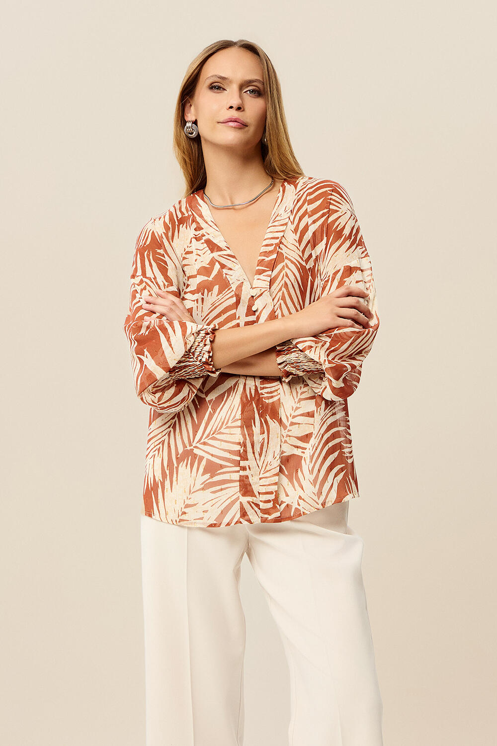 Printed translucent blouse with gold details and wasp nest at the end of the sleeves. It has a V-neckline with decorative buttons.