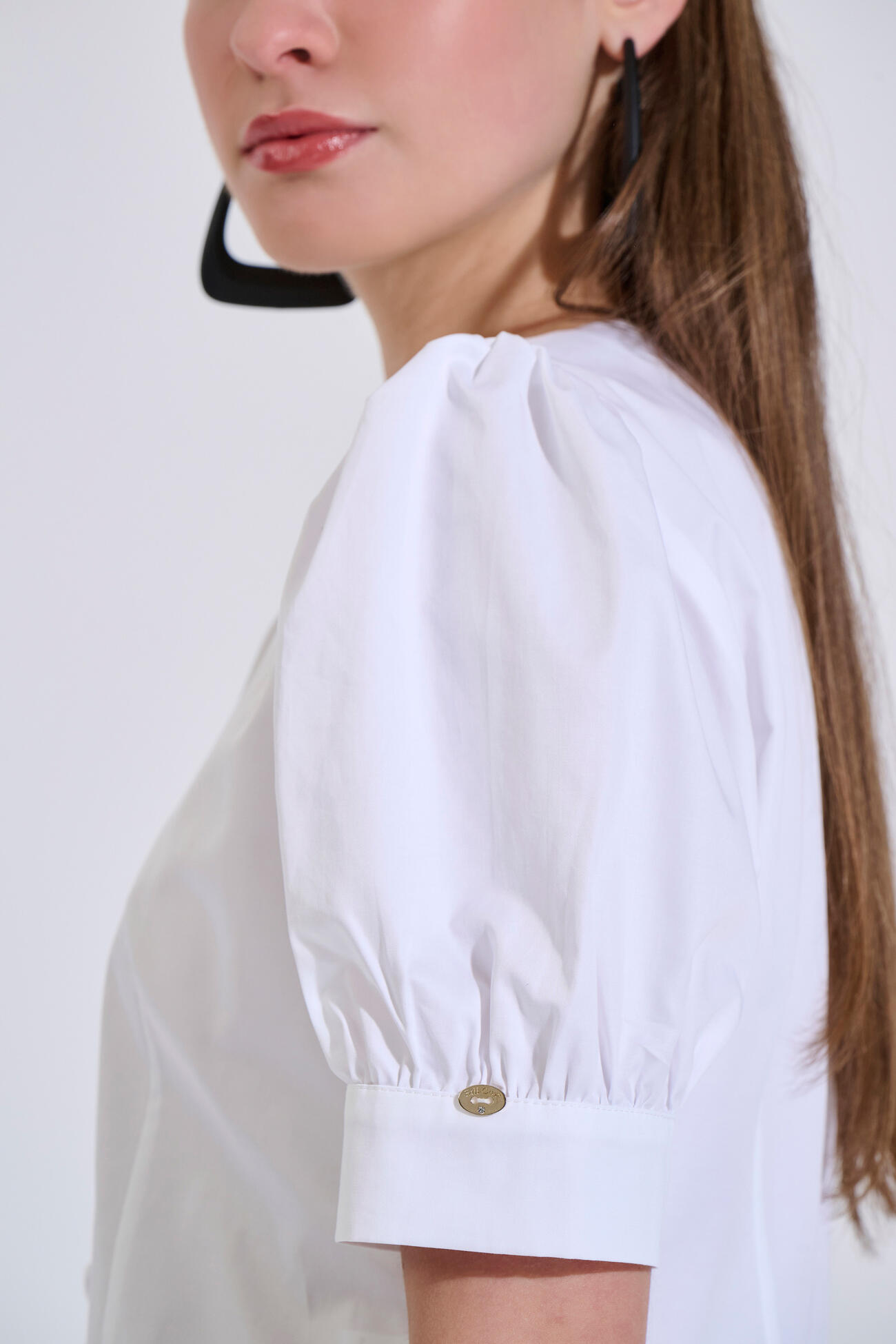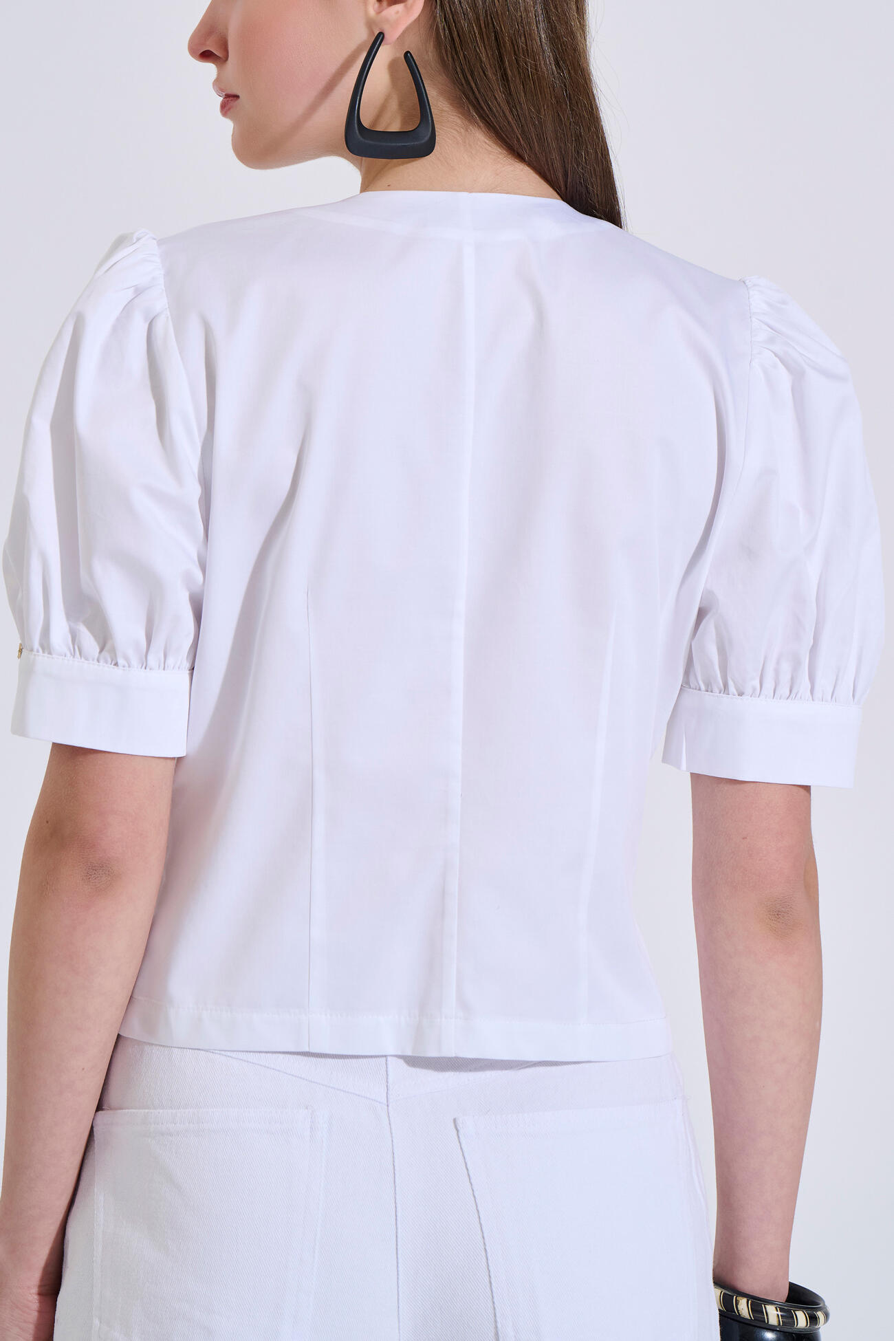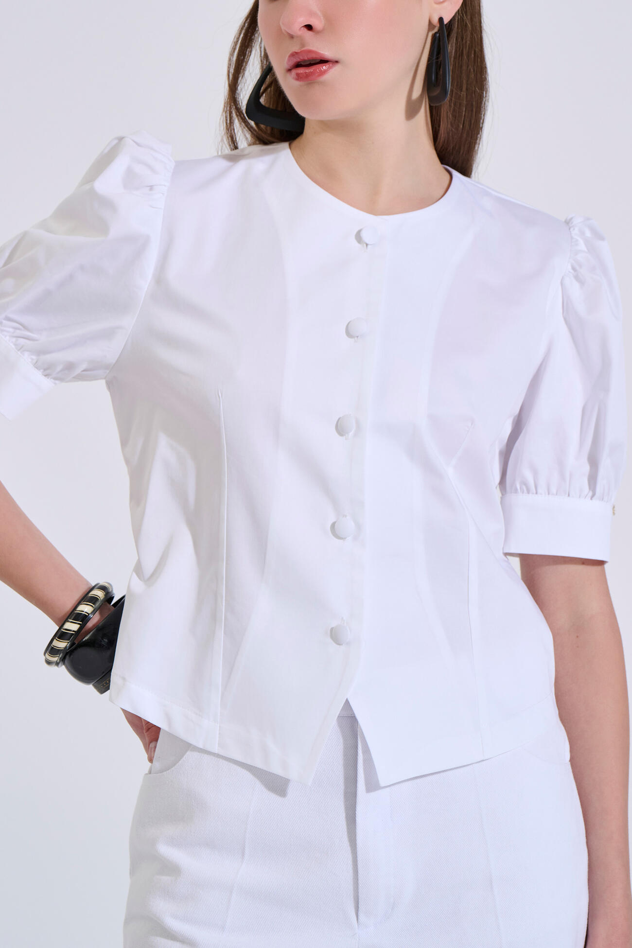 Cotton blouse in a straight fit featuring a round neckline. Designed with short sleeves and subtle gathering at the shoulders, along with a front button closure.