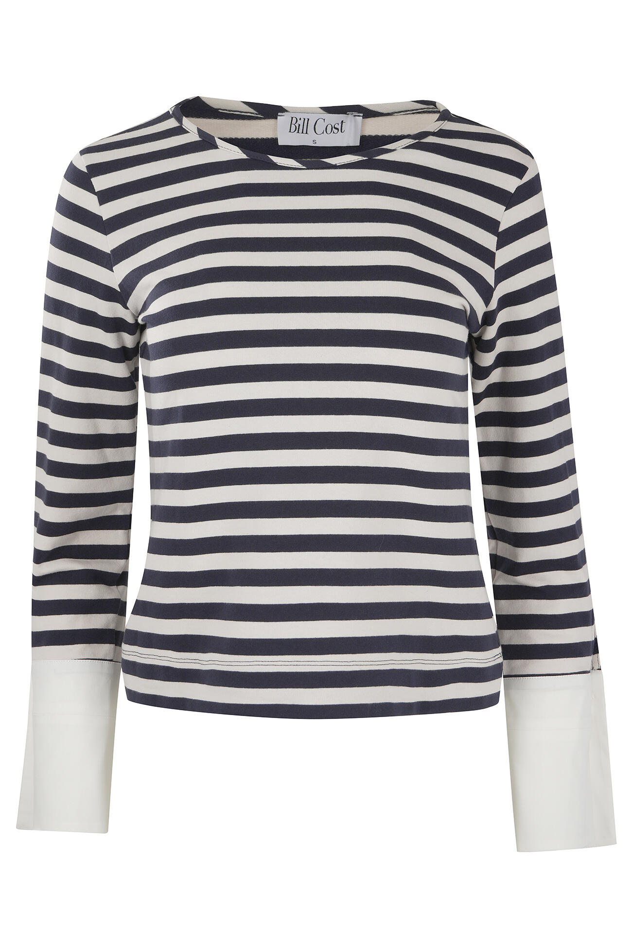 Cotton Breton top featuring a timeless striped pattern and a round neckline. The sleeves are finished with wide solid poplin cuffs and a decorative button detail.
