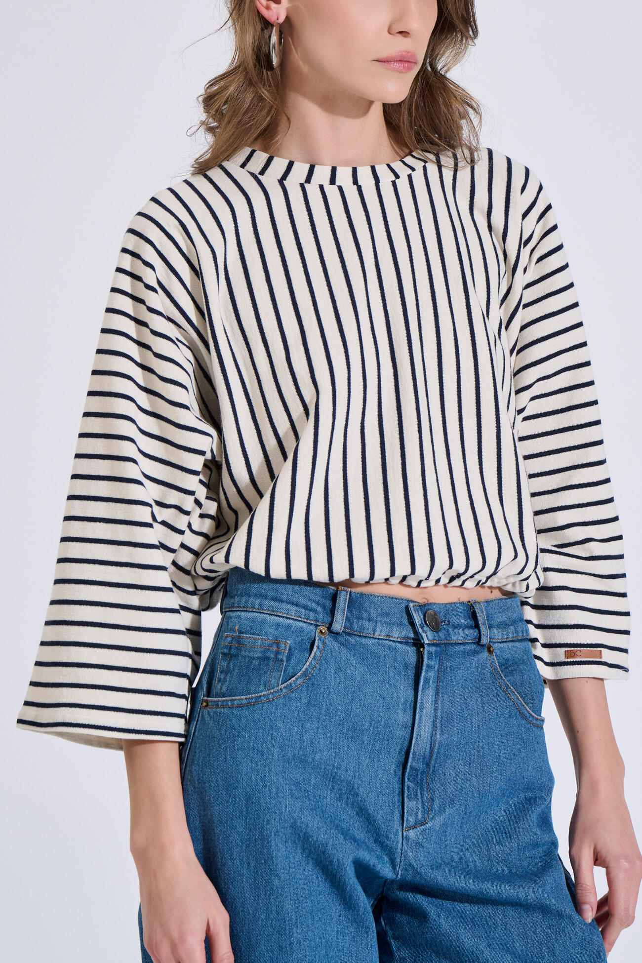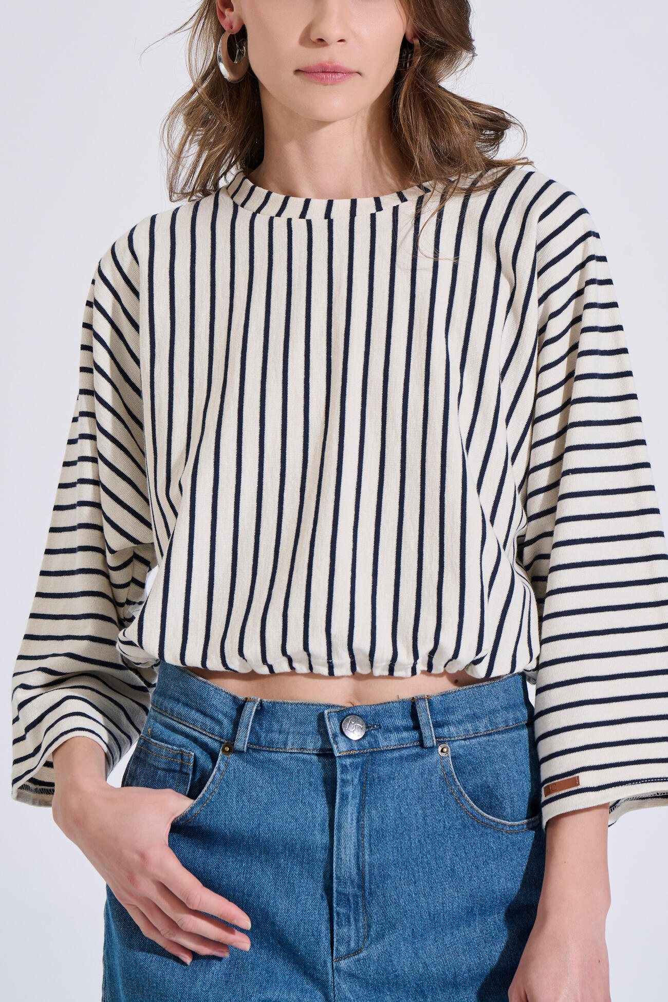 Cotton knitted blouse with a striped pattern in a relaxed fit. It features a round neckline and an adjustable hem with a metallic stopper, allowing you to customize the fit.