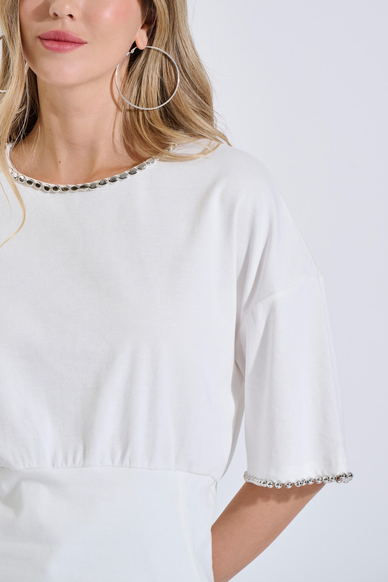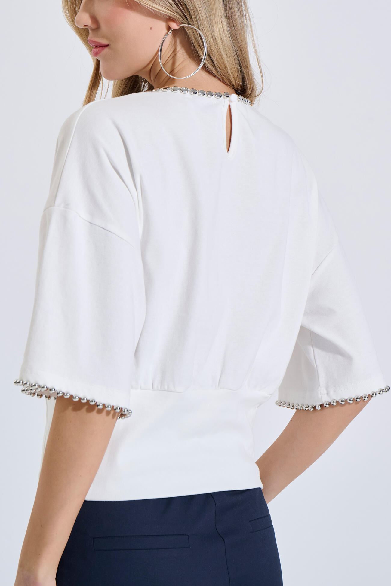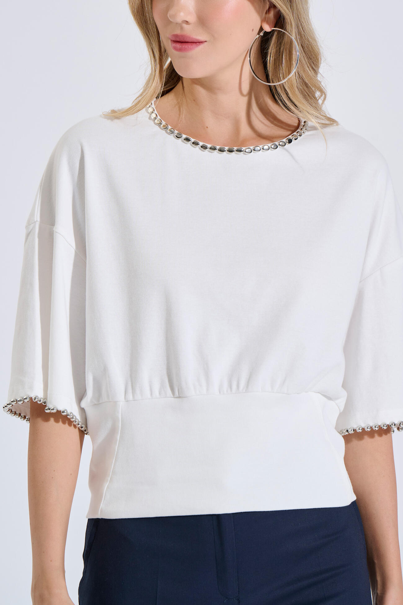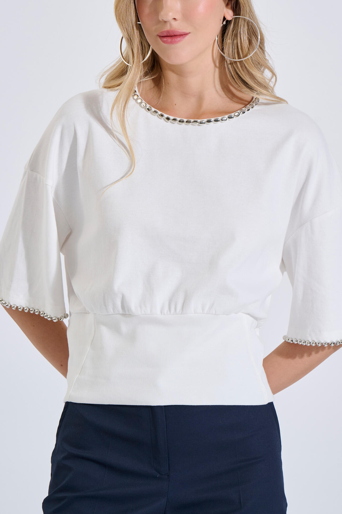 Cotton top in a relaxed fit with a round neckline. Features a peplum waist that enhances the silhouette, while metallic details at the neckline and sleeves add a modern touch. Finished with a back button closure and a subtle opening.