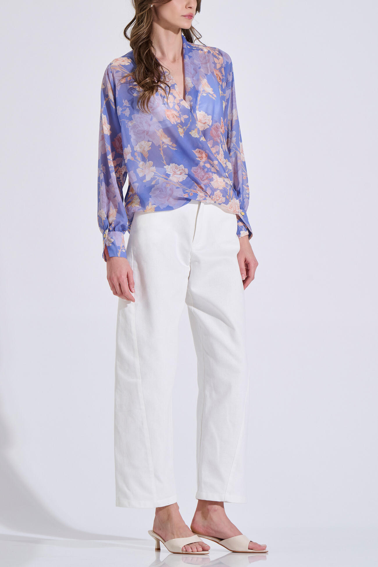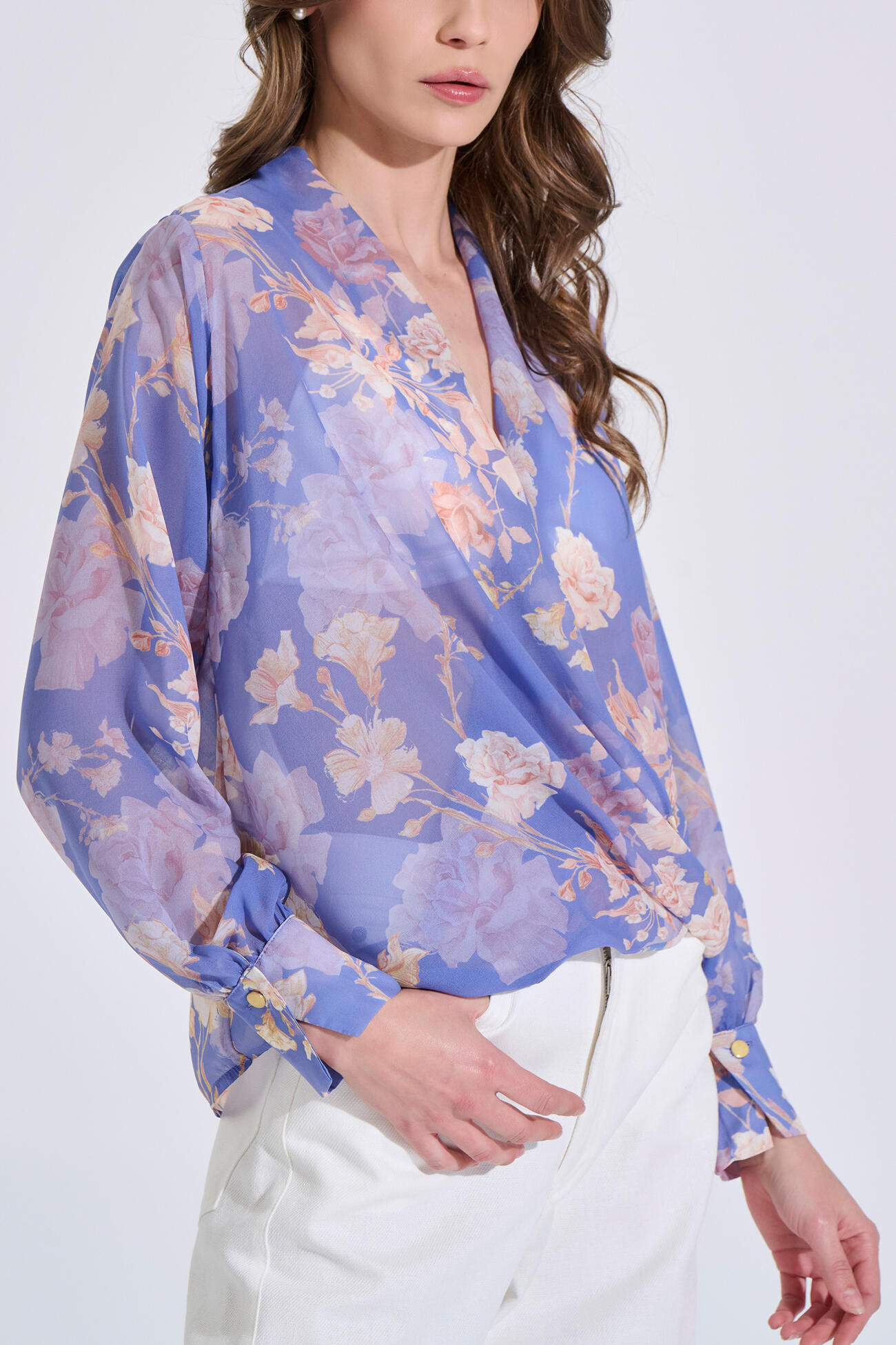 Floral Wrap Blouse with Gold Button Cuffs