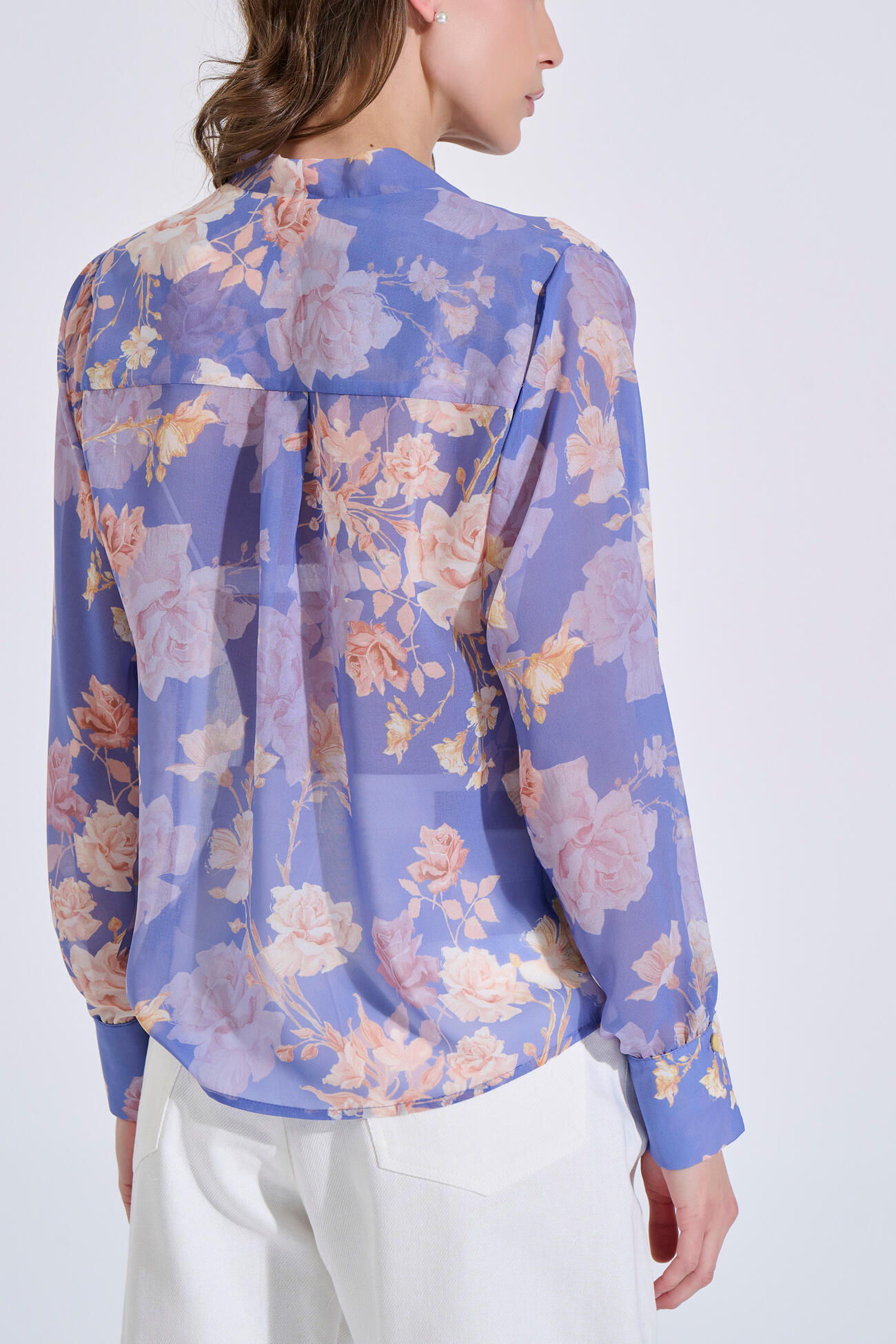 Wrap blouse with a romantic floral print in shades of purple. Features a V-neckline with a wrap-style closure, long sleeves and cuffs finished with a gold button detail.