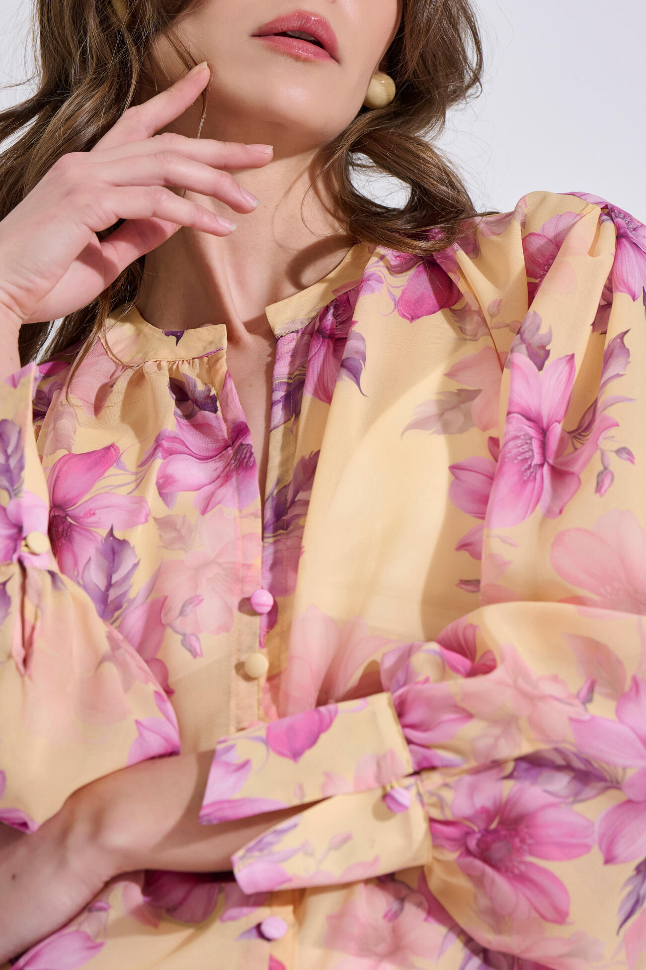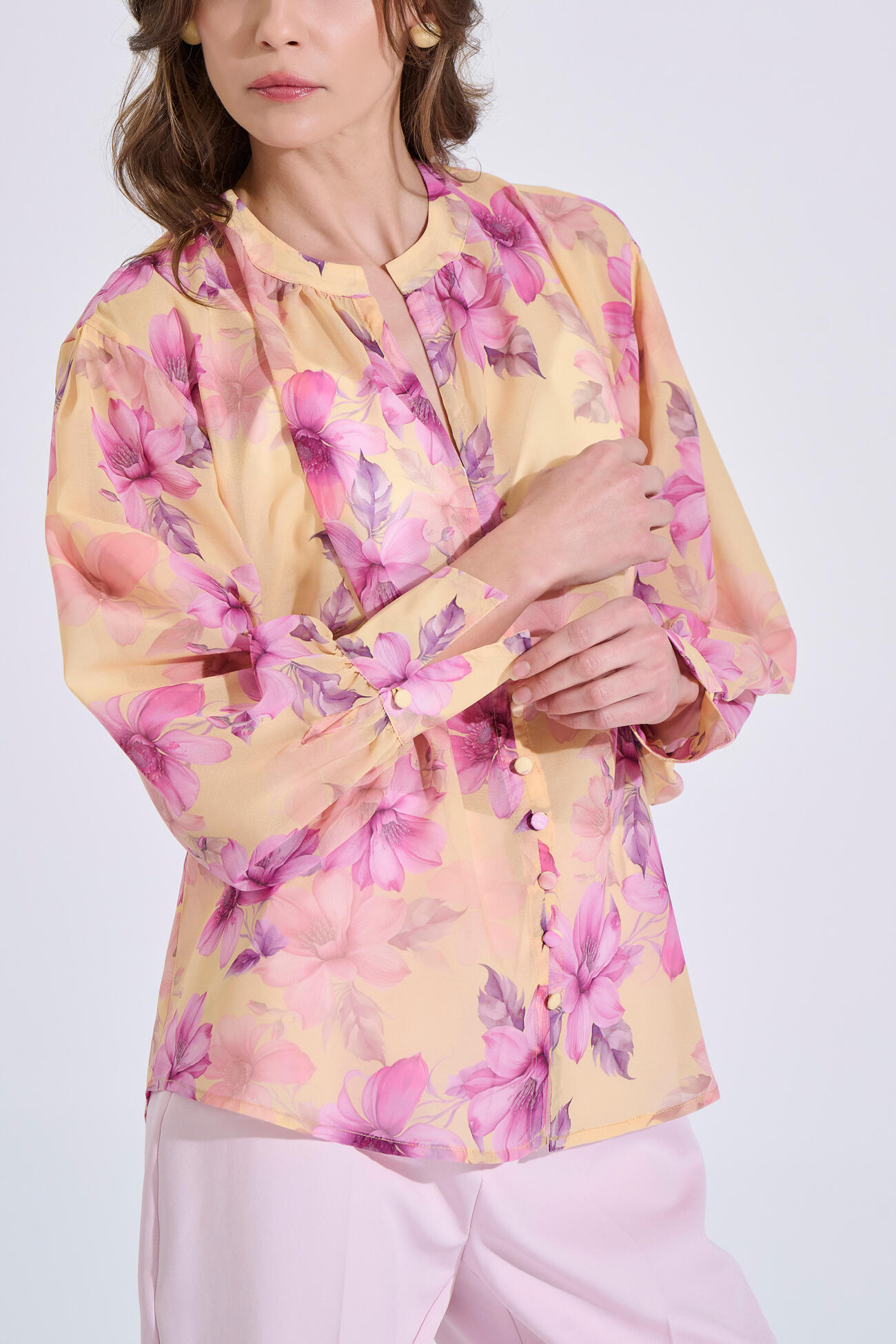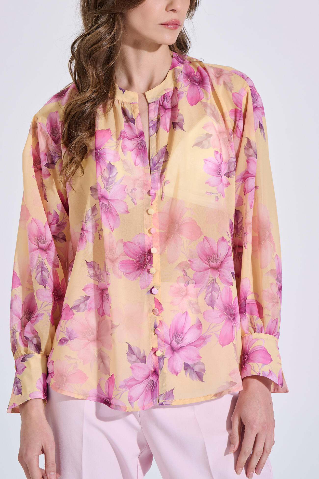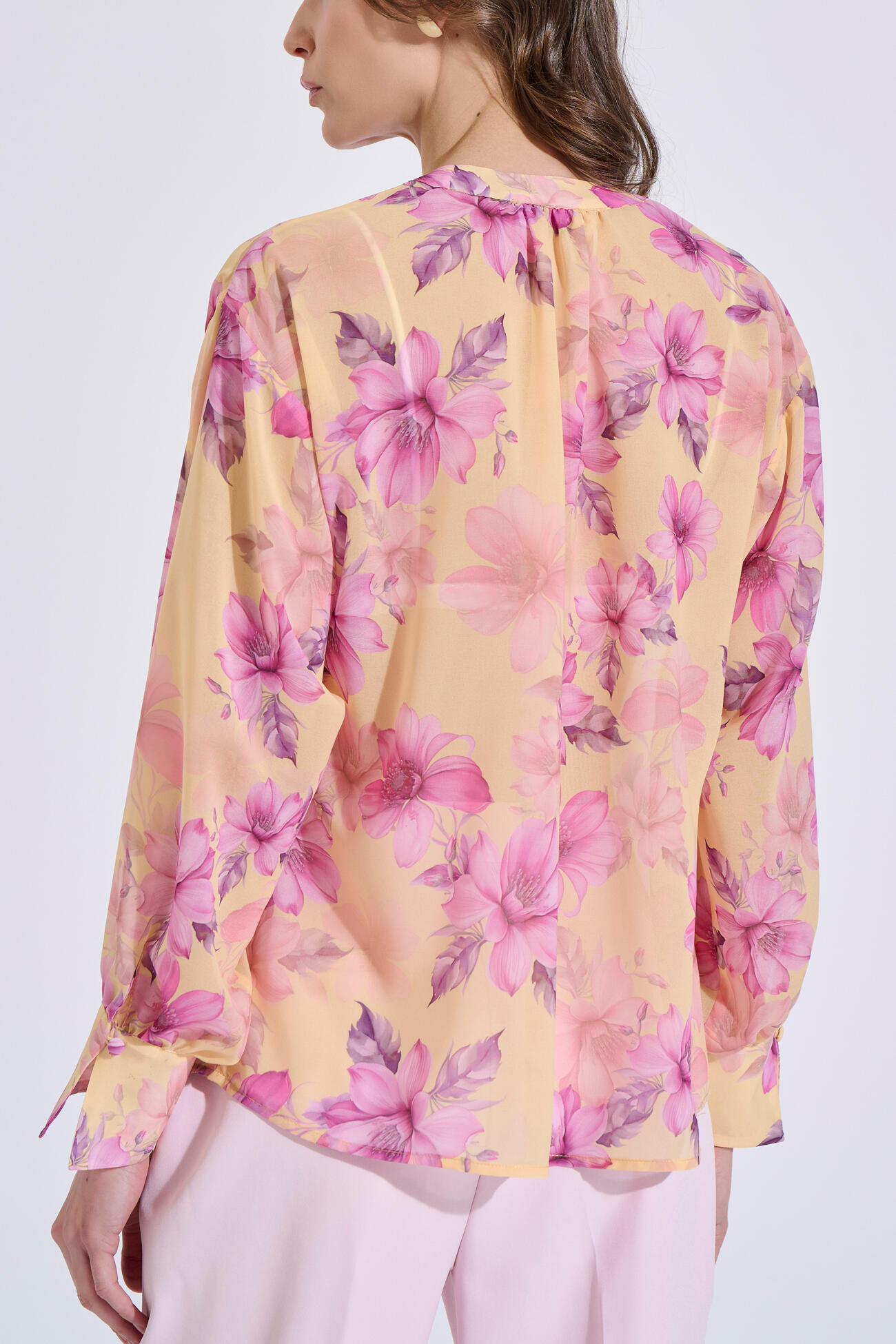 Printed blouse in a lightweight fabric featuring a V-neckline and decorative buttons at the front. Designed with long sleeves and cuffs.
