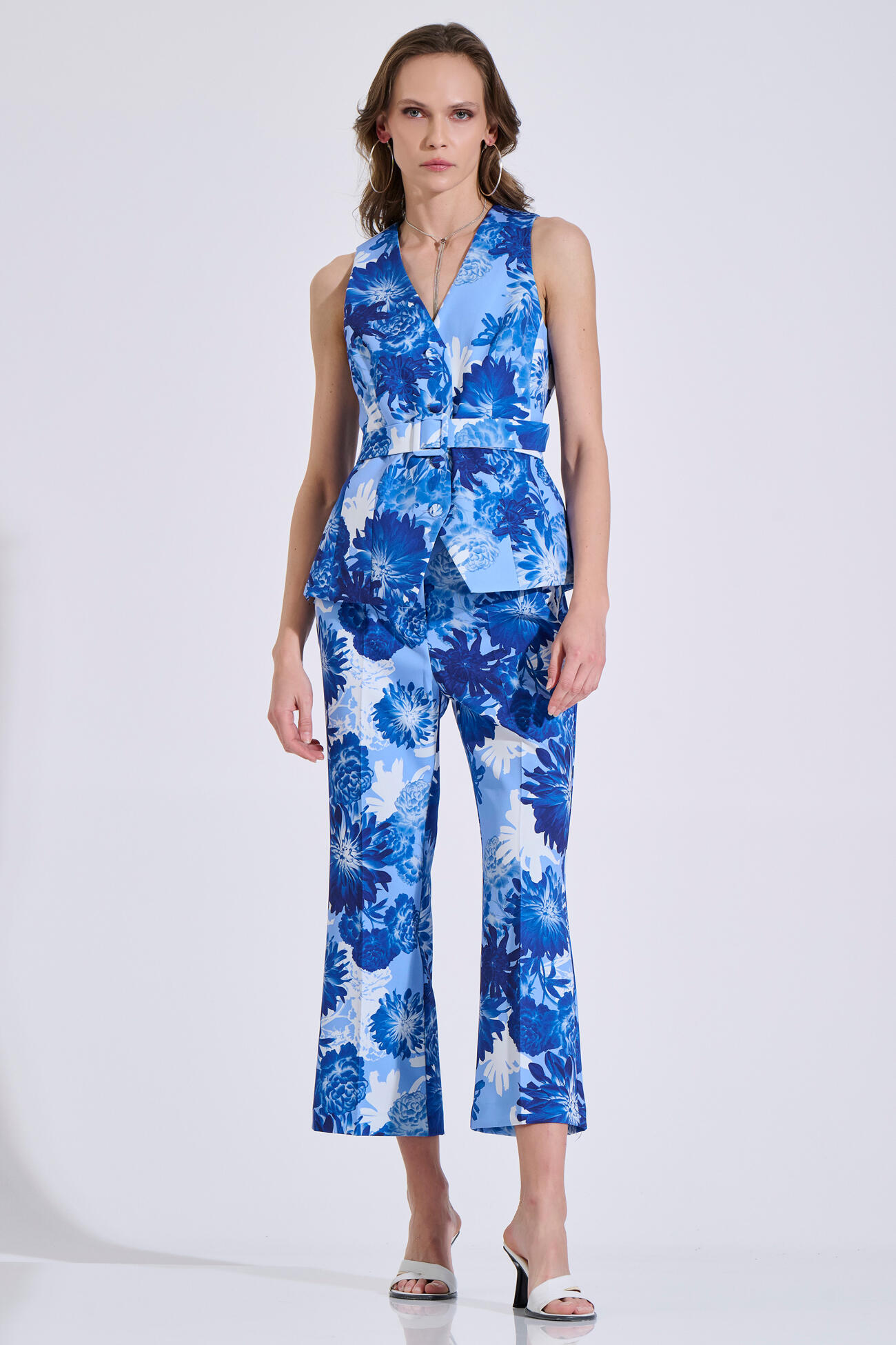 Printed vest with a floral pattern in an elegant silhouette. It features a V-neckline, front button closure, and a matching fabric belt that accentuates the waist. Wear it on its own or style it with the matching pants 10-342493-0 for a complete set.