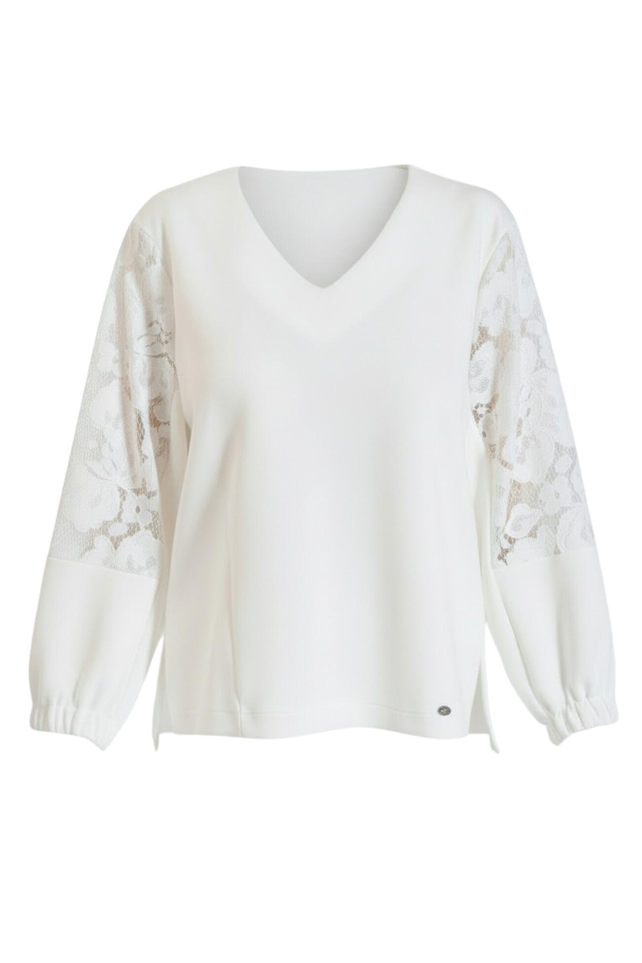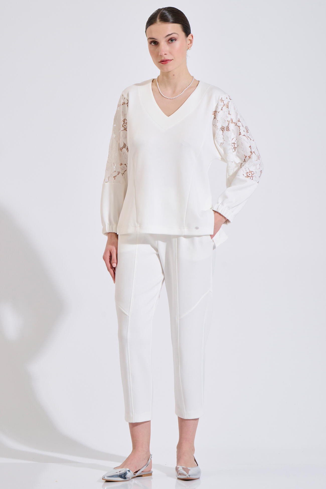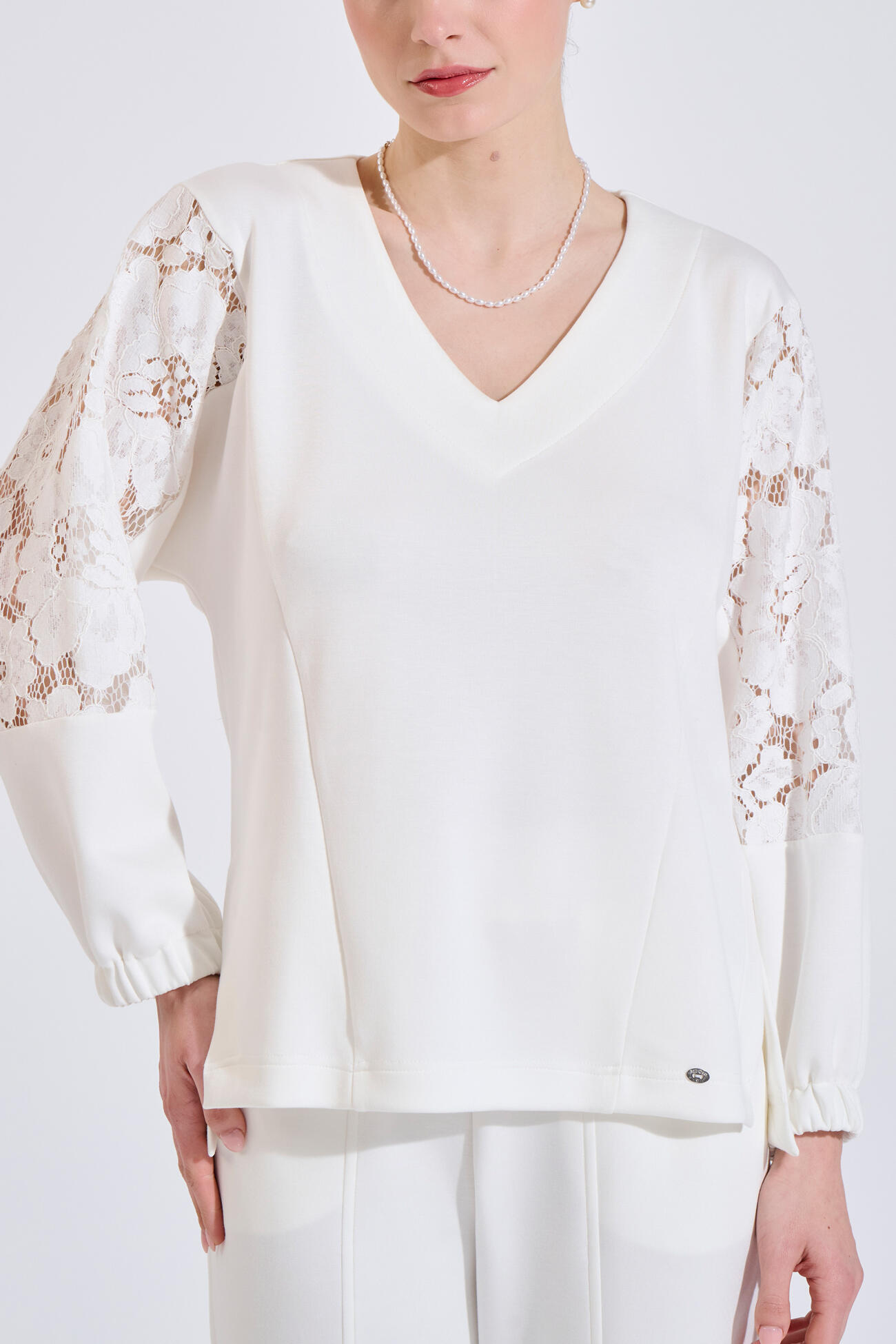 Relaxed-fit blouse featuring a feminine V-neckline. Designed with lace details on the sleeves and elasticated cuffs for a comfortable fit. A refined and versatile piece, perfectly paired with trousers 10-240061-0 for a coordinated set.