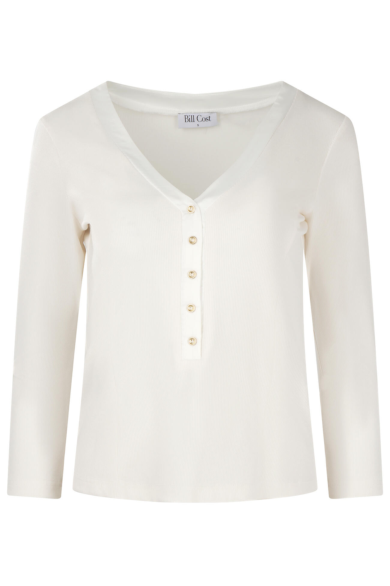 Ribbed top with a V-neck finished with satin trim. Features decorative metal buttons at the front and long sleeves. Fitted silhouette for everyday wear.