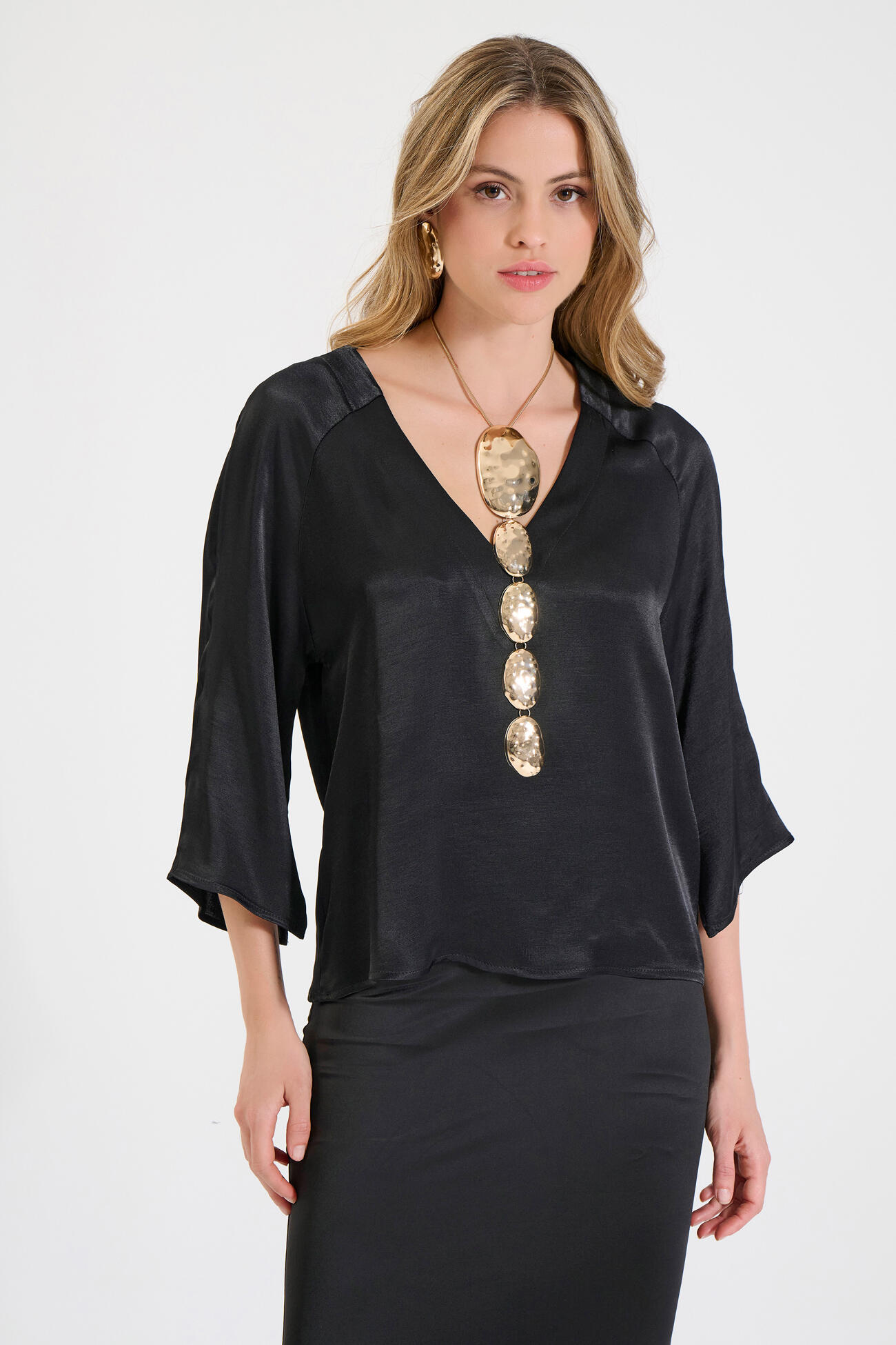 A timeless and refined blouse that exudes understated luxury. Its satin finish adds a subtle sheen, while the clean silhouette and V-neckline flatter the figure. Featuring wide 3/4 sleeves and a sophisticated back button detail.
