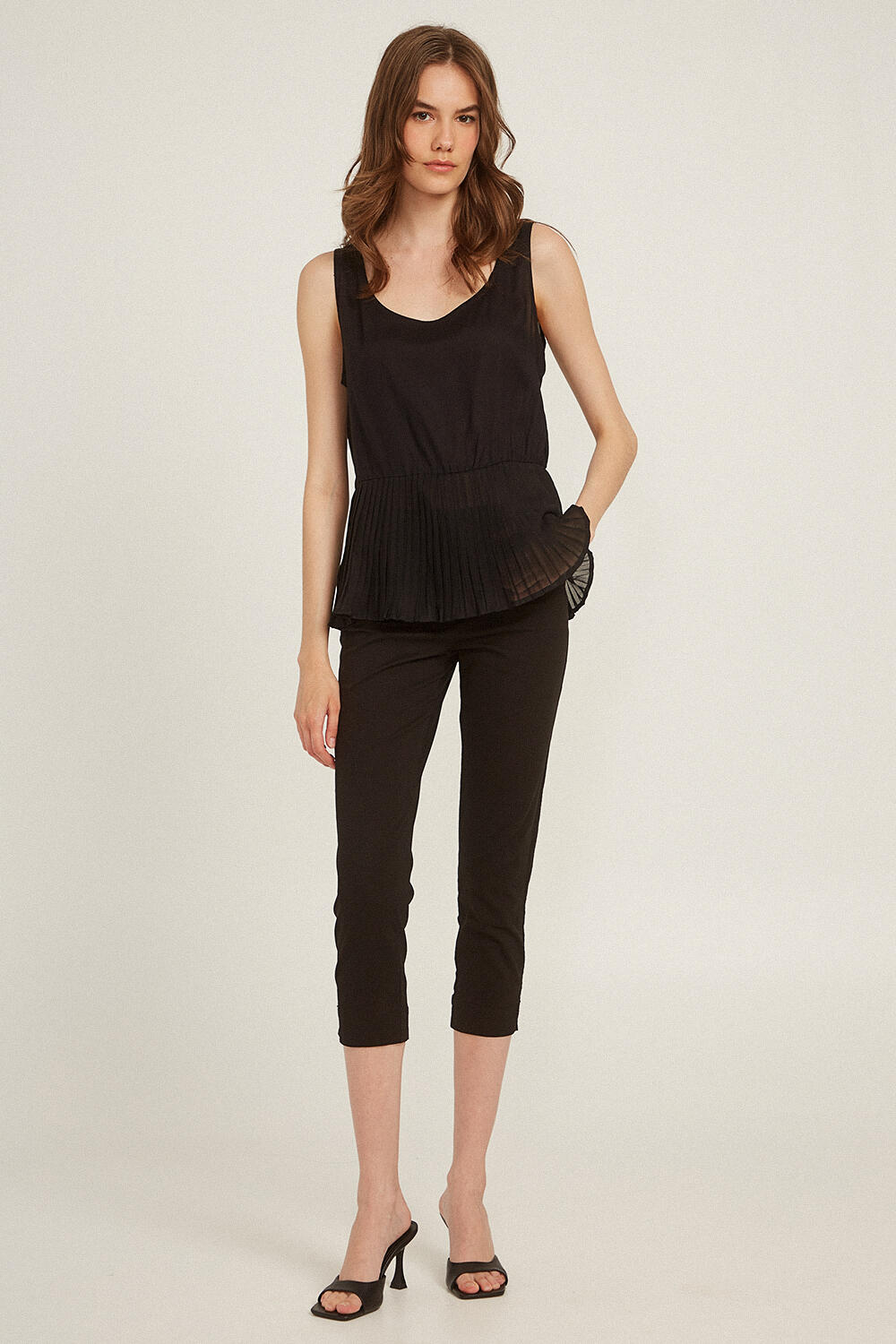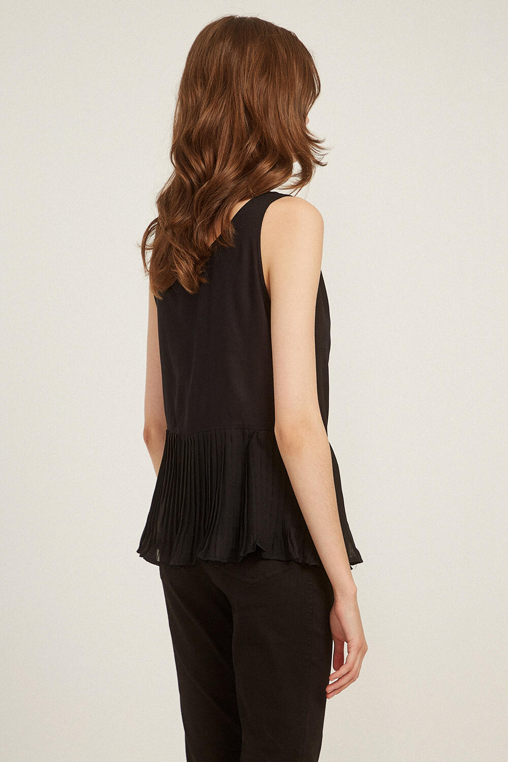 Top with pleated hem SKU 20-350327-0 Description Sleeveless blouse with a combination of fabrics. Smile neckline and pleated finish. Synthesis 50% polyester 50% viscose