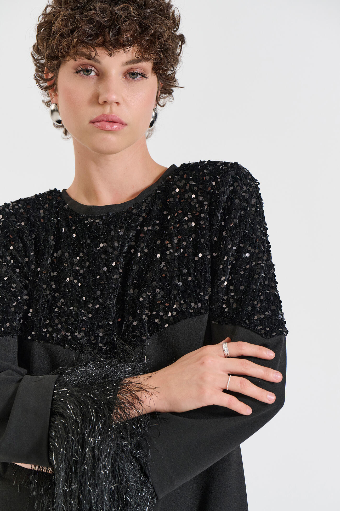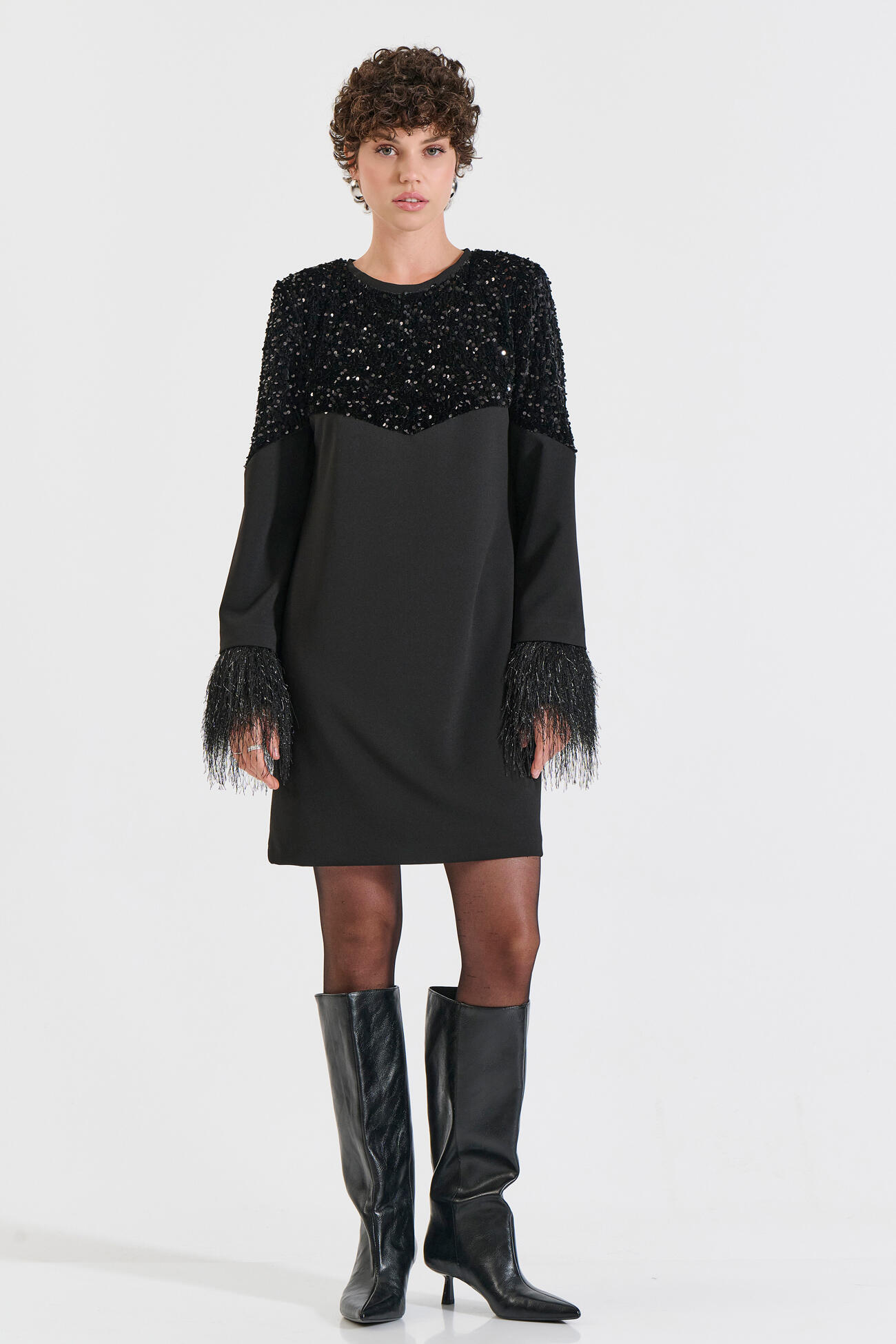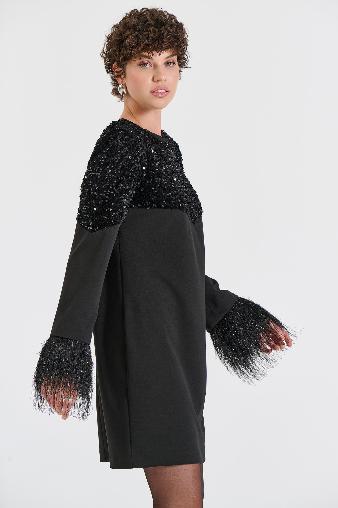 A strikini dress featuring rich sequins on the upper section for a glamorous shine and standout appeal. The sleeves are adorned with fringe detailing that adds movement and unique texture, creating a dynamic and elegant look. Its straight silhouette offers comfort and a modern aesthetic, making it ideal for evening and festive occasions.