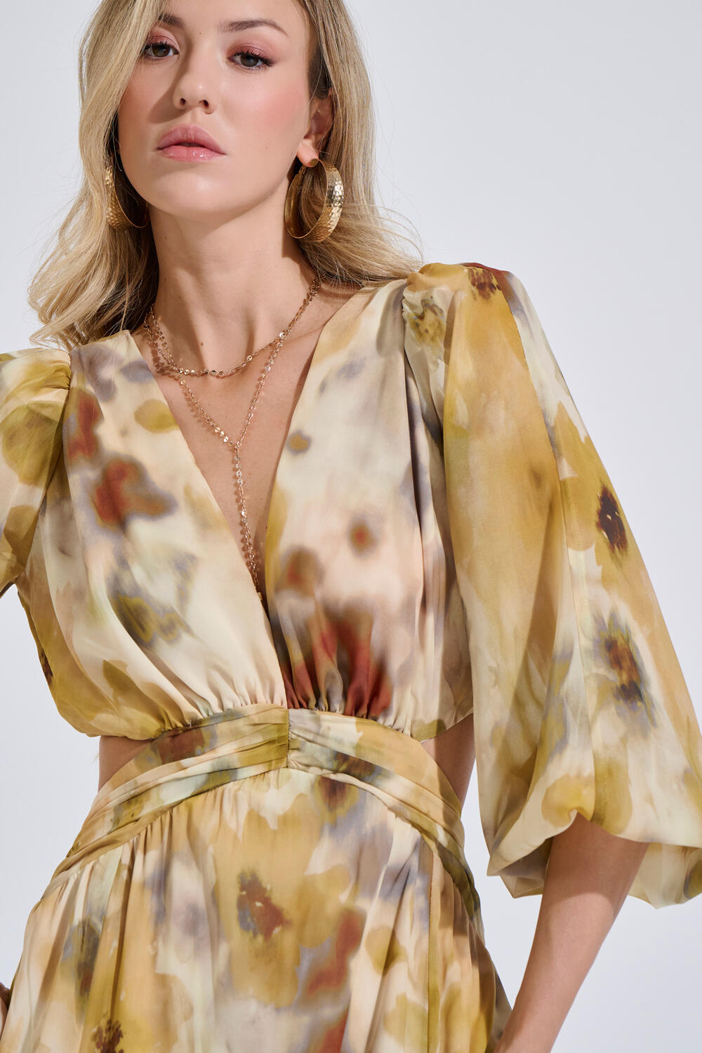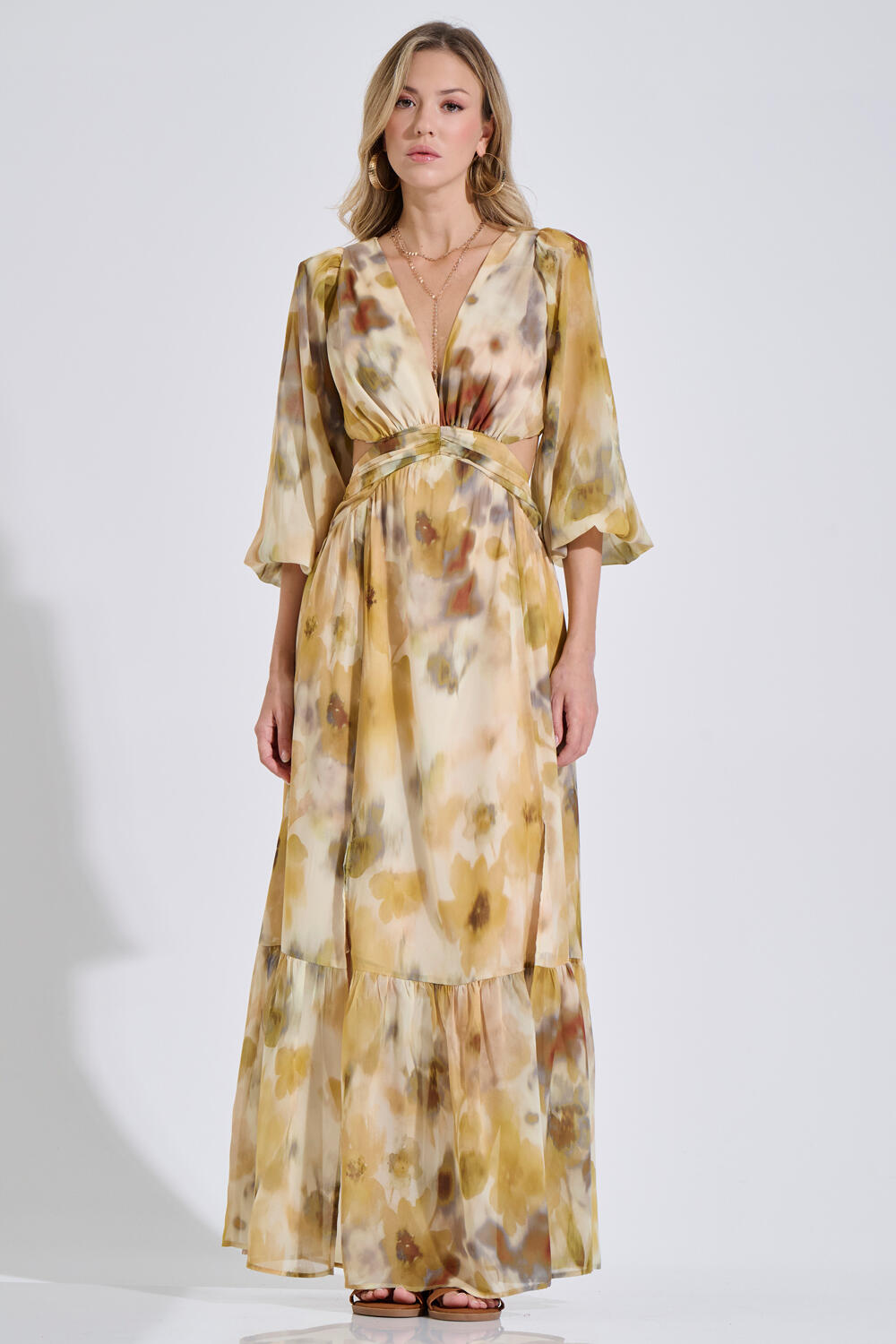 Flowy maxi dress with a soft, earthy-toned print. Features a deep V neckline and voluminous 3/4 sleeves for elegant movement. The waist cut-outs add a modern, feminine touch, enhancing the silhouette. Fastens with a back zipper and includes inner lining for comfort and a smooth fit. The ruffled hem completes the look with elegance.