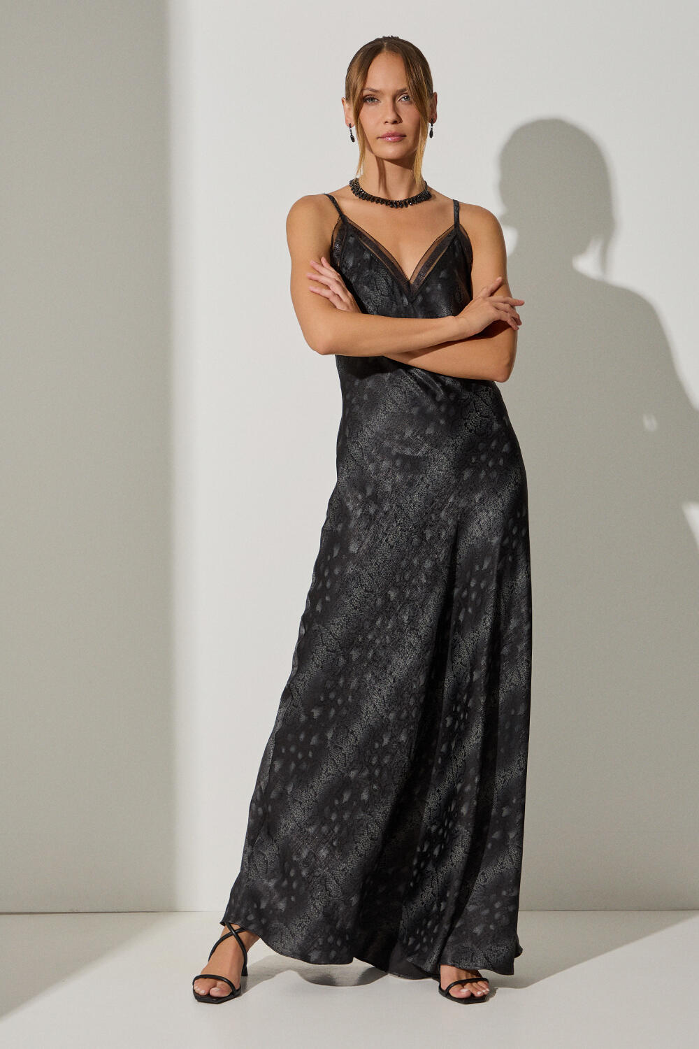 Maxi satin dress SKU 10-342200-0 Description Snake print dress, V-neck and back with sequins and tulle. Adjustable thin straps. Synthesis 100% polyester