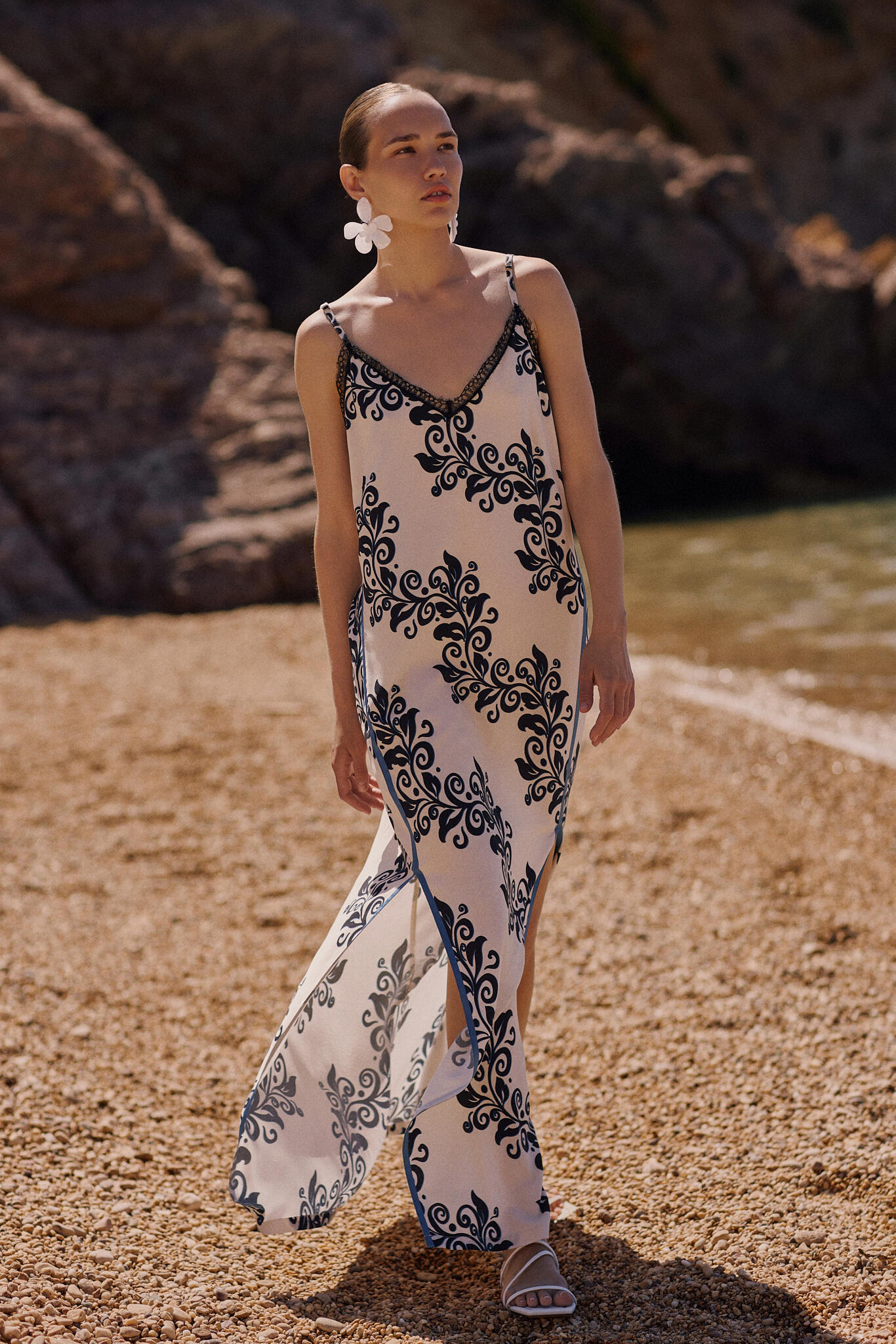 Printed dress with slits at the side, a thin adjustable strap and lace detailing at the neckline and back.