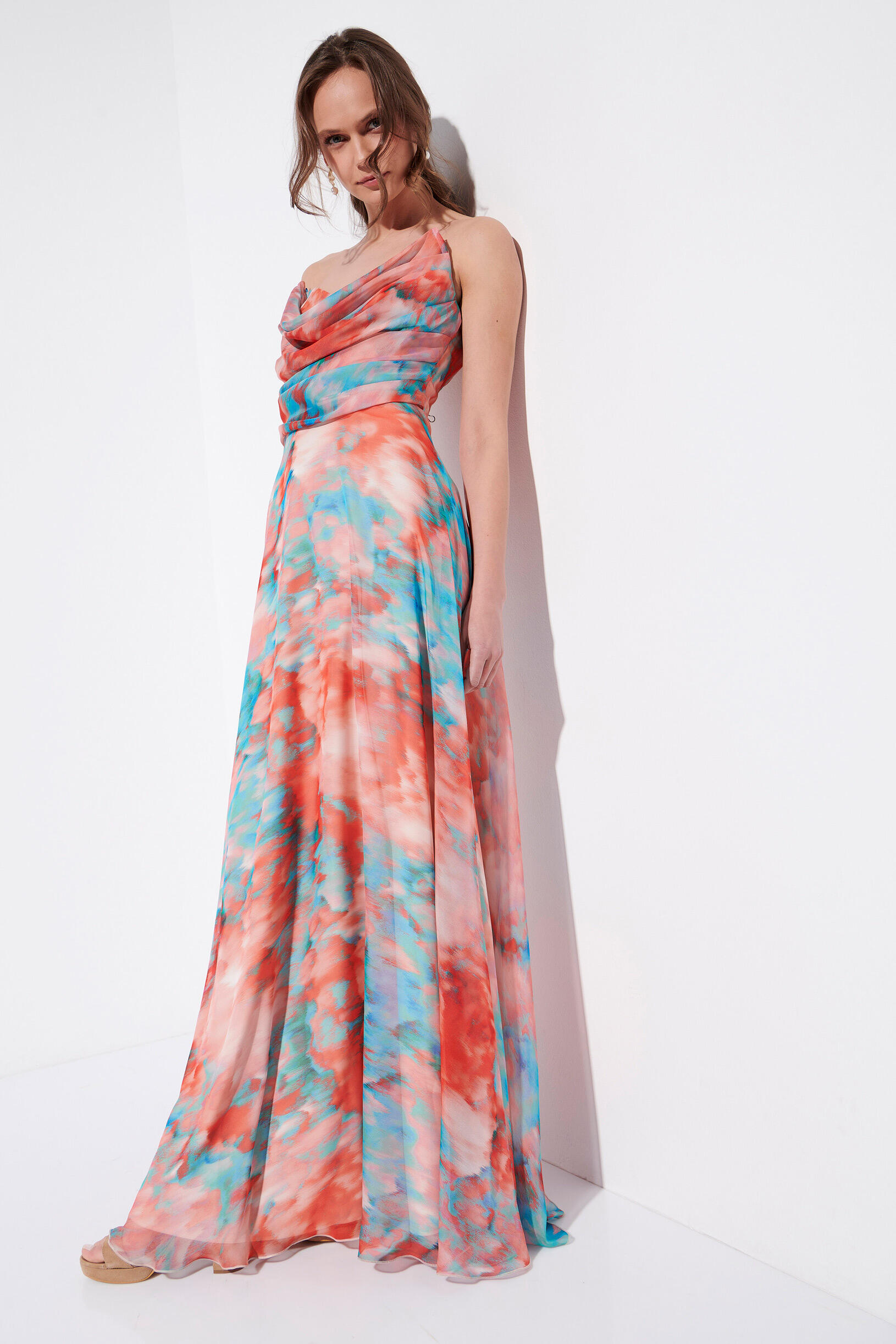 Printed maxi dress SKU 20-340877-0 Description Dress with detachable straps and draped bodice. It has an inner lining, closure with a zipper on the side. Synthesis 100% polyester