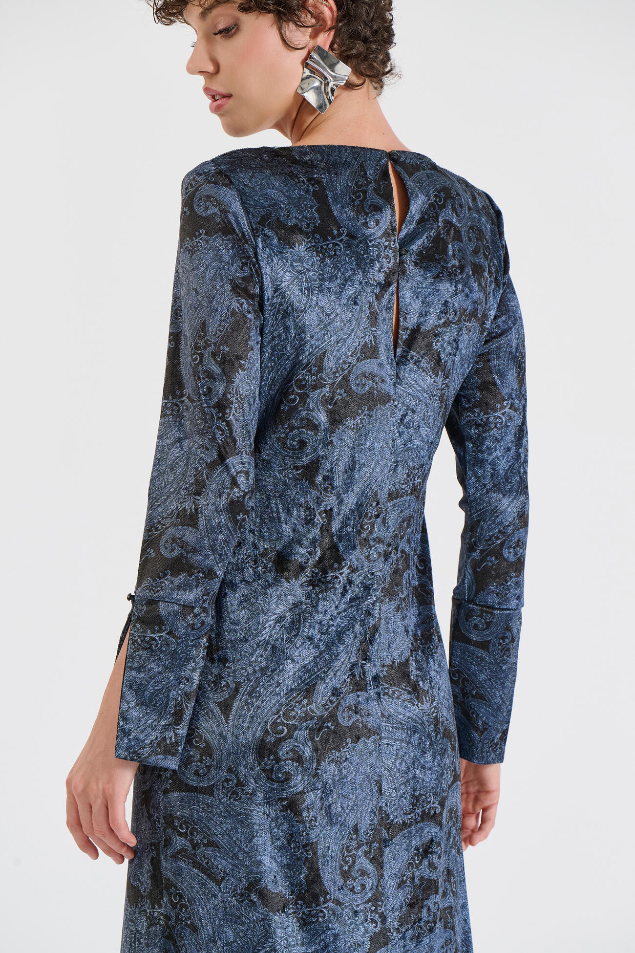 paisley pattern that adds character and a modern aesthetic. Its midi length enhances the silhouette with subtle sophistication, while the sleeve slits offer movement and a refined detail. A standout piece that blends comfort and style, perfect for special occasions and evening looks.