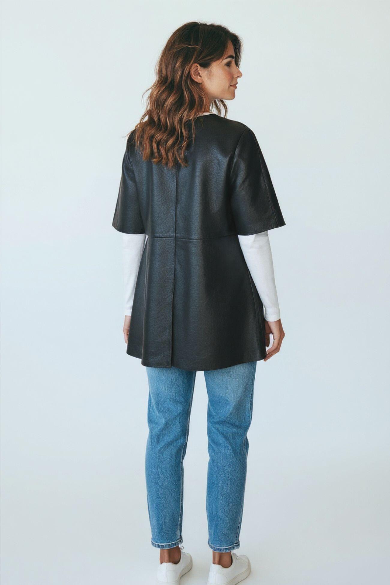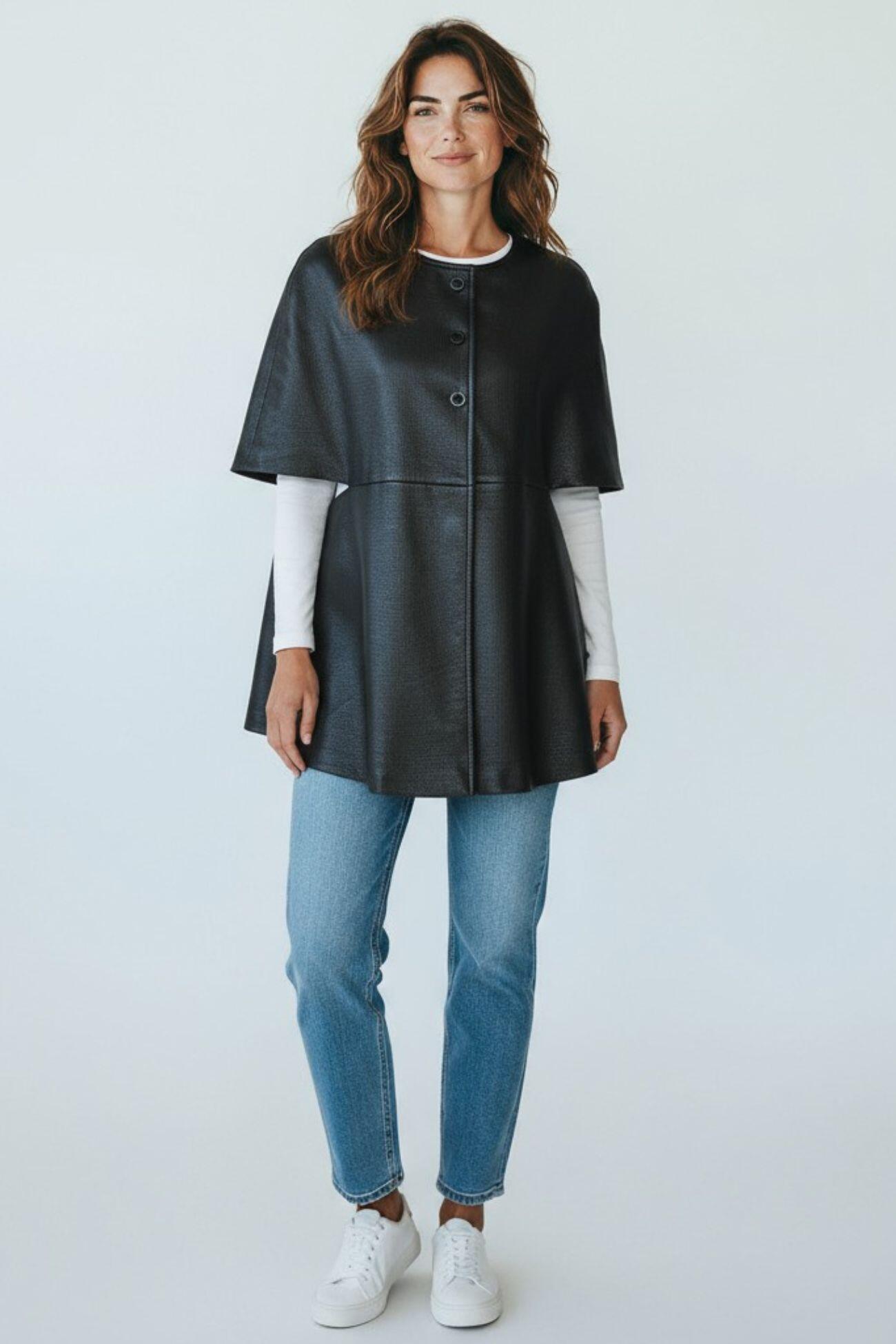 Elegant faux-leather textured cape featuring a relaxed silhouette, round neckline and front button closure for a clean, modern look. A versatile piece that elevates any casual outfit.