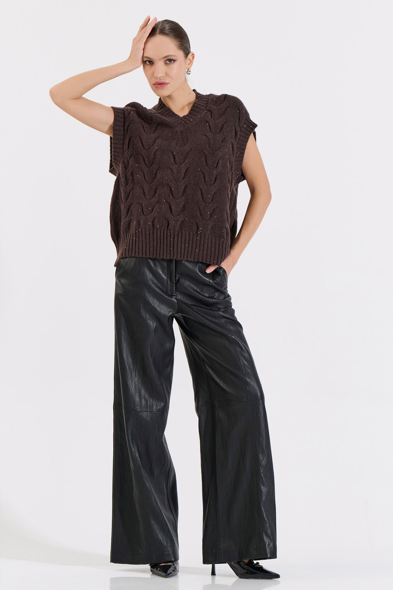 Elegant knitted vest featuring a V-neckline and textured knit pattern. Its relaxed fit combines comfort and modern style — perfect worn alone or layered over a shirt for a chic, effortless look.