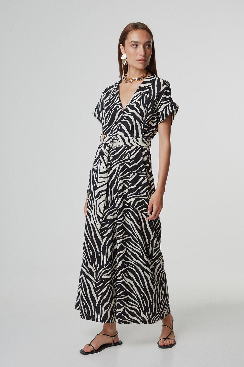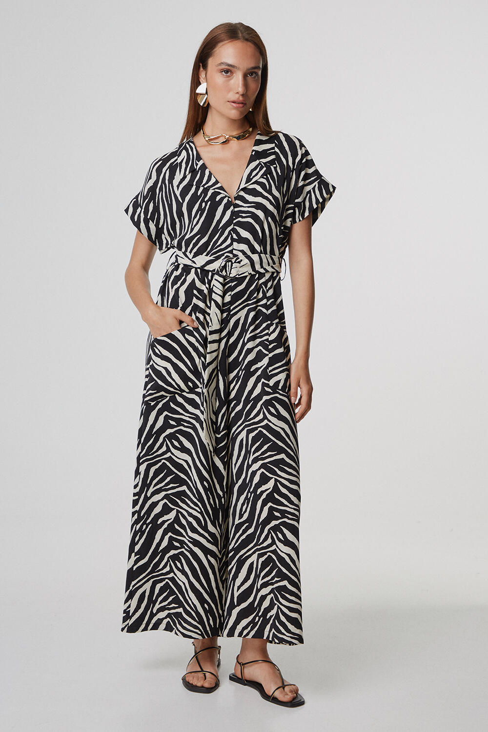 Animal print jumpsuit, front zip closure, collar trim, and front pockets. Detachable belt of the same pattern.