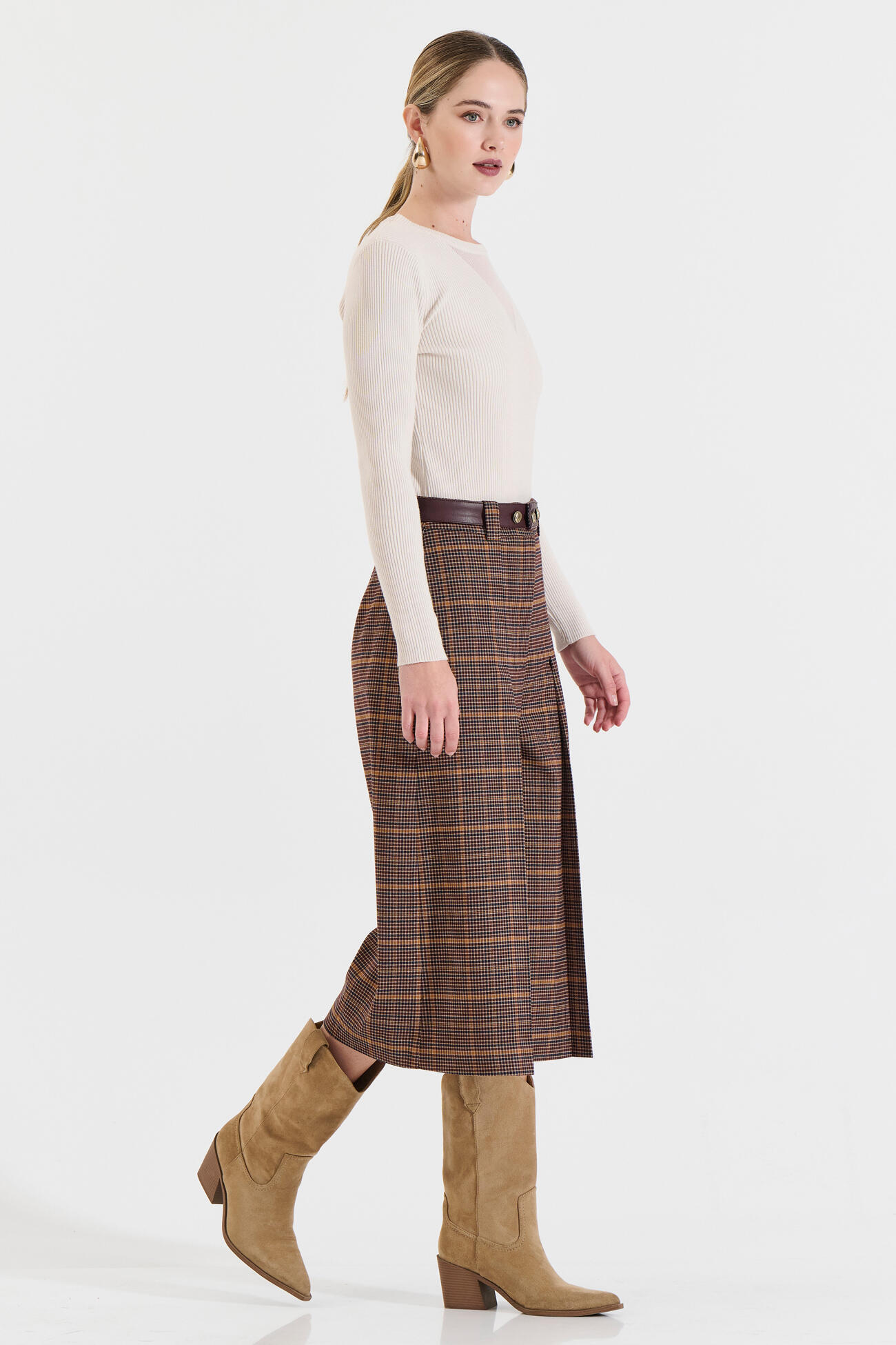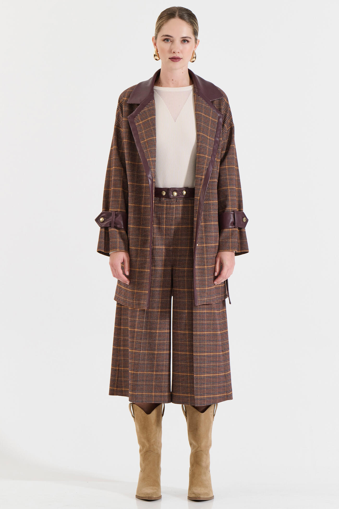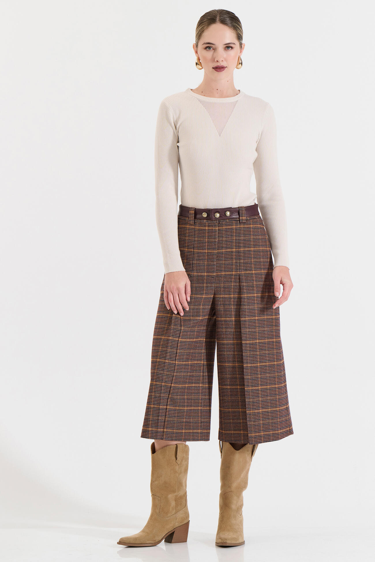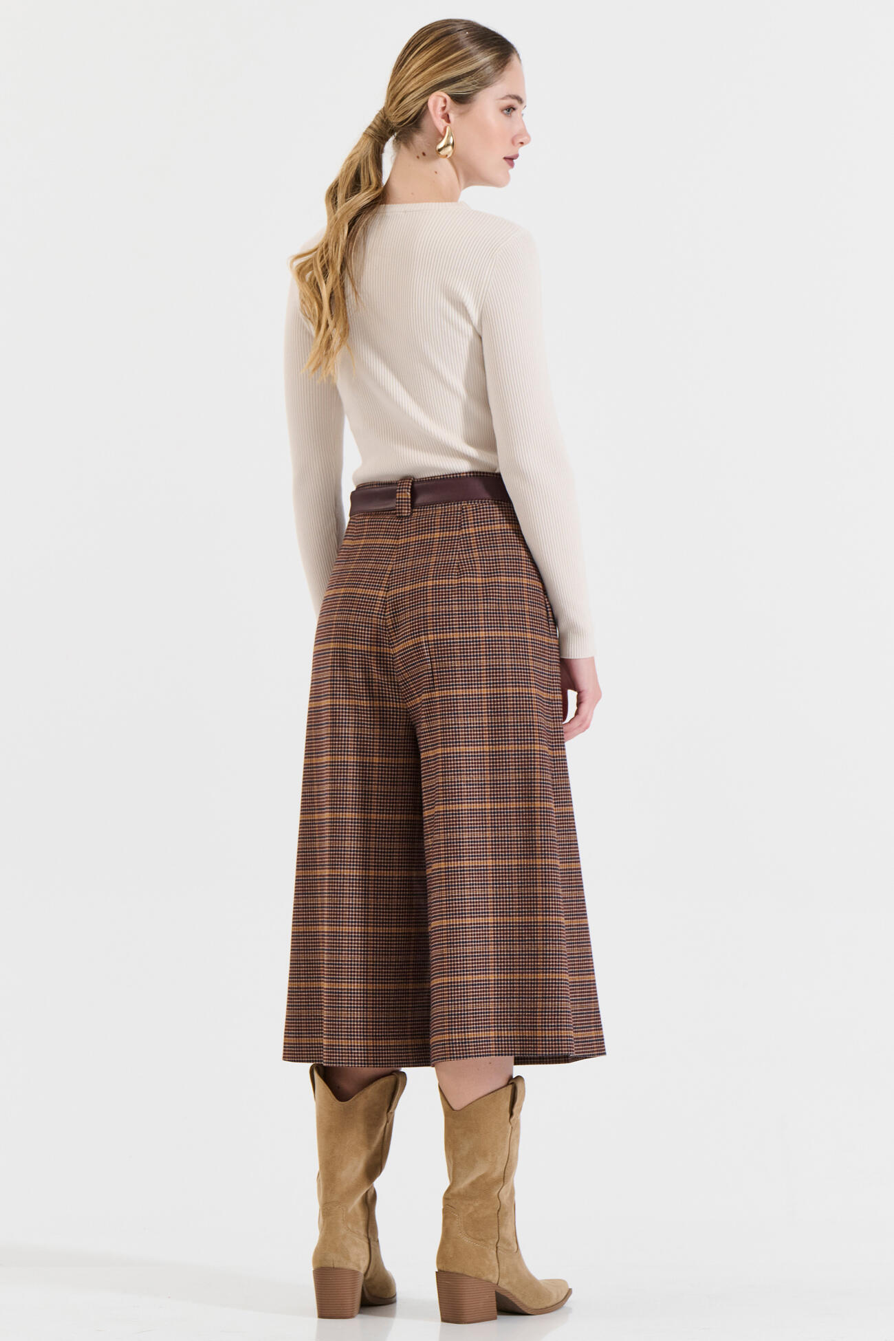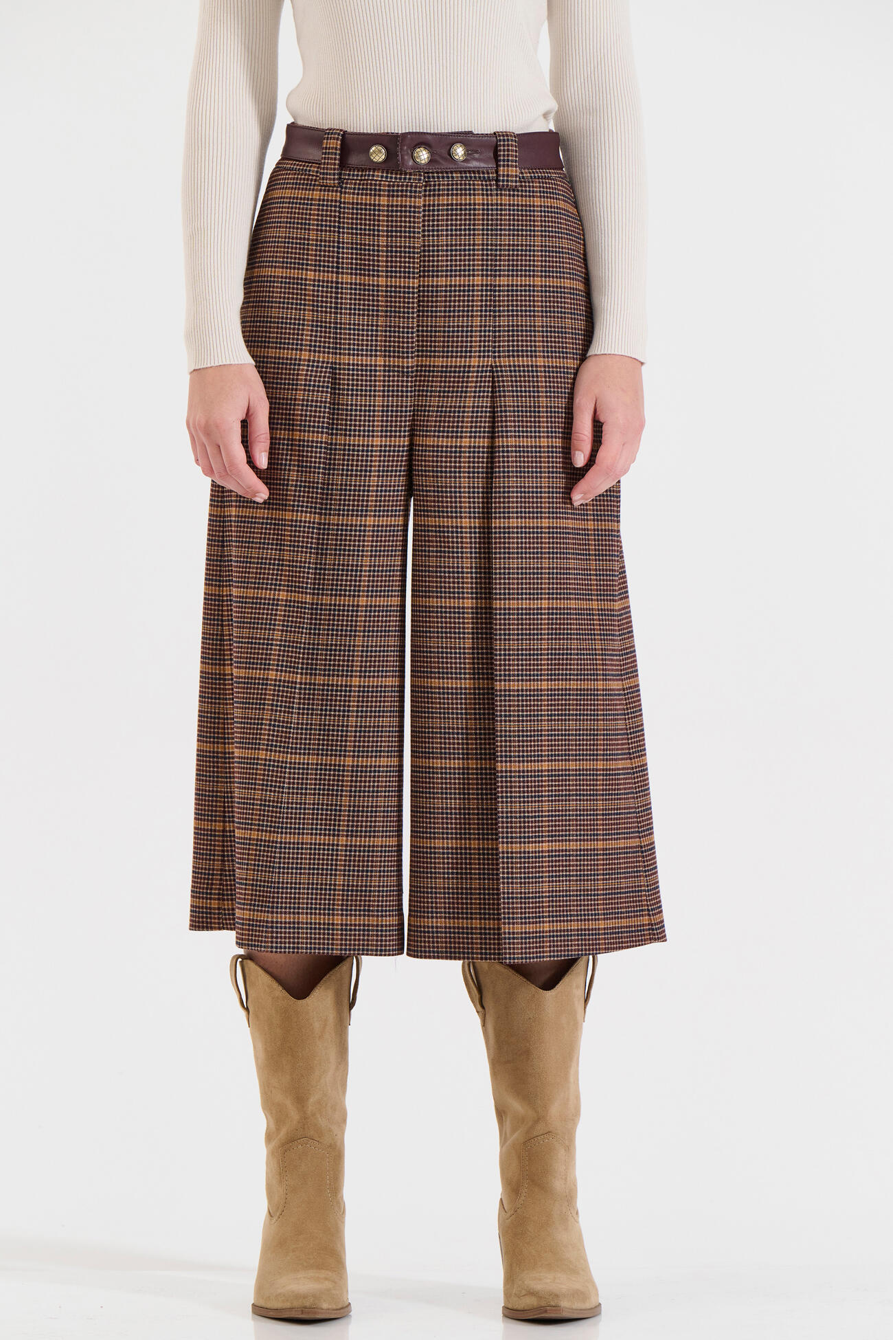 Modern checked culottes featuring a leatherette waistband with metallic buttons. Front pleats enhance the silhouette, while the cropped length adds a contemporary touch.