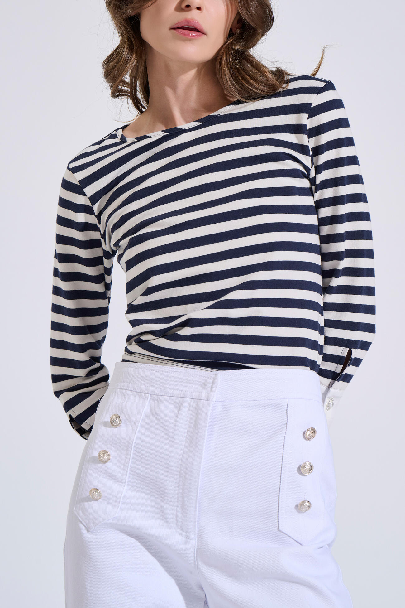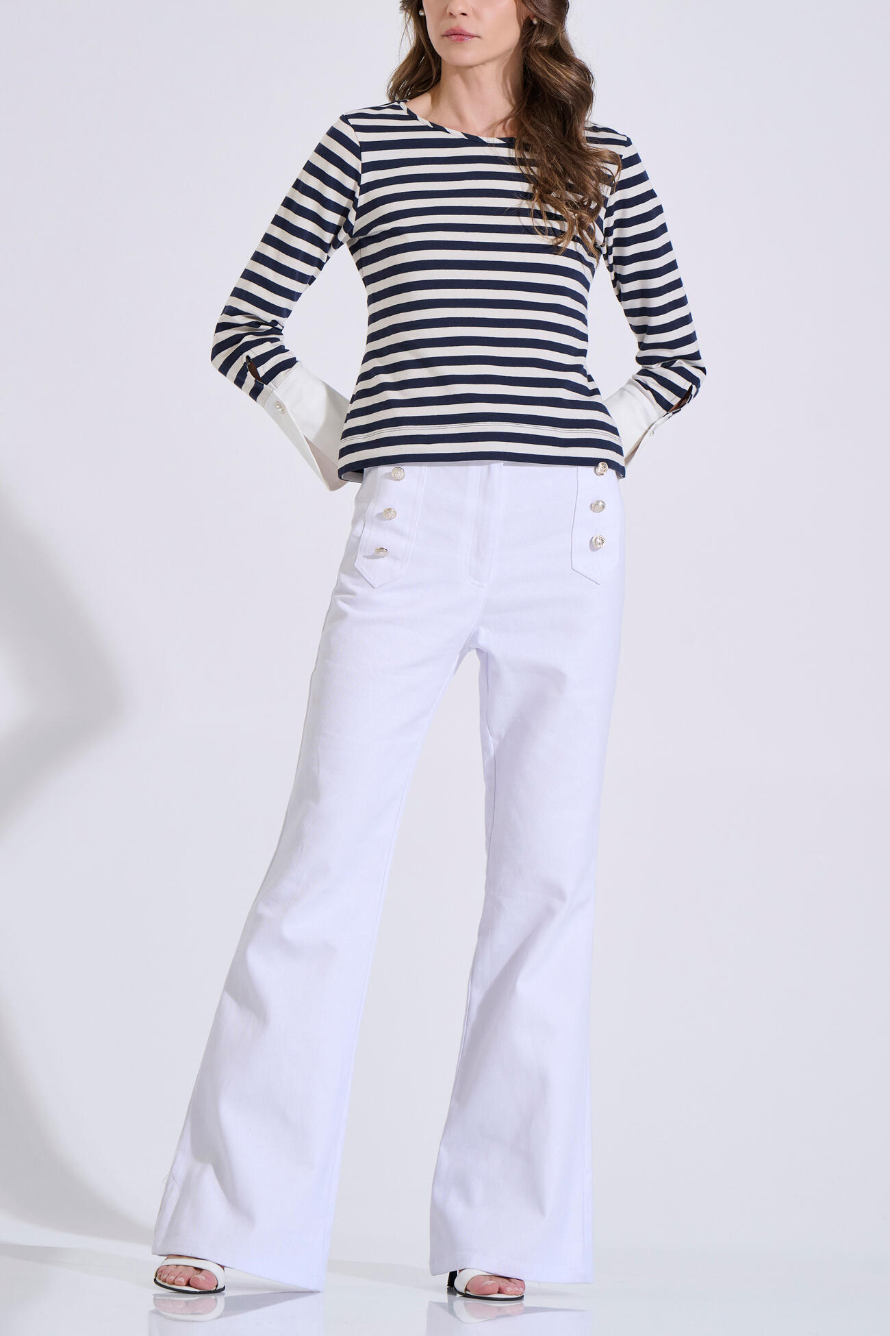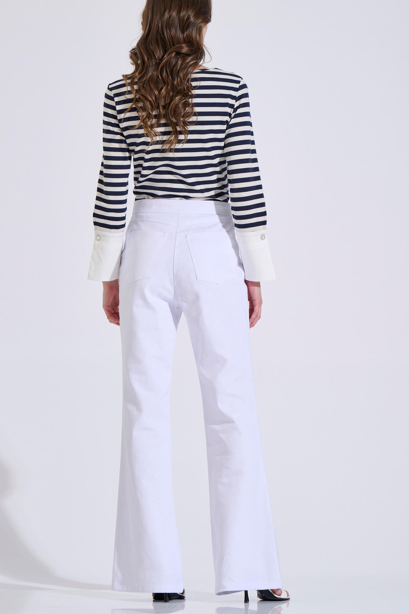 Cotton denim flared trousers featuring a front zip closure. Designed with decorative buttons at the front and back pockets.