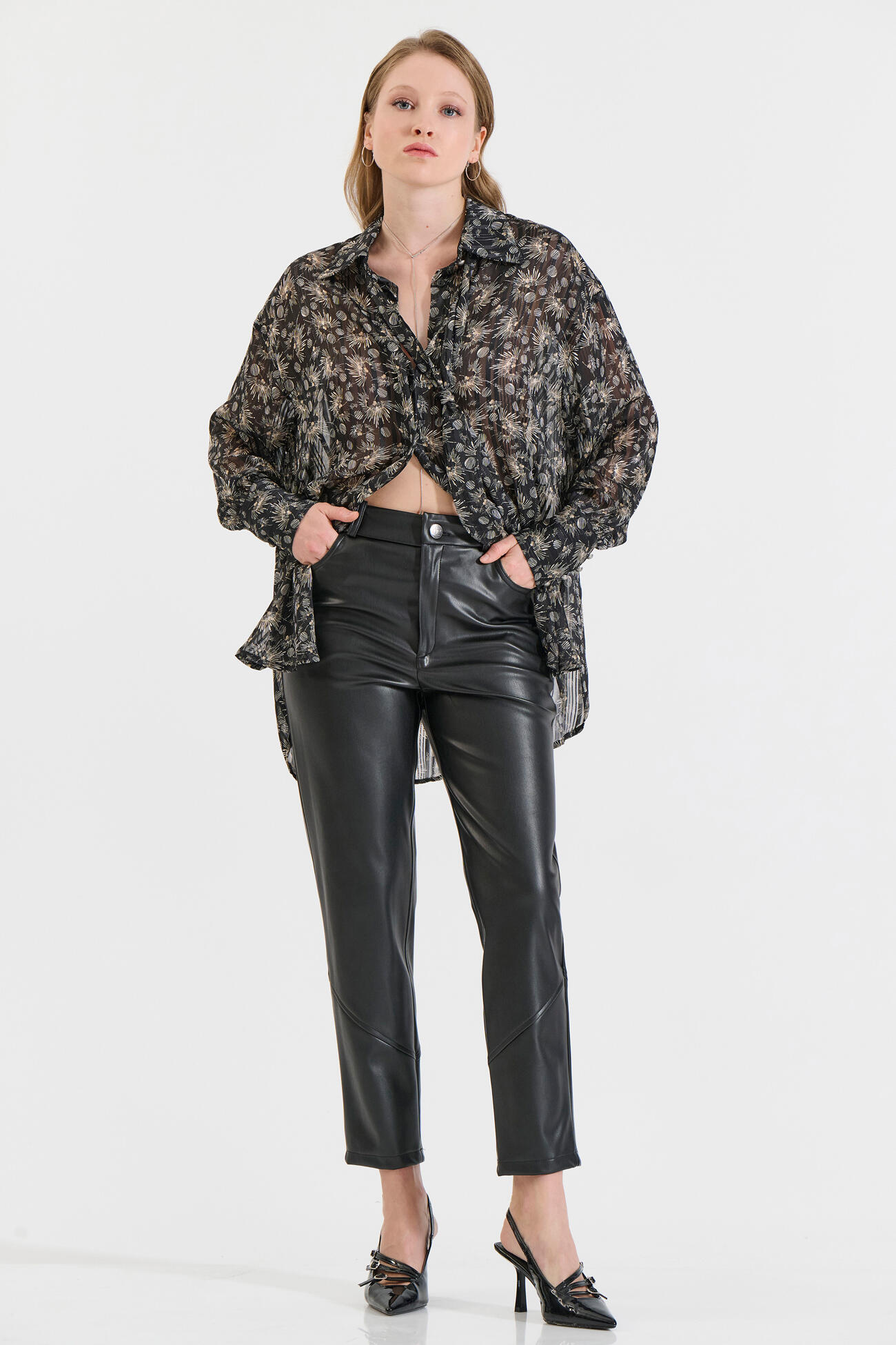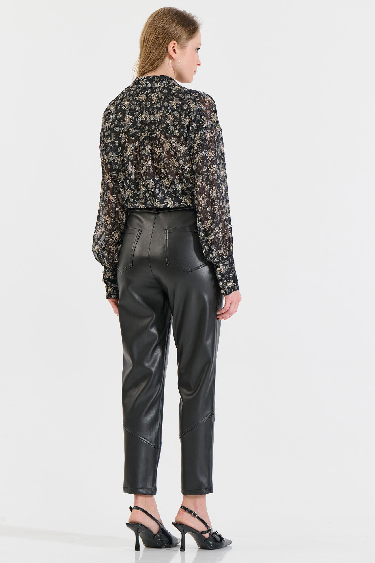 Stylish five-pocket pants made of soft faux leather that combine comfort with a modern aesthetic. Featuring a front button and zip closure, belt loops, and an elastic waistband at the back for a comfortable fit.