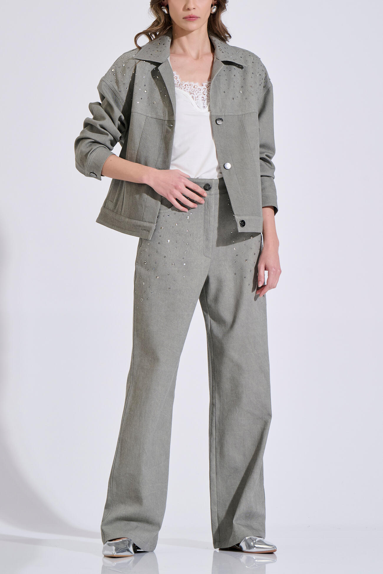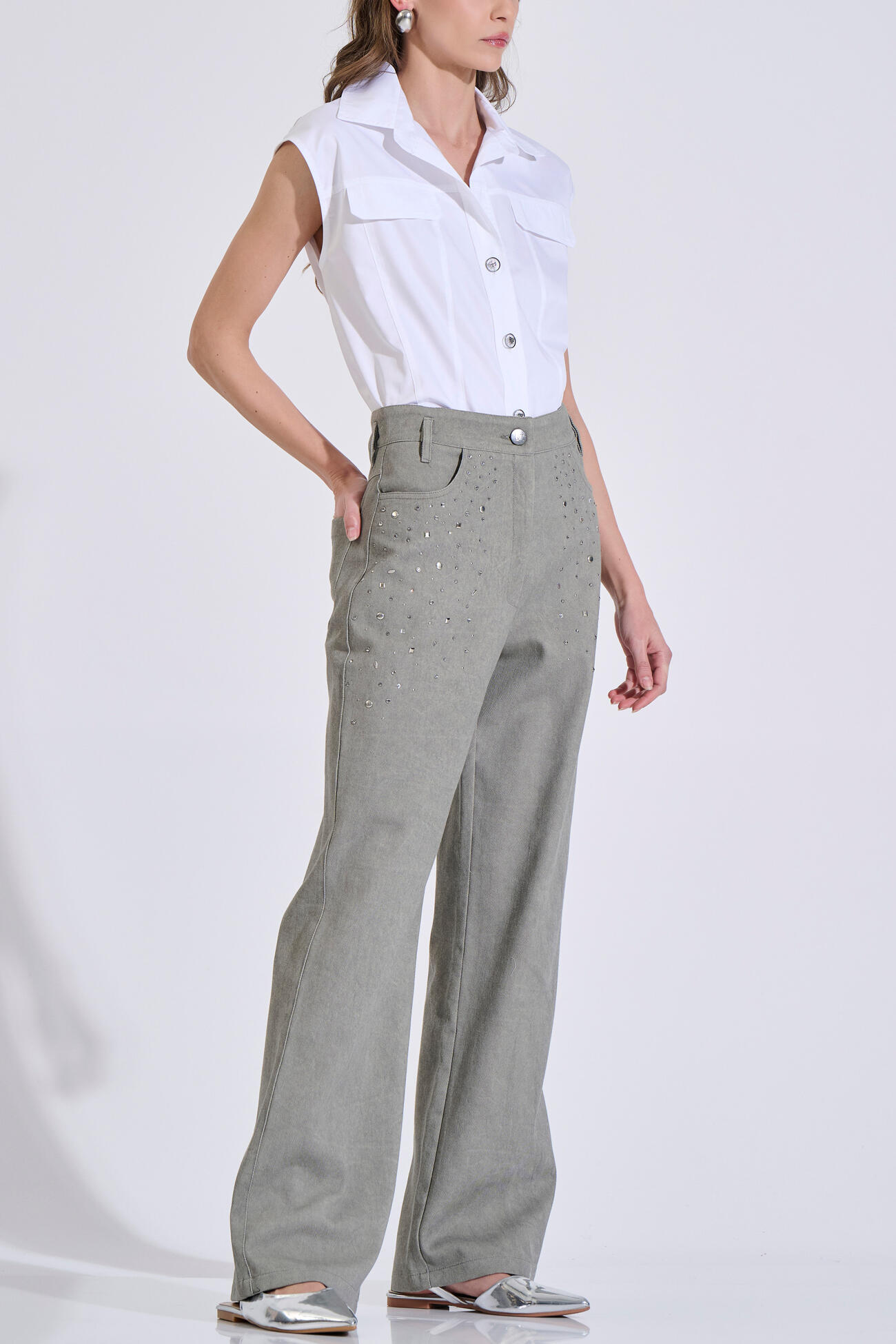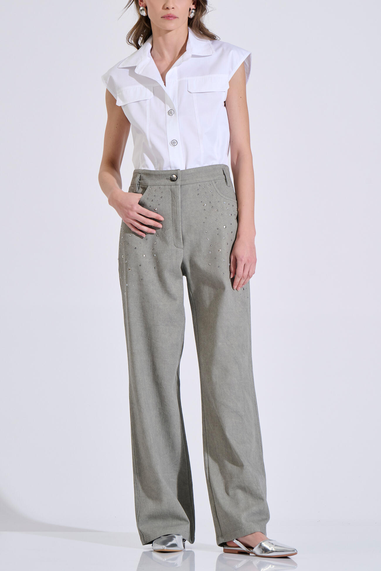 High-waisted cotton denim trousers featuring belt loops and front zip and button closure. Designed with front and back pockets and decorated with rhinestones and studs on the upper part. Pairs perfectly with the jacket 10-200184-0 for a complete set.