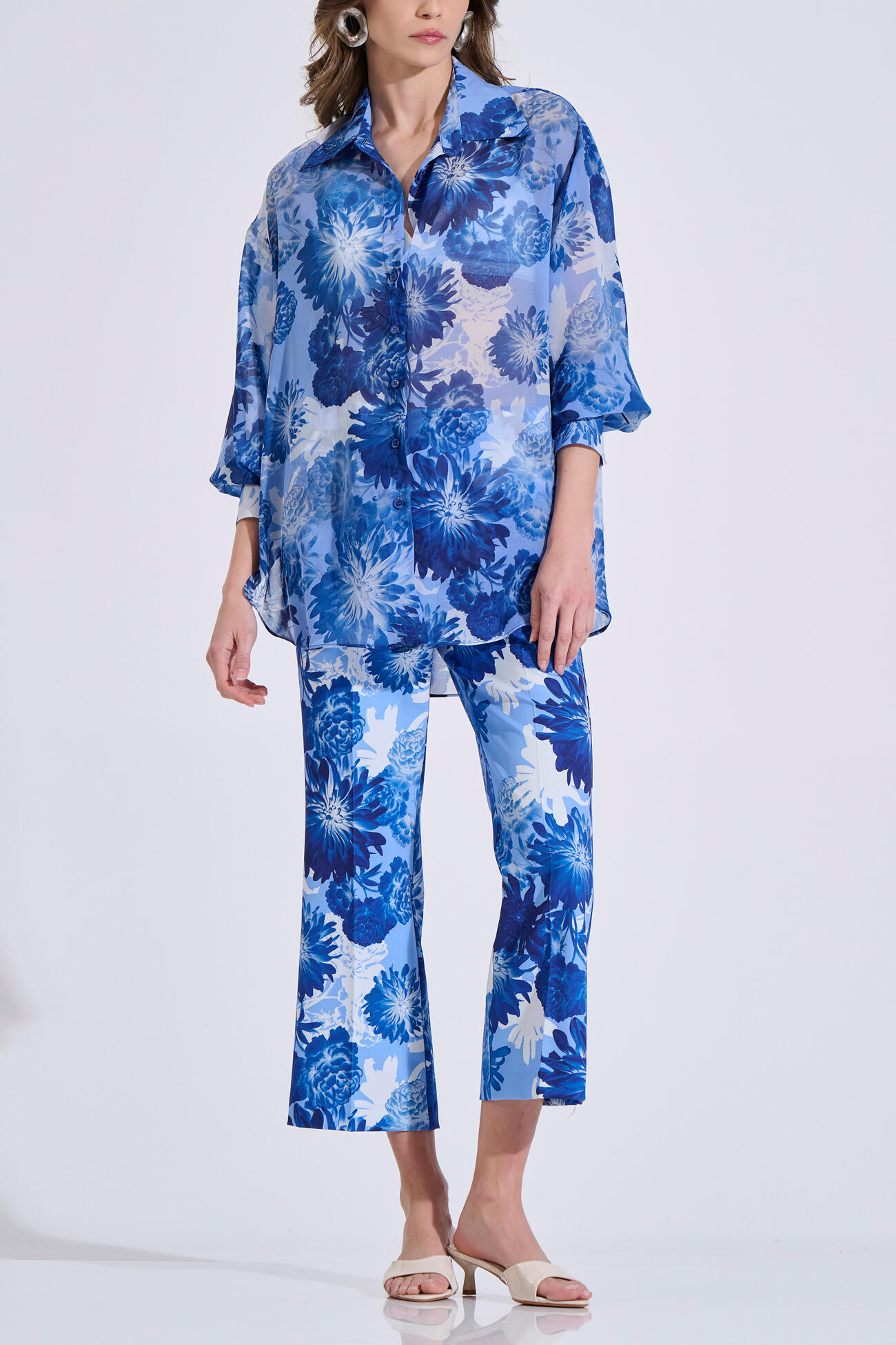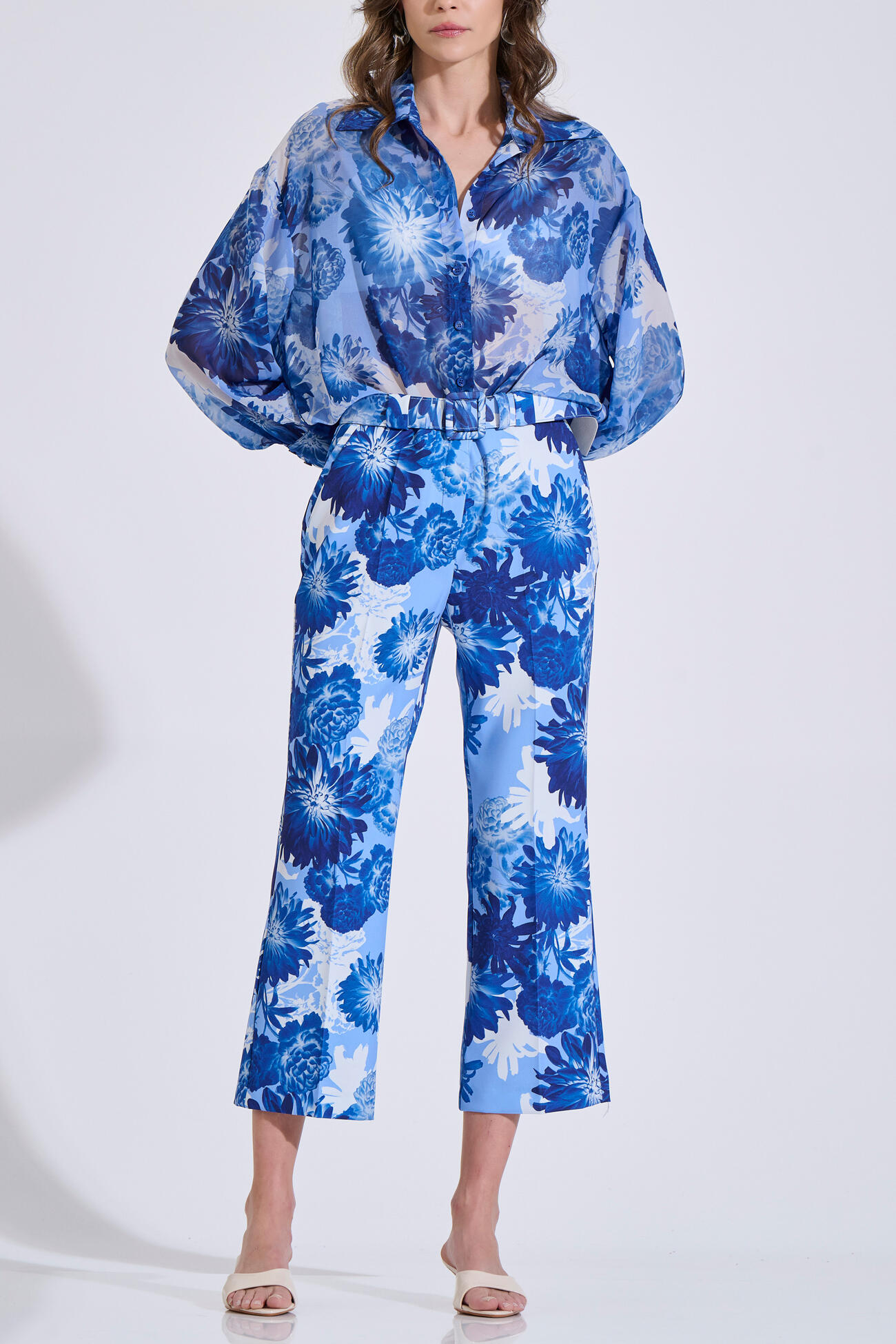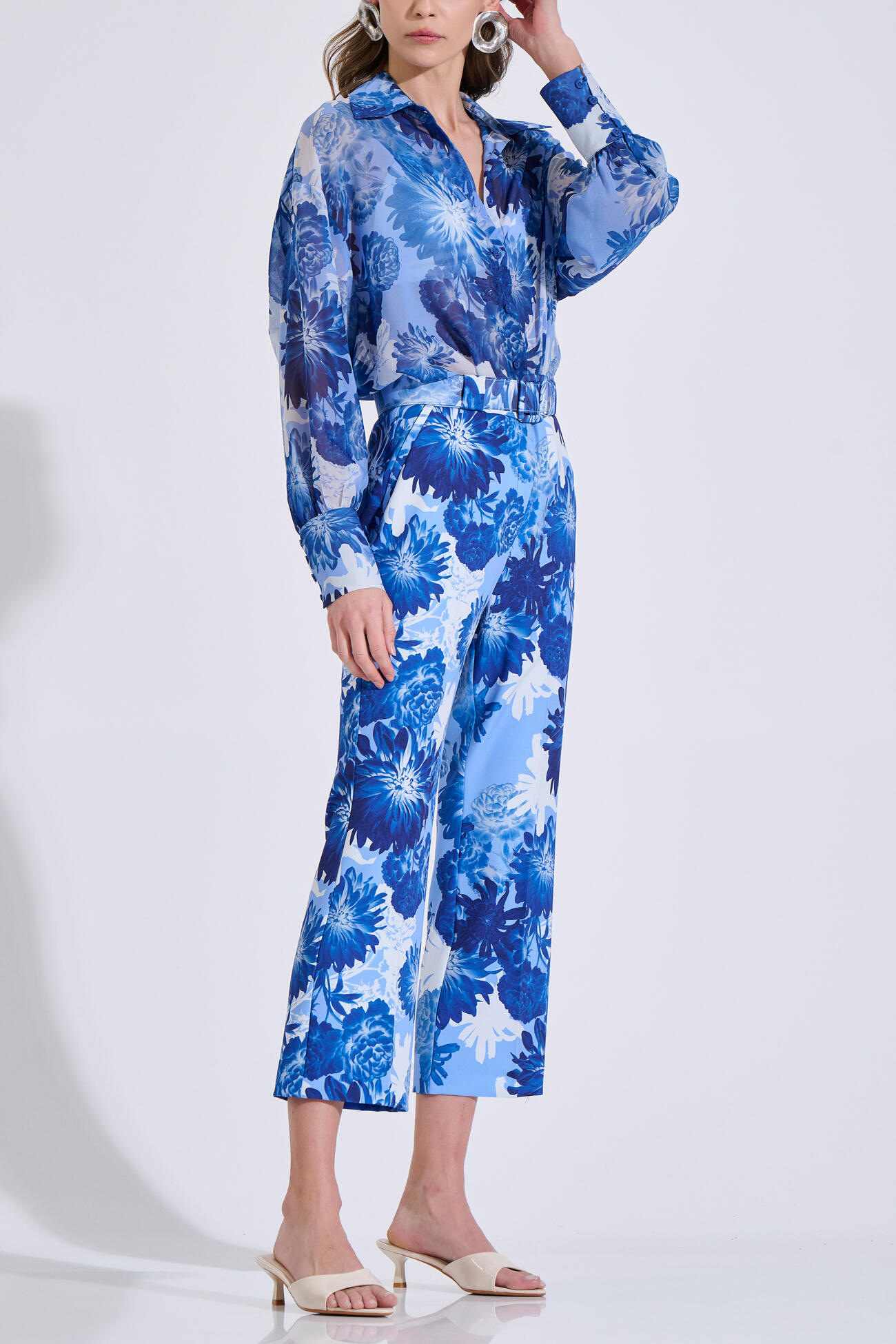 Printed cropped pants featuring a striking floral pattern. Designed with a front zip and button closure, belt loops, and a flattering silhouette. Wear them on their own or pair them with the matching vest 10-342492-0 and shirt 10-342486-0 for a complete set.