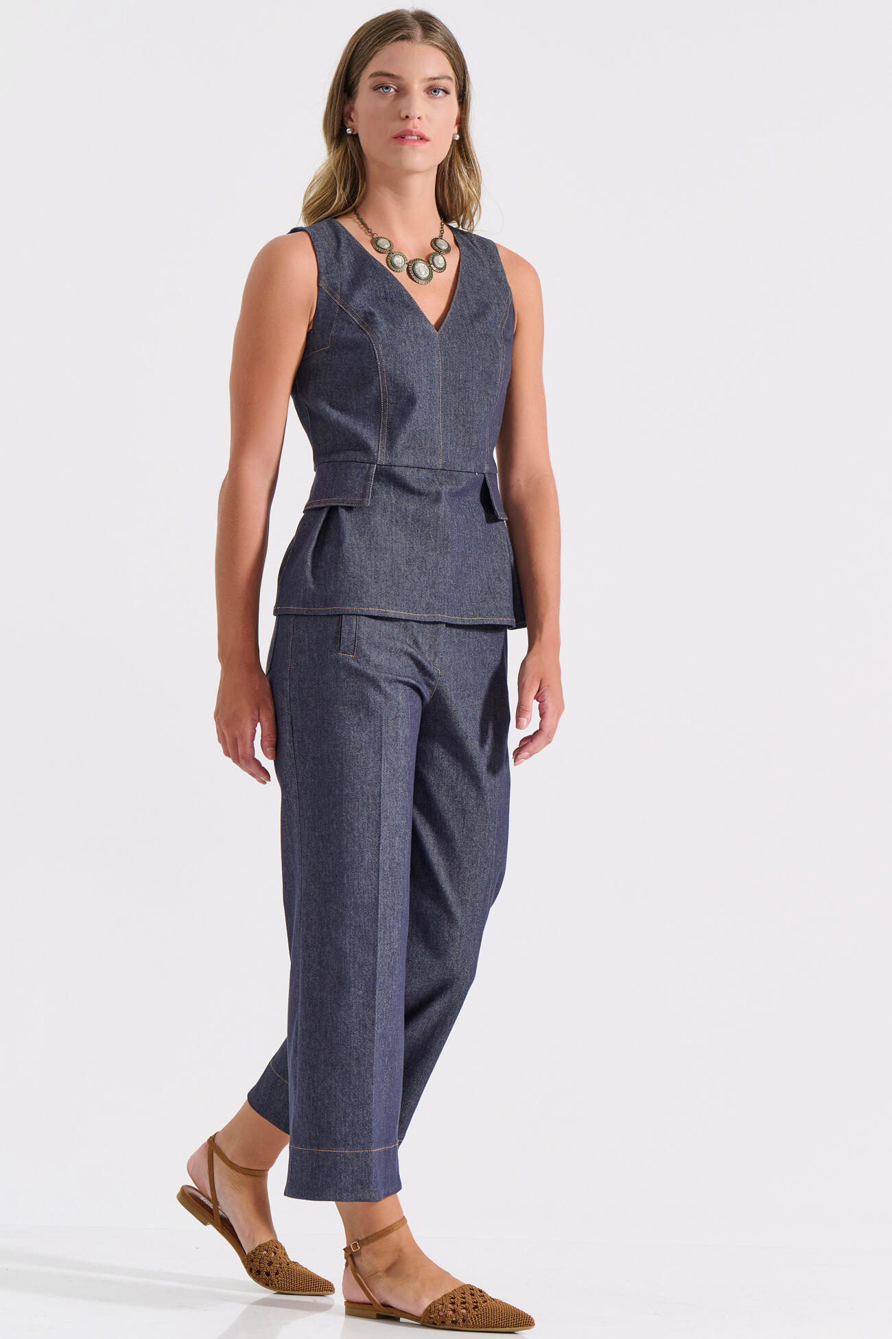 Straight-leg cropped trousers crafted from stretch cotton denim, featuring decorative turn-ups and subtle topstitching that follows the leg’s silhouette. Pair it with matching sleeveless top 10-200171-0 for a standout total look that blends structured elegance with contemporary appeal.