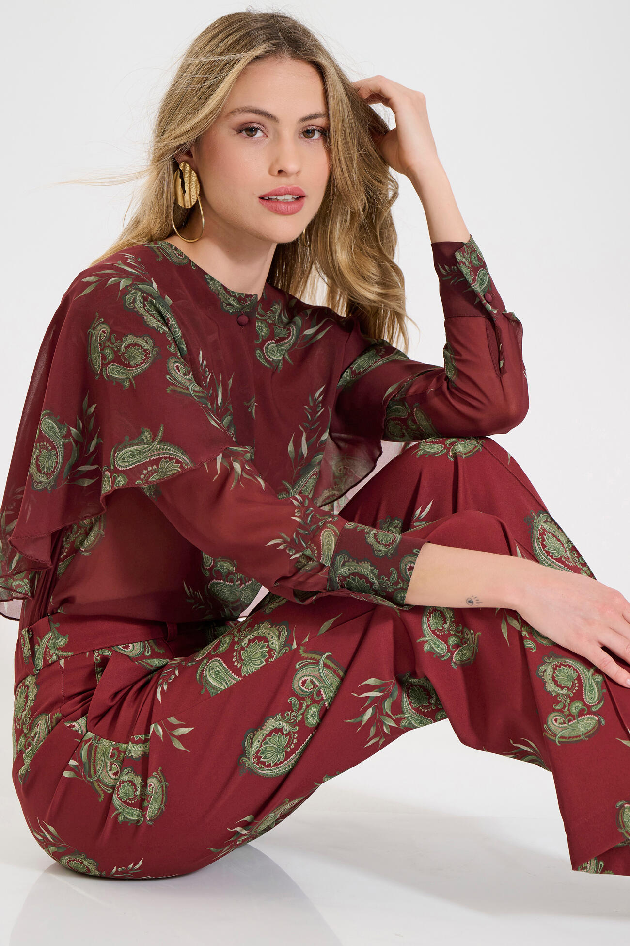 Shirt with a subtle sheer finish and paisley pattern. The design stands out with a lightweight cape detail that drapes over the shoulders, adding movement and a distinctive character. It pairs harmoniously with the matching trousers 10-342416-0 to create a complete and striking ensemble of refined aesthetics.