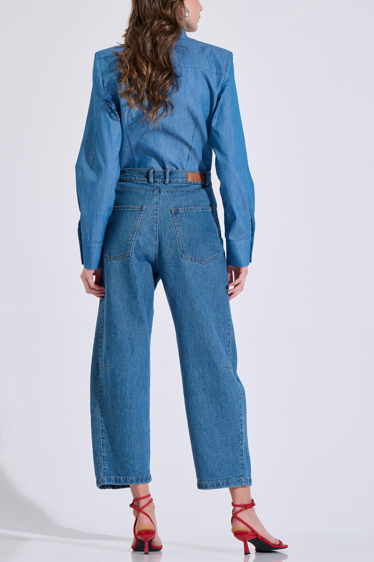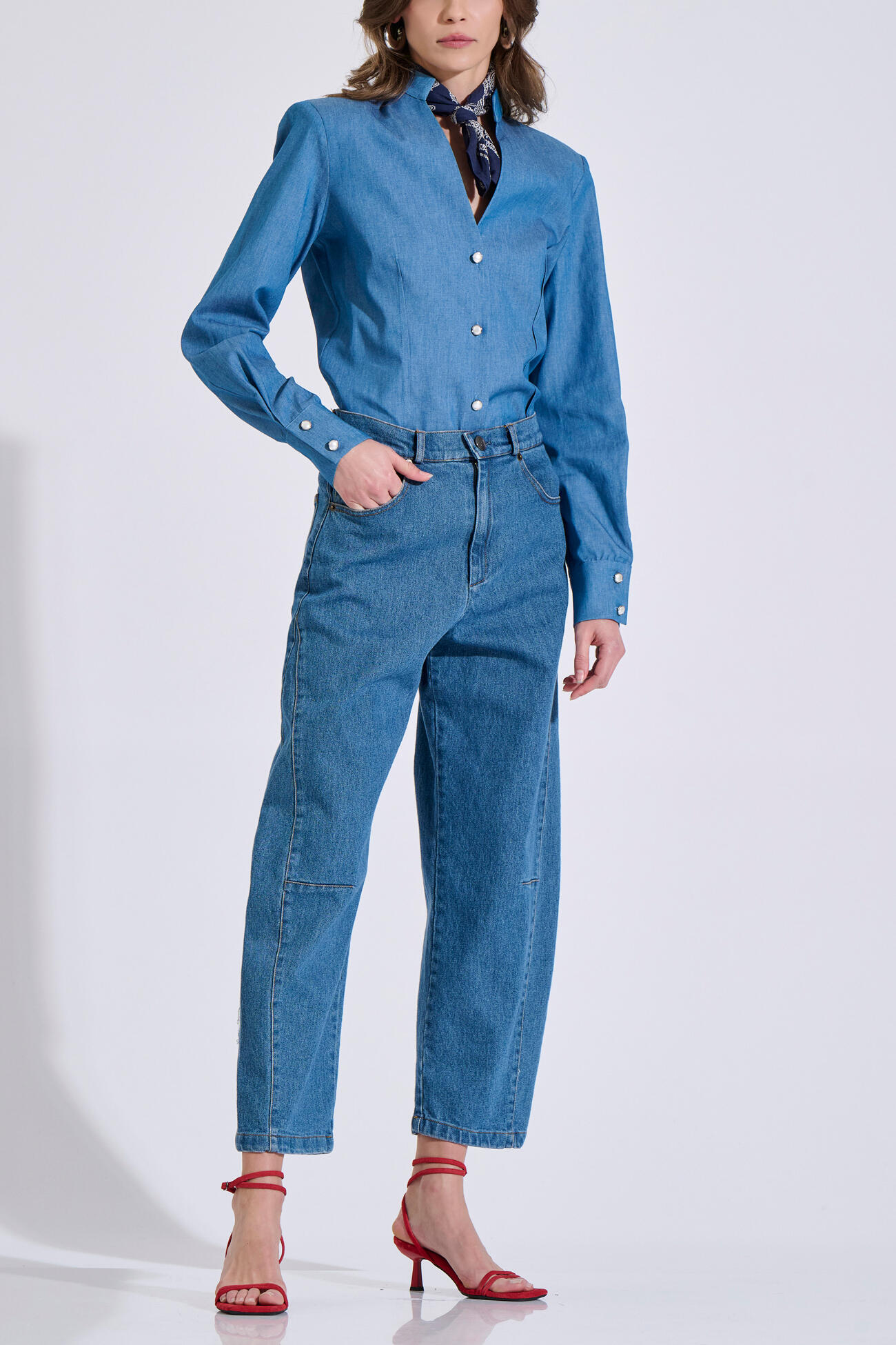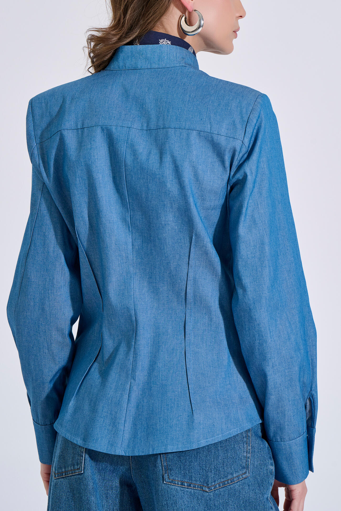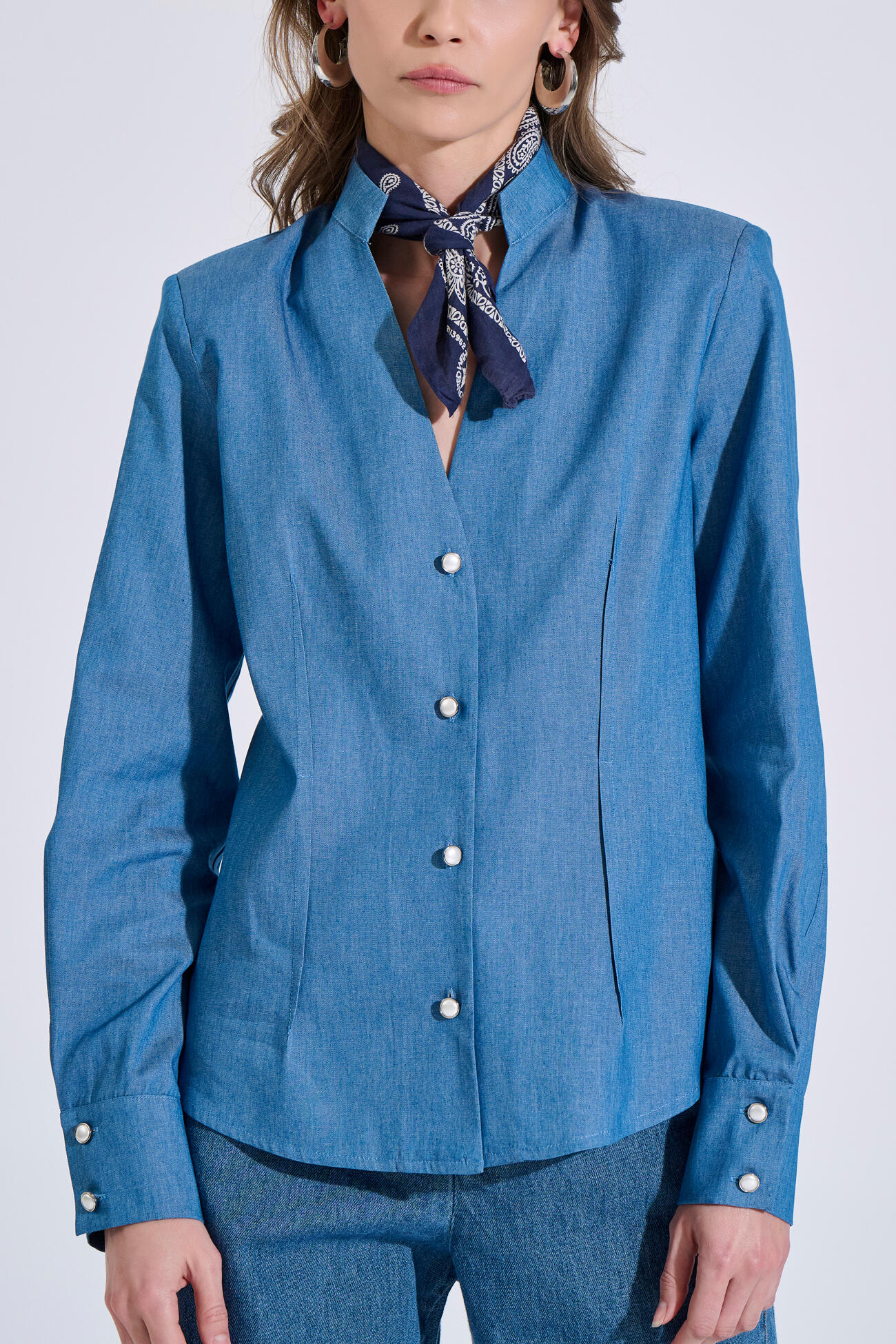 Cotton shirt in a denim-look fabric, designed in a slim fit that subtly enhances the silhouette. It features an elegant mao collar, structured shoulder pads, and front fastening with decorative buttons.