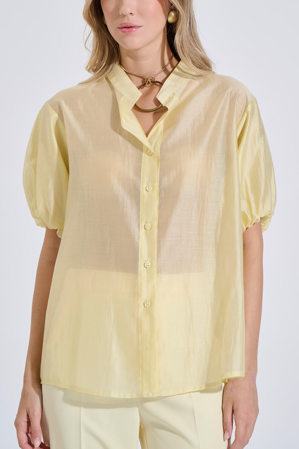 Lyocell shirt in a lightweight, semi-sheer texture. Features a Mao collar and front button closure. The short balloon sleeves add a modern feel, while the gathered detail at the back enhances comfort and movement.