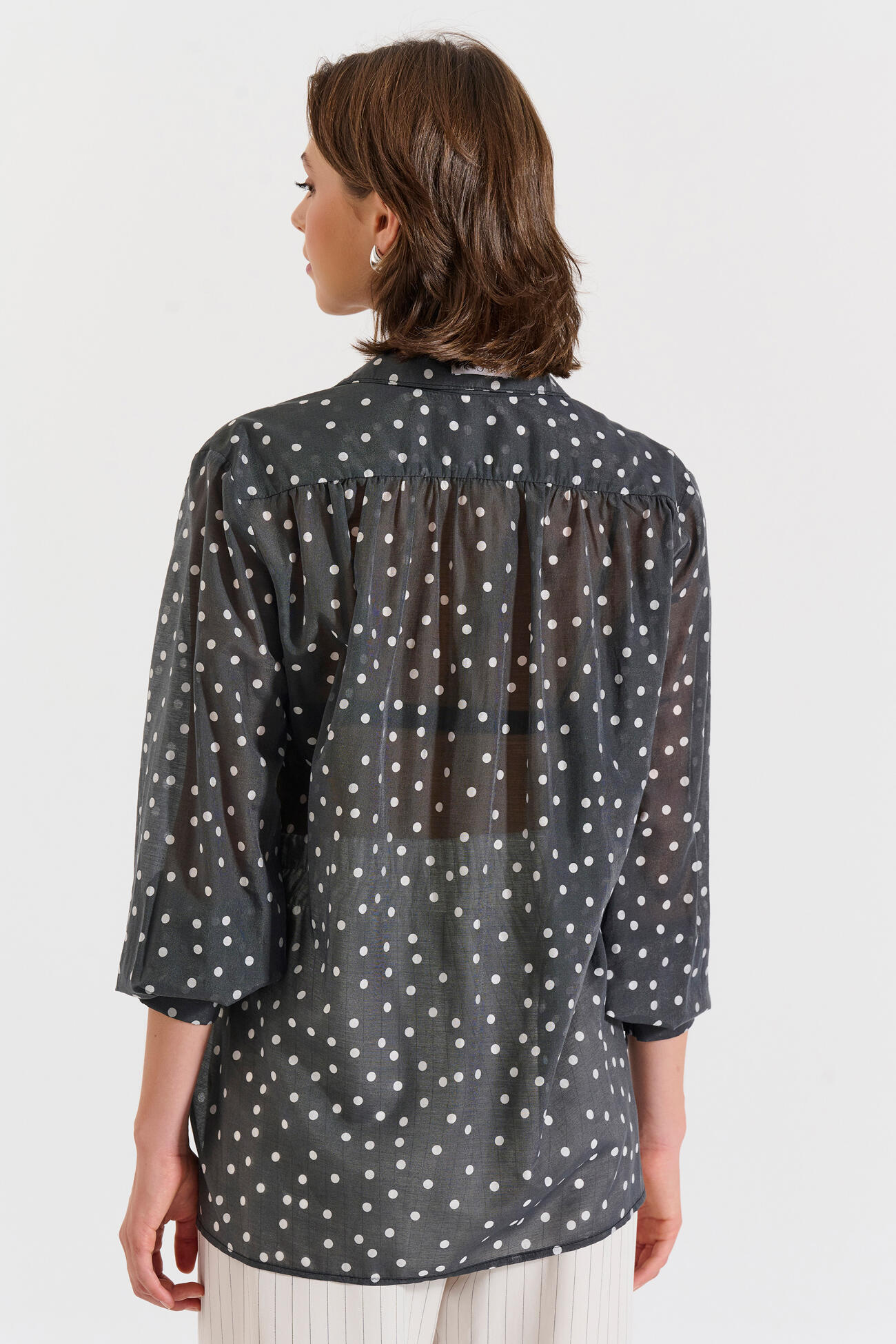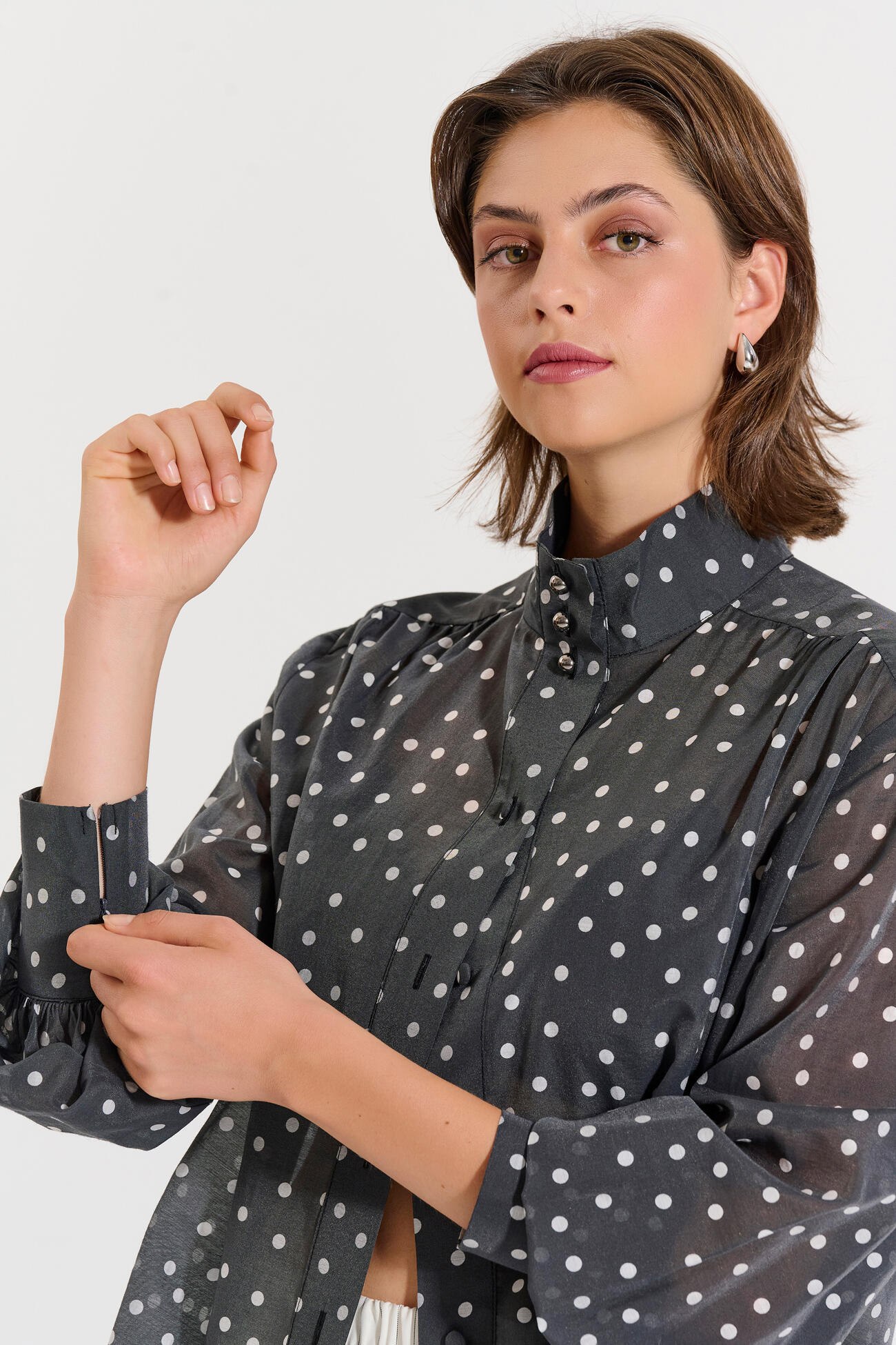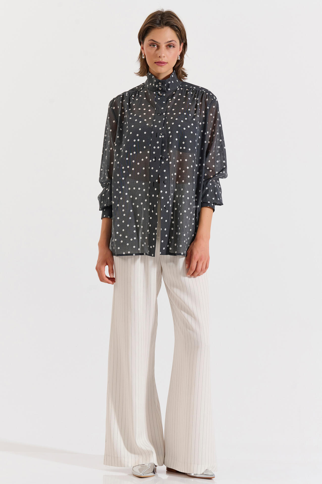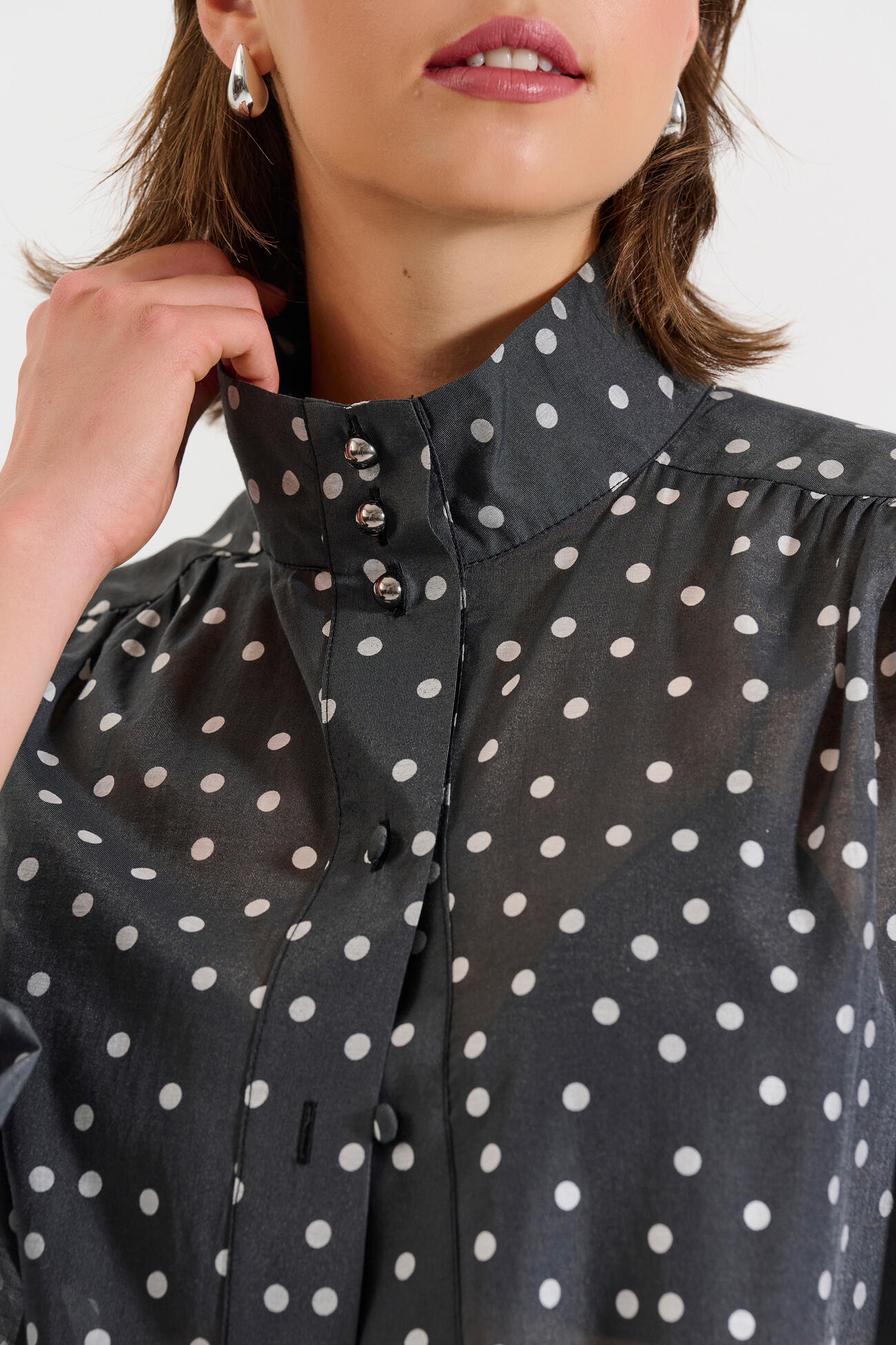 Lightweight blouse featuring a polka-dot print, stand collar, and front button fastening. Its relaxed fit and long cuffs make it perfect for elegant looks from day to night.